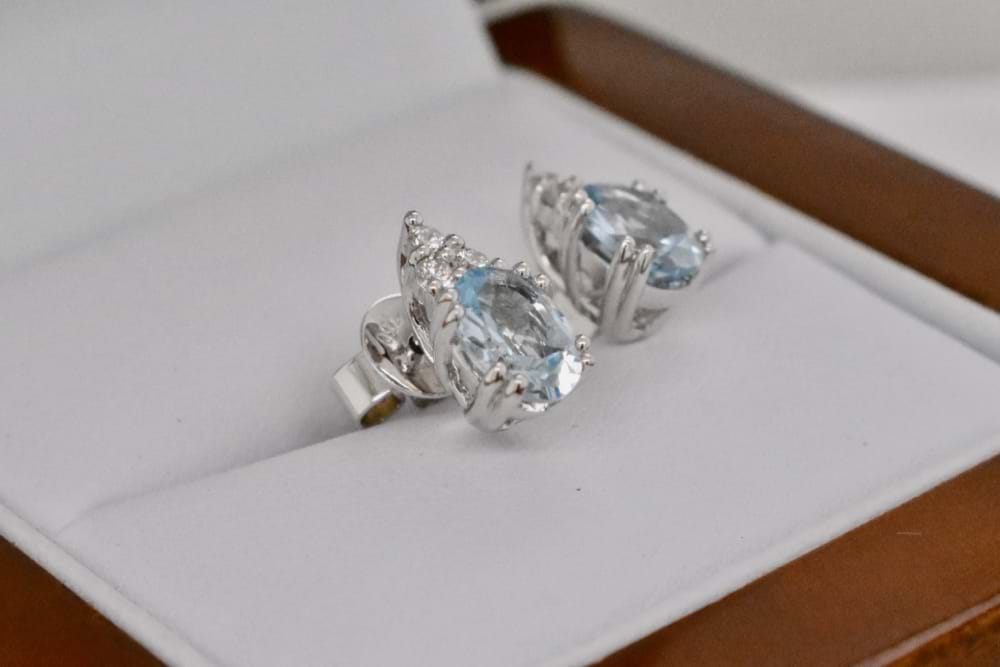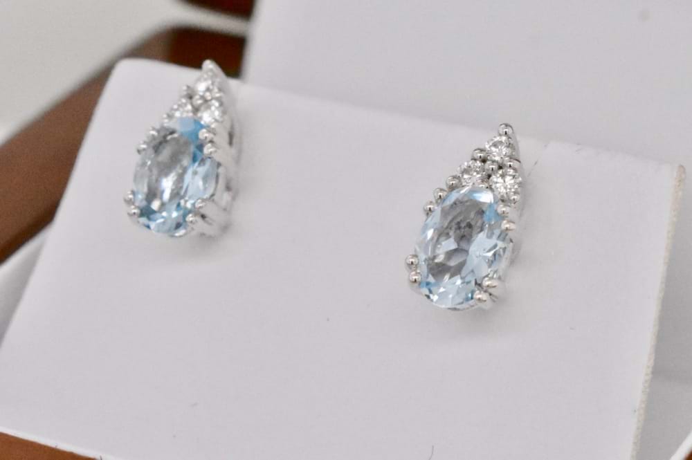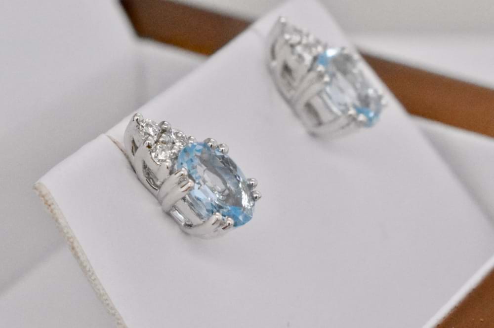 Stunning 18ct white gold stud earrings each featuring a, double claw set, oval aquamarine with a cluster of three round diamonds seated at the top of each. The two aquamarines total 1.34cts and the diamonds equal 0.16cts. Independent Valuation Supplied