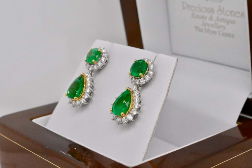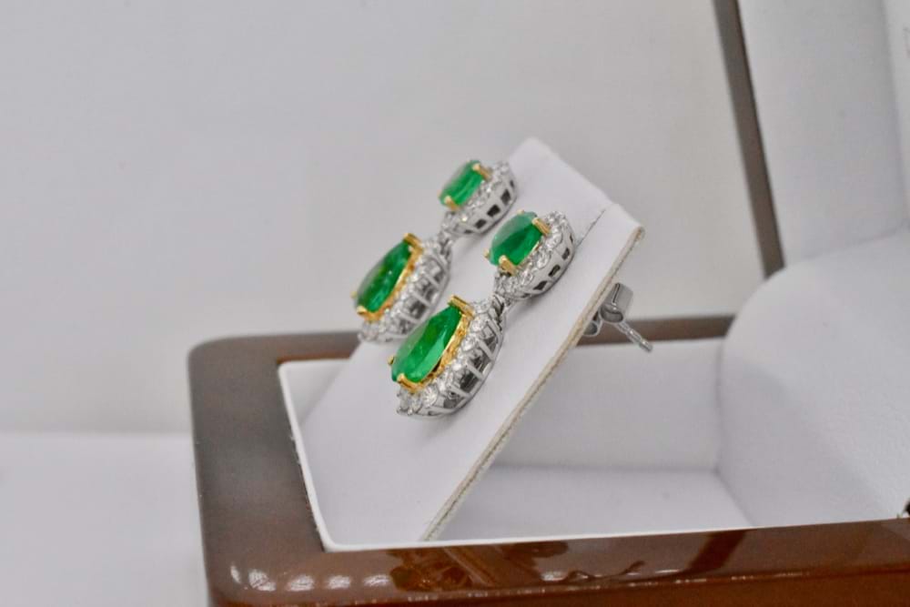 These exceptional, natural, emeralds have been designed into elegant cluster drops crafted in 18ct white gold. The two round emeralds feature a single surround of shimmering diamonds as the stud fitting with a pearshape emerald in a halo suspended from the stud. Total emerald content equals 3.35cts and total diamond content equals 0.84cts. Independent Valuation Supplied