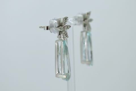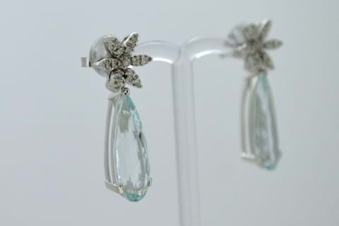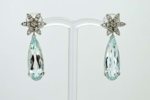 Spectacular, Italian made, Aquamarine & Diamond Drop Earrings. Beautifully crafted in 18ct white gold these diamond flower studs have a combined total of 0.20cts and suspended from each flower an elongated, facted, teardrop aquamarine. The two aquamarines total an amazing 9.32cts and have been set to showcase their light blue colour. Independent Valuation Supplied. Matching pendant available for separate purchase