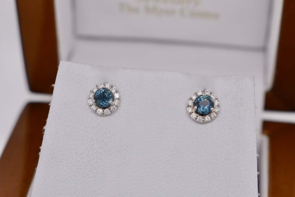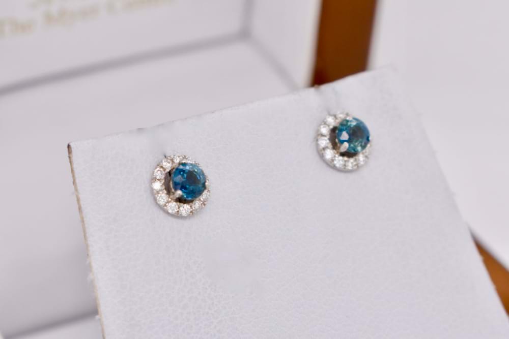 These Australian blue sapphires total 0.46cts and have been set into a simple four claw setting with a halo of glistening round brilliant cut diamonds totaling 0.16cts in 18ct white gold. Independent Valuation Supplied