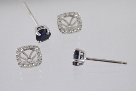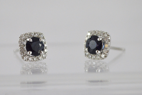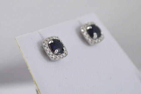 18ct white gold four claw studs featuring dark blue Australian sapphires totalling 0.90cts, paired with these removable cushion shape diamond surrounds totalling 0.27cts these earrings instantly transform from everyday studs to stunning evening wear. Independent Valuations Supplied