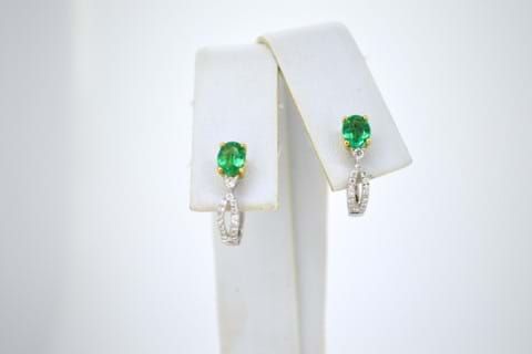 With a total of 0.61cts of natural emerald set into yellow gold and an 18ct white gold diamond set twist design half hoop totalling 0.12cts these earrings sit beautifully on the ear. Independent Valuation Supplied.