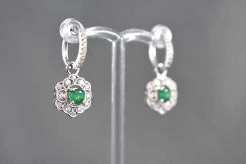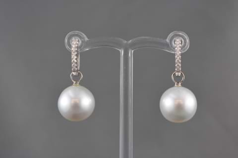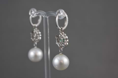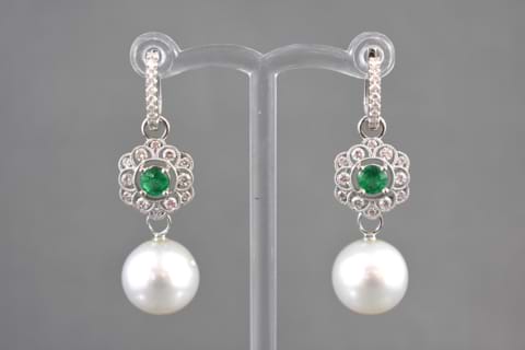 Amazing versatility! Eye catching and incredibly stunning 18ct white gold drop earrings with two separate enhancer components and the ability to be worn four different ways! Suspended from simple and classic diamond huggies containing 0.18cts of diamonds, the emerald enhancers contain two emeralds totaling 0.73cts and 0.64cts of diamonds with a cats tail fitting on the back allowing a secondary earring pendant to be hung from them. The final drop features two white Australian south sea pearls measuring 12.5-13mm. All components are available for separate purchase and together create a striking and versatile pair of earrings that can continue to be built on in the future. Independent Valuation Supplied