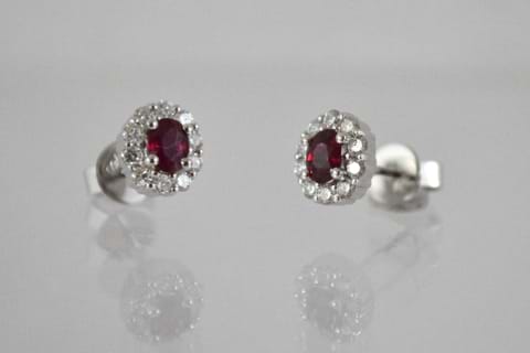 These 18ct white gold studs feature two natural Rubies totalling 0.41cts with 10 sparkling round brilliant cut diamonds surrounding each stone totalling 0.30ct in a cluster design studs. Independent Valuation Supplied