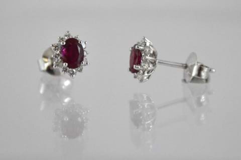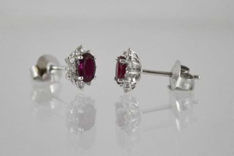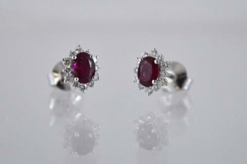 With an oval cut natural ruby surrounded by 12 round brilliant cut diamonds in each earring, these 18ct white gold studs are both striking and elegant. The two rubies total 0.65cts and total diamond content equals 0.20cts