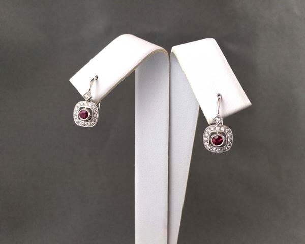 These Deco style earrings are 9ct white gold with two natural Rubies totalling 0.26cts and surrounded by 34 Diamonds totalling 0.16cts. Independent Valuation supplied.