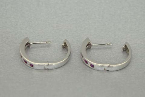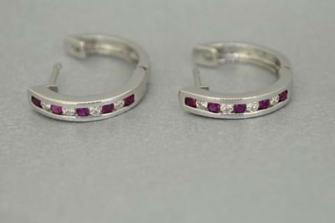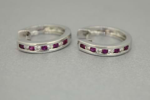18ct white gold channel set round red rubies alternately set with white glistening diamonds in a huggie style earring. With a total of 10 rubies totaling 0.19cts and eight diamonds totaling 0.12cts these simple and understated huggies are a beautiful gift for someone who appreciates delicate and pretty jewellery. Independent Valuation Supplied