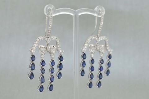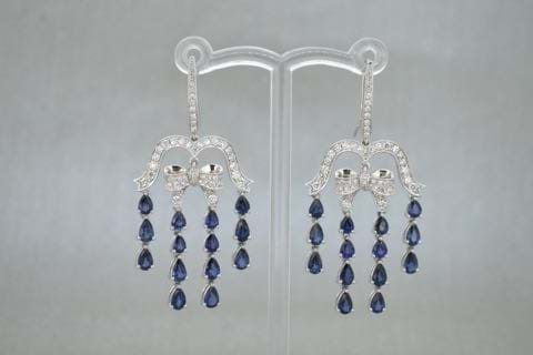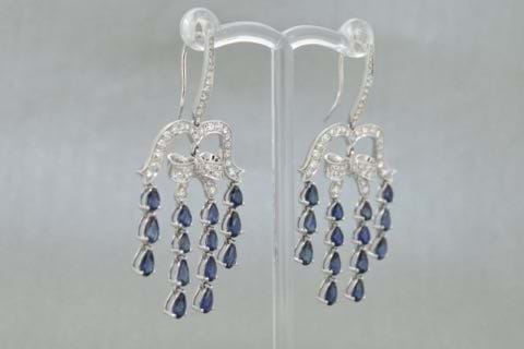 With each earring featuring four long drops of blue Australian sapphires suspended from diamond set shepherd hook fittings with a pretty diamond set wave and bow design. Crafted in 18ct white gold they have a combined total of 28 sapphires equaling 5.74cts and 108 diamonds equaling 1.29cts. Independent Valuation Supplied