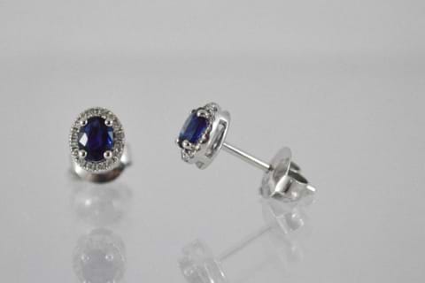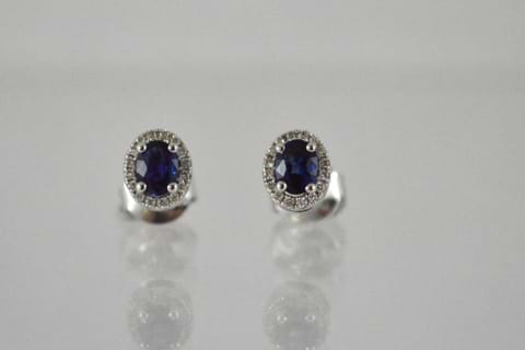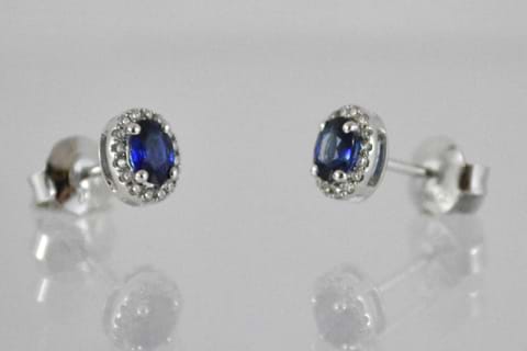 Striking natural blue sapphires with a single surround of shimmering diamonds in 18ct white gold studs. Two sapphires equal 0.14cts and 32 diamonds equal 0.08cts.