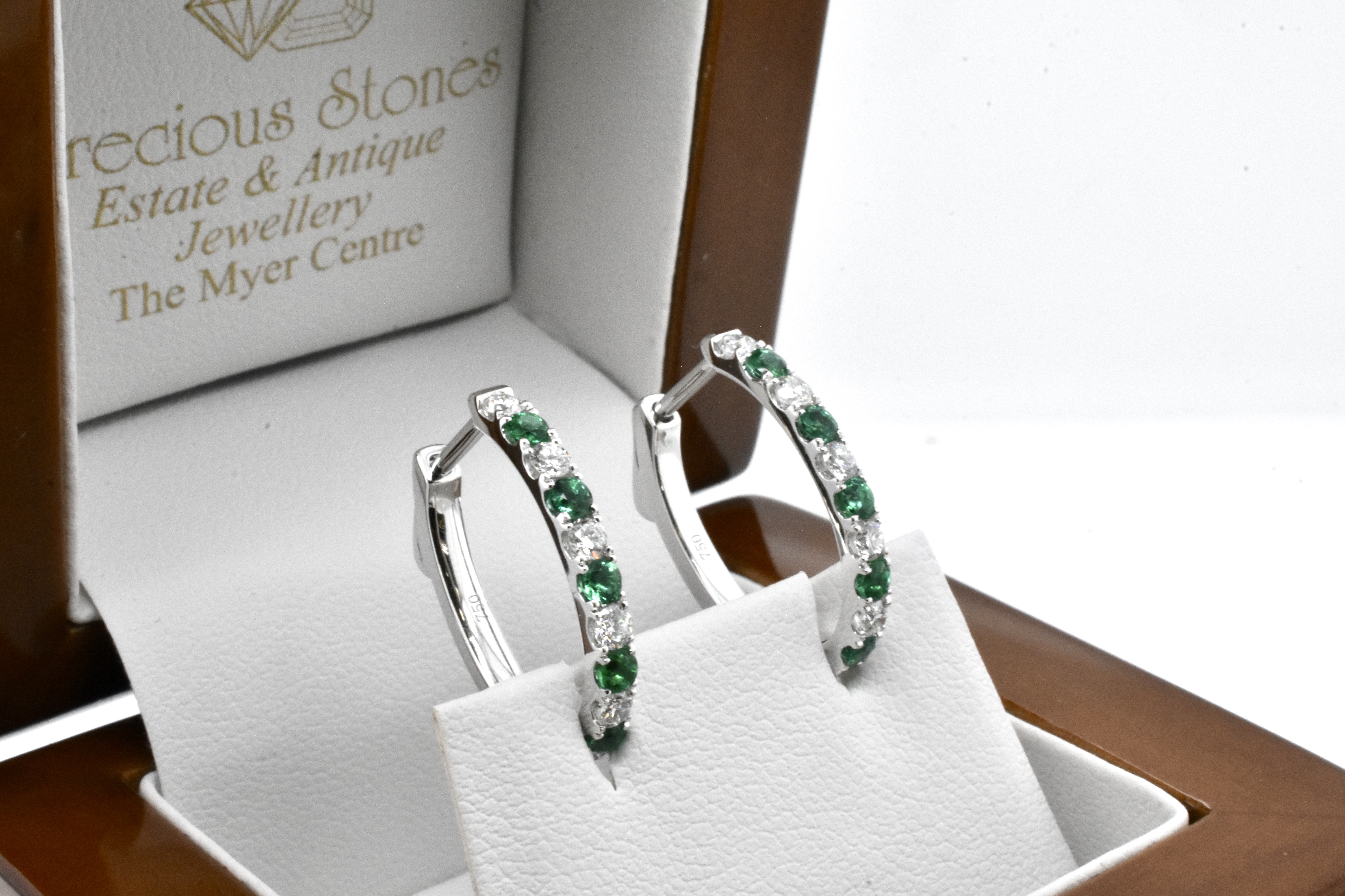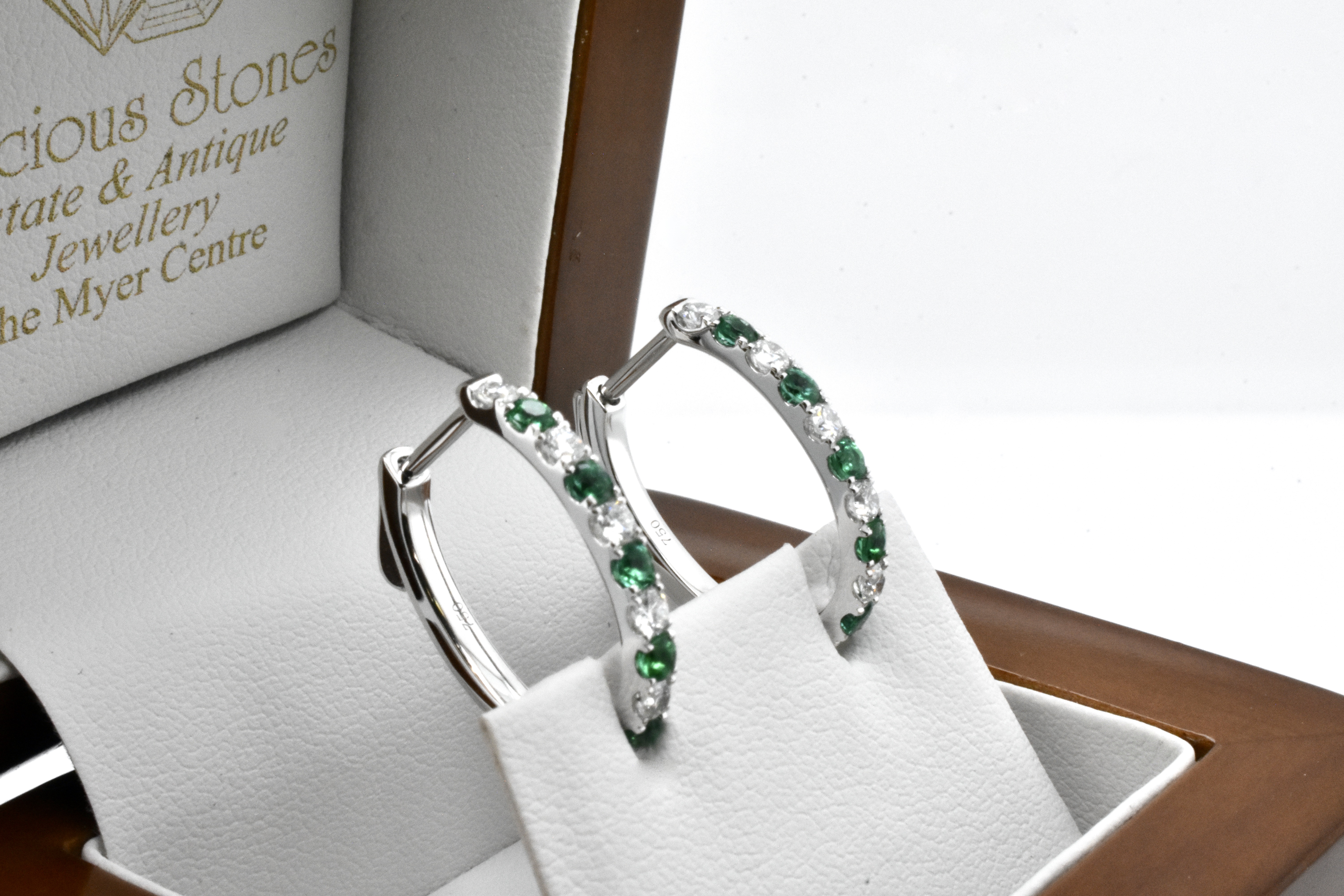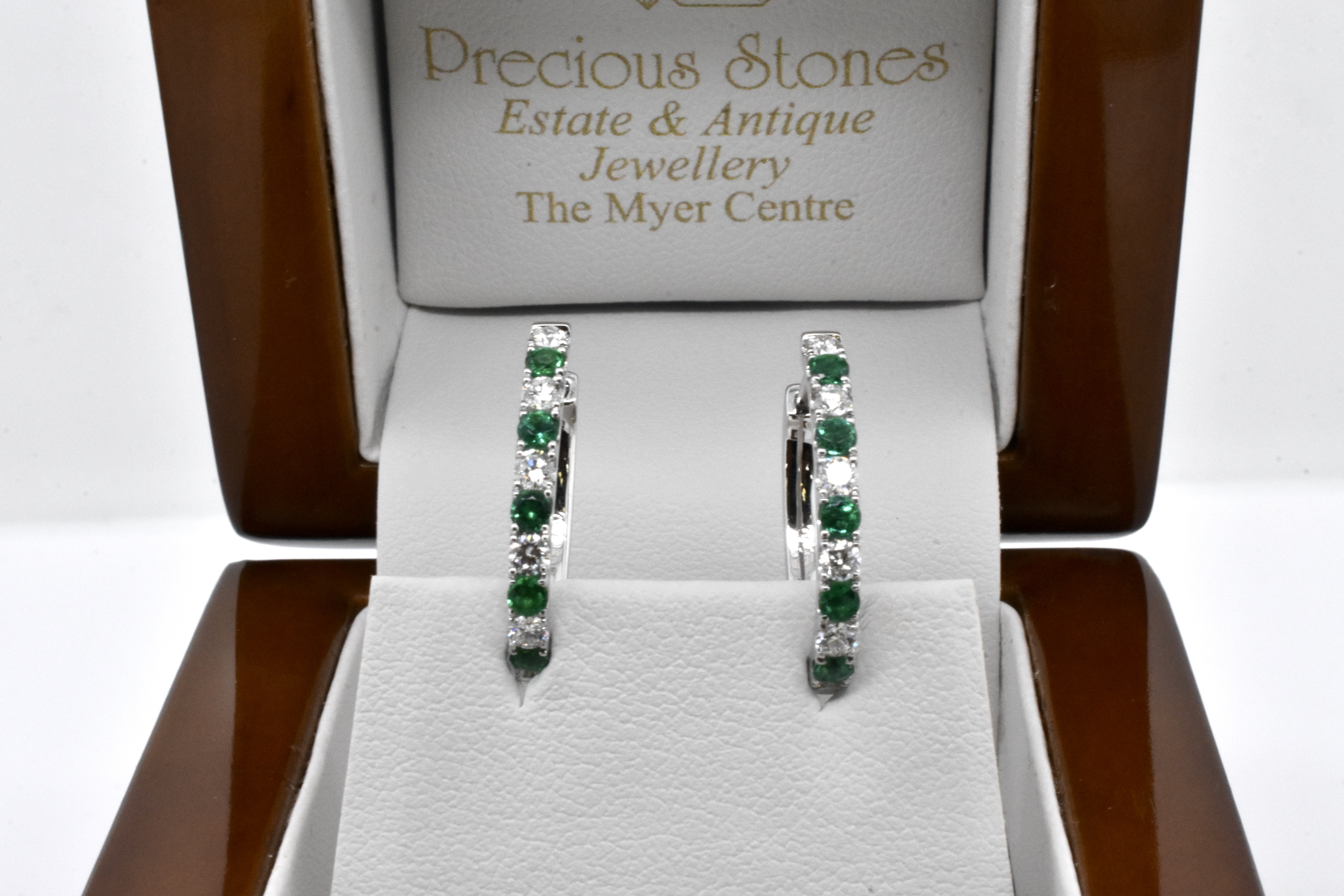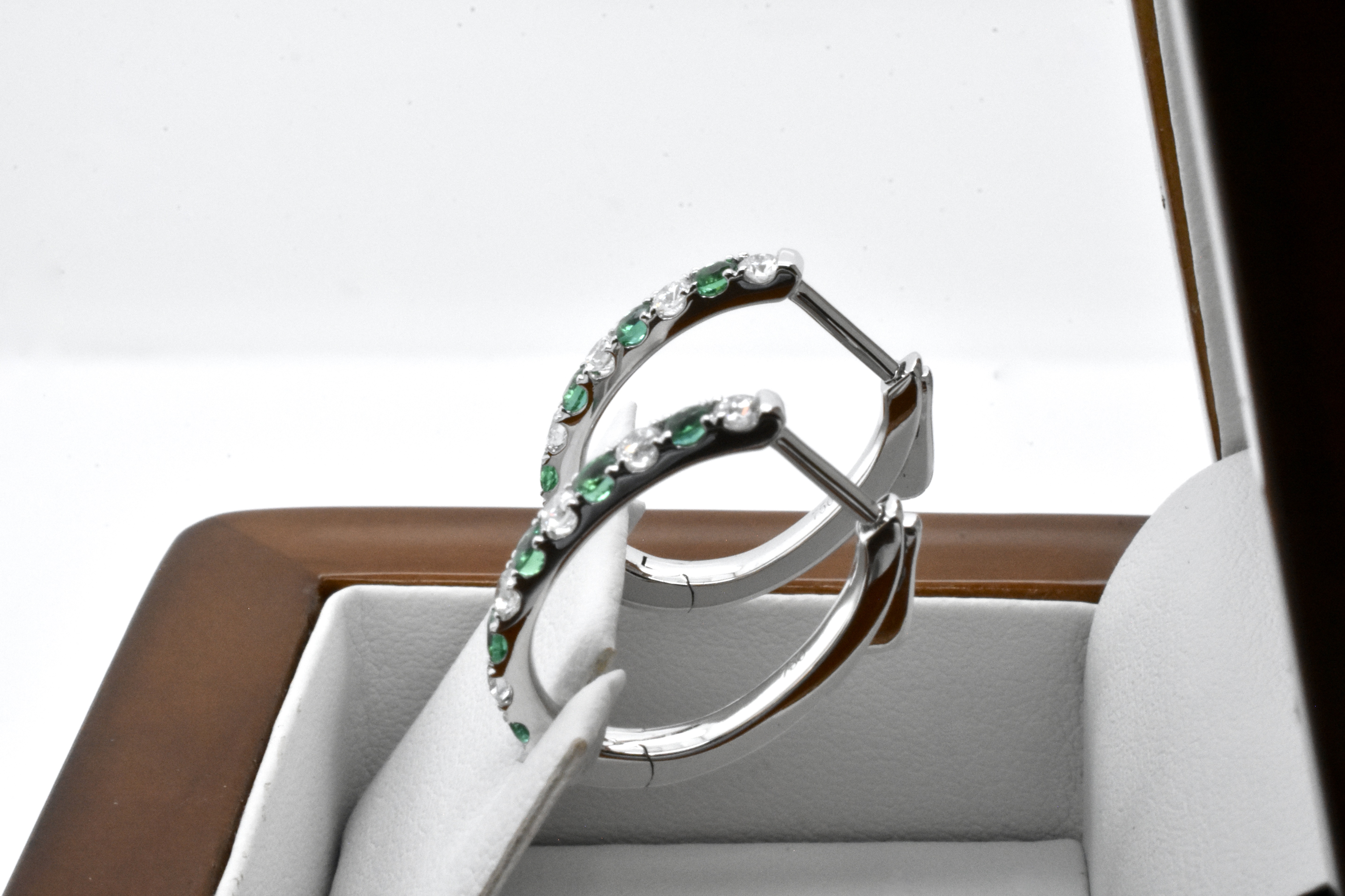 These sparkly huggies are made from 18ct white gold and feature alternating round emeralds and diamonds, claw set in an oval shaped huggie with clipped post fittings and button closure for ease of use. Emeralds are 10 equalling 0.50ct good green and 12 white, sparkly diamonds totalling 0.49ct FG/VS-SI