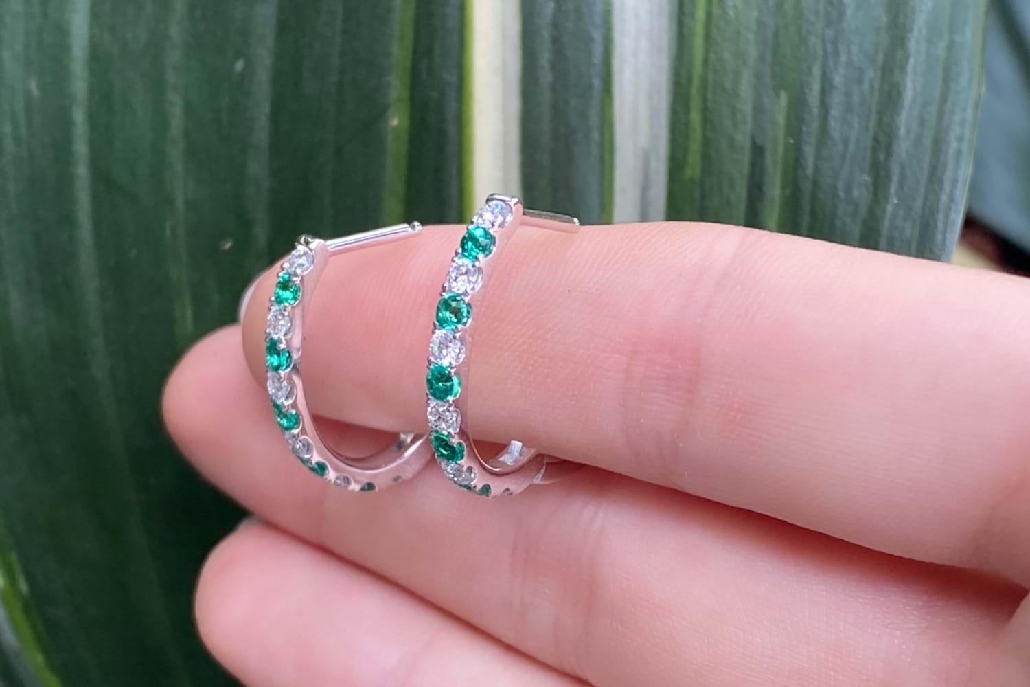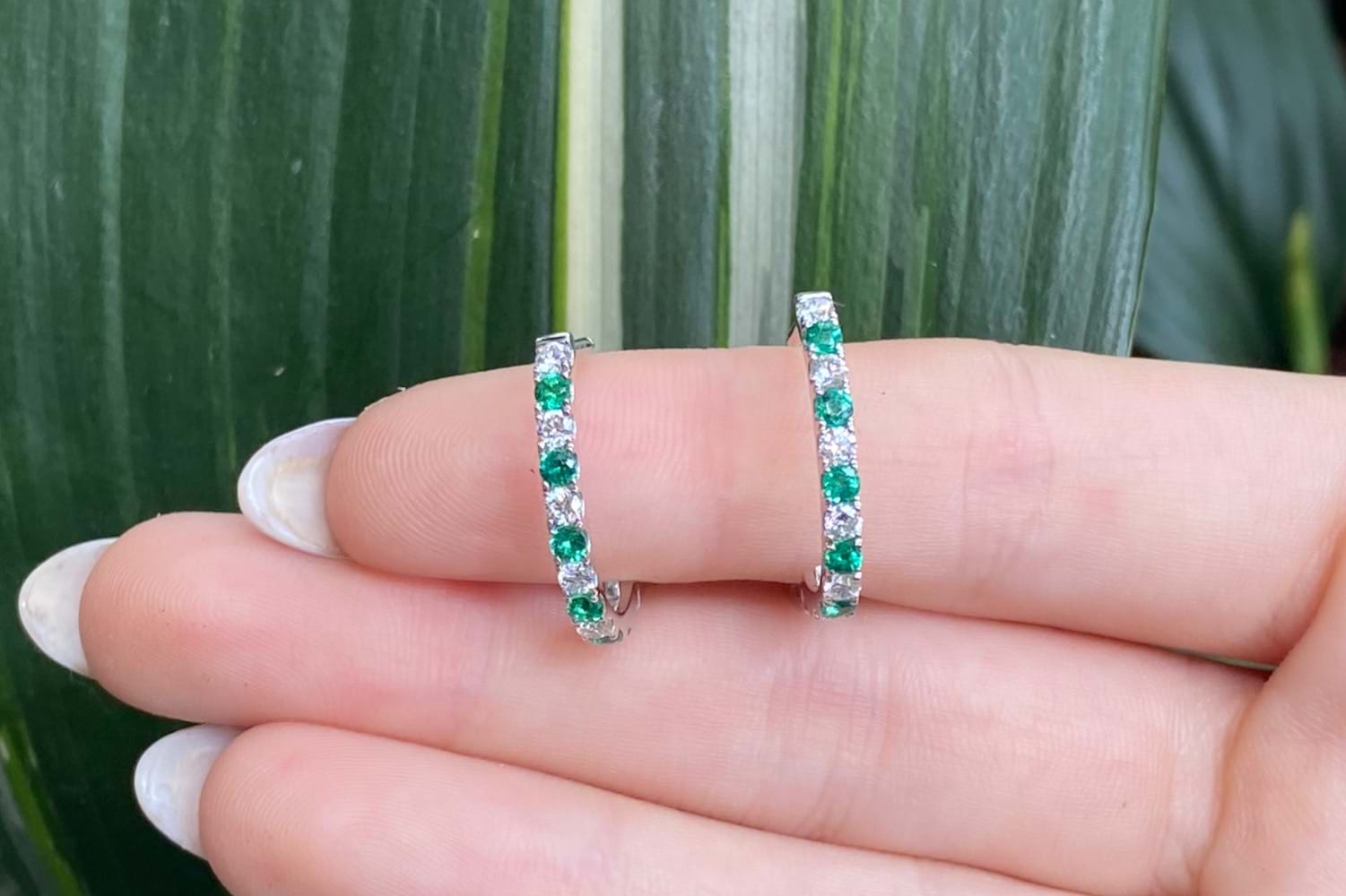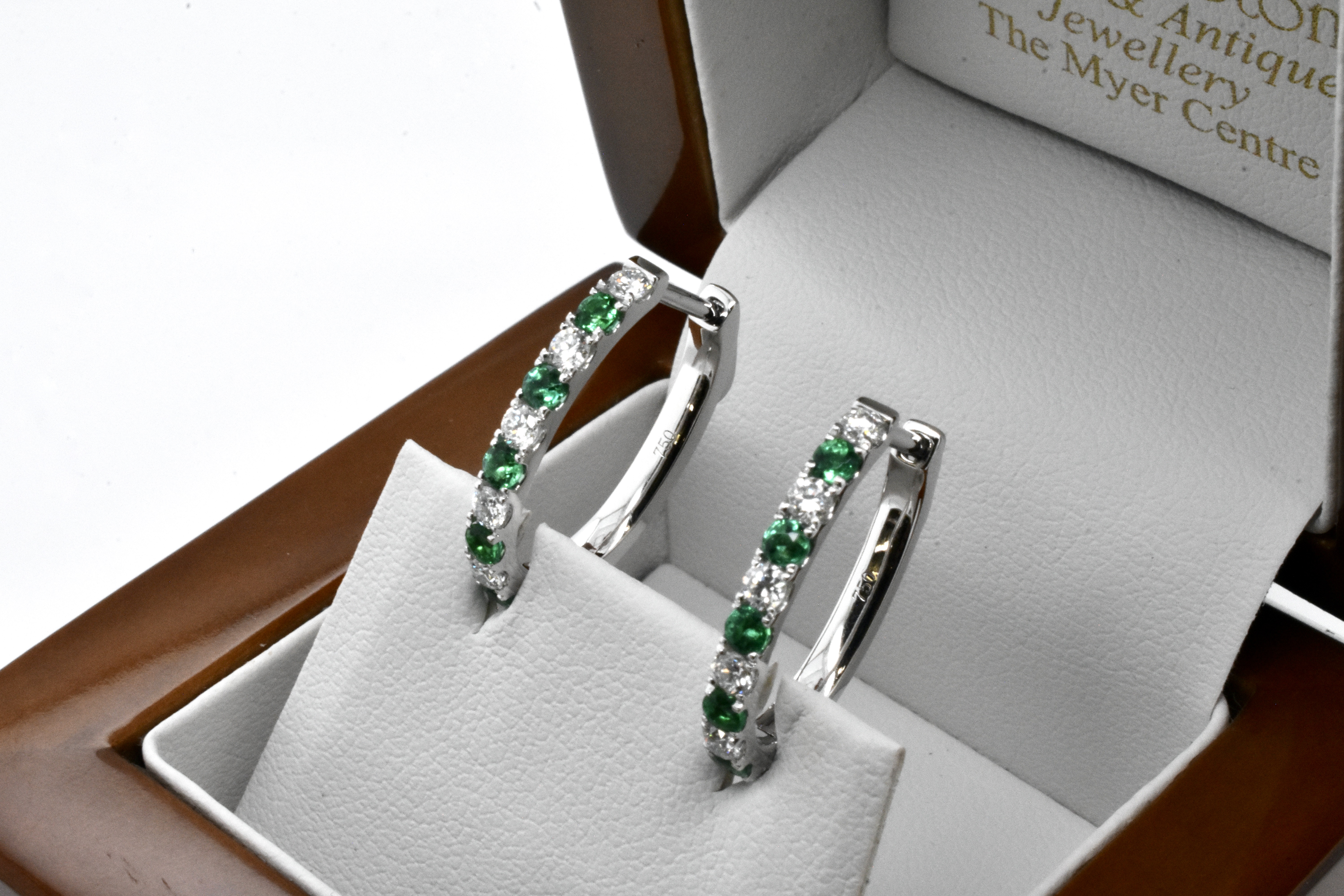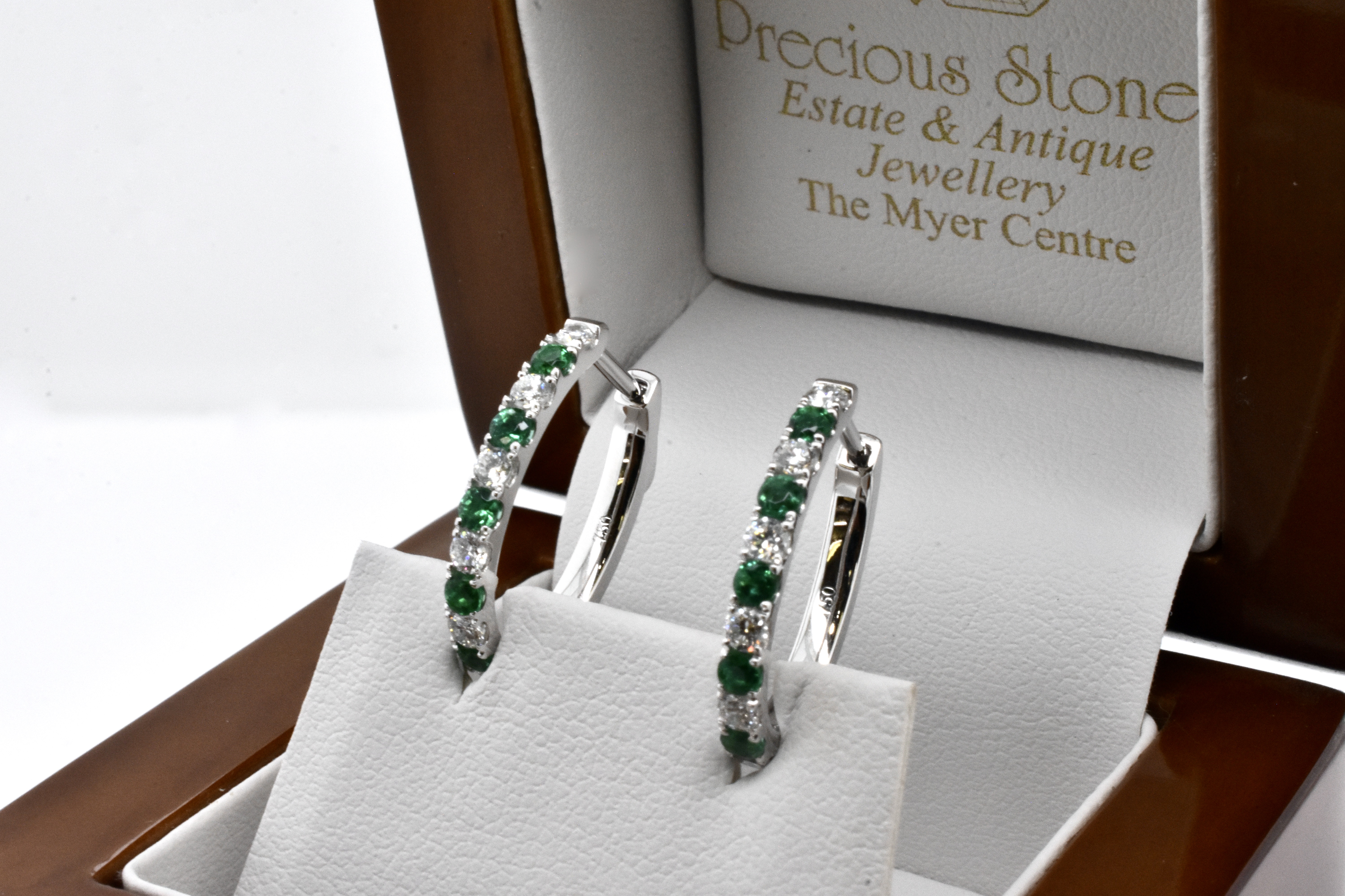 These sparkly huggies are made from 18ct white gold and feature alternating round emeralds and diamonds, claw set in an oval shaped huggie with clipped post fittings and button closure for ease of use. Emeralds are 10 equalling 0.50ct good green and 12 white, sparkly diamonds totalling 0.49ct FG/VS-SI