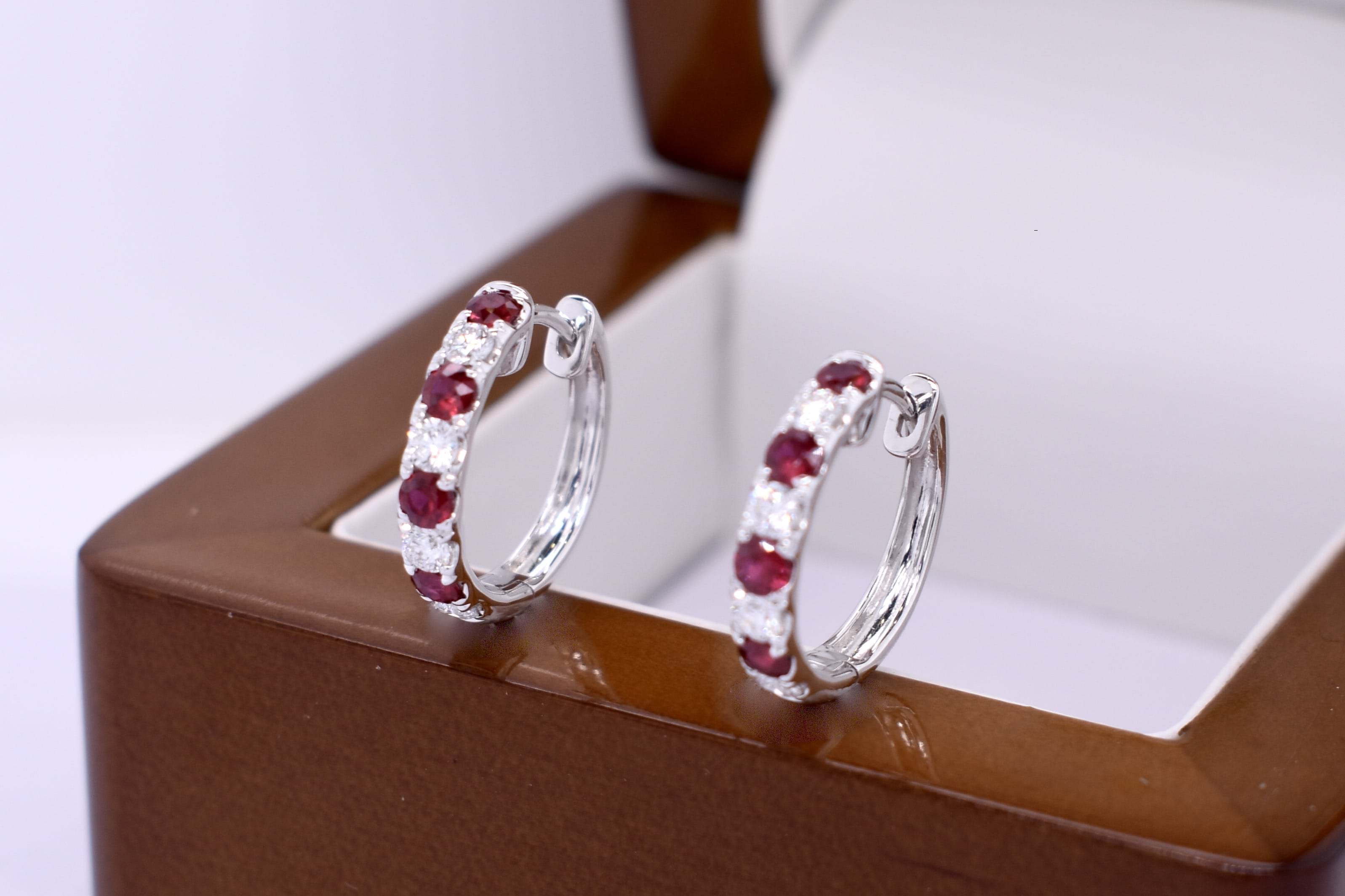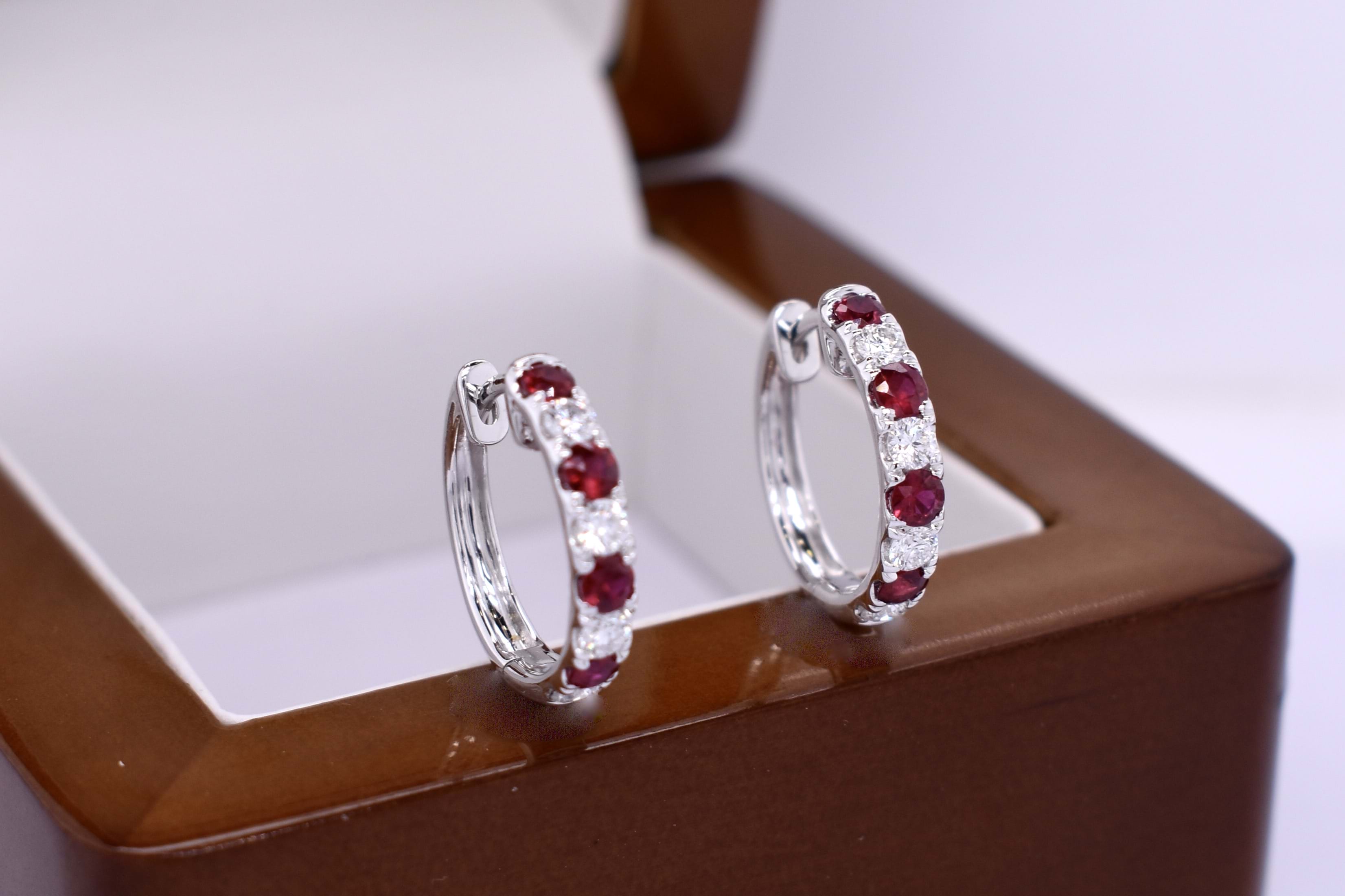 Sparkly and vibrant, these 18ct white gold hoops feature 8 round 2.4mm rubies totalling 0.51ct, alternating with 18 round brilliant cut FG VS-Si diamonds totalling 0.36ct, with clipped post fittings. 2.65 grams. Independent Valuation Supplied