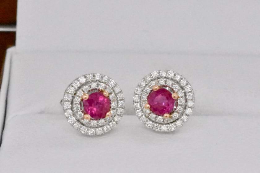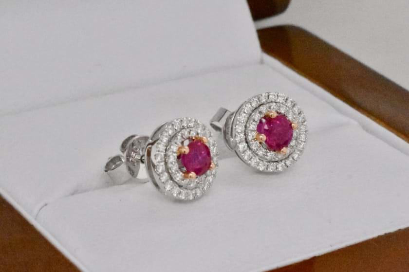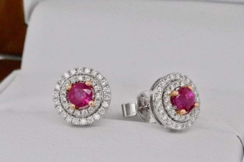 These 18ct white gold feature a pair of natural rubies totalling 0.53cts in yellow gold claws surrounded by a double halo of shimmering white diamonds equalling 0.27cts. Independent Valuation Supplied