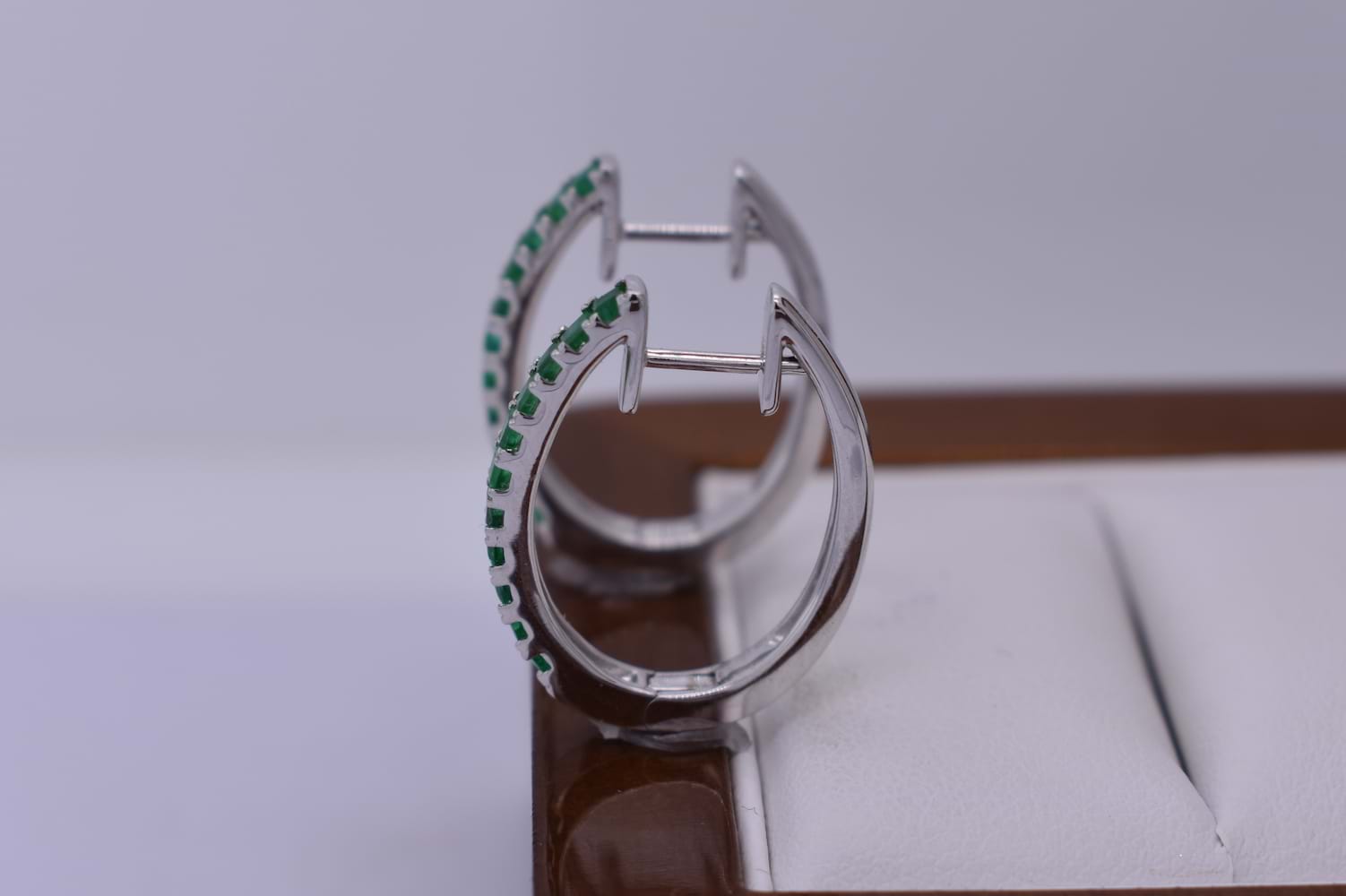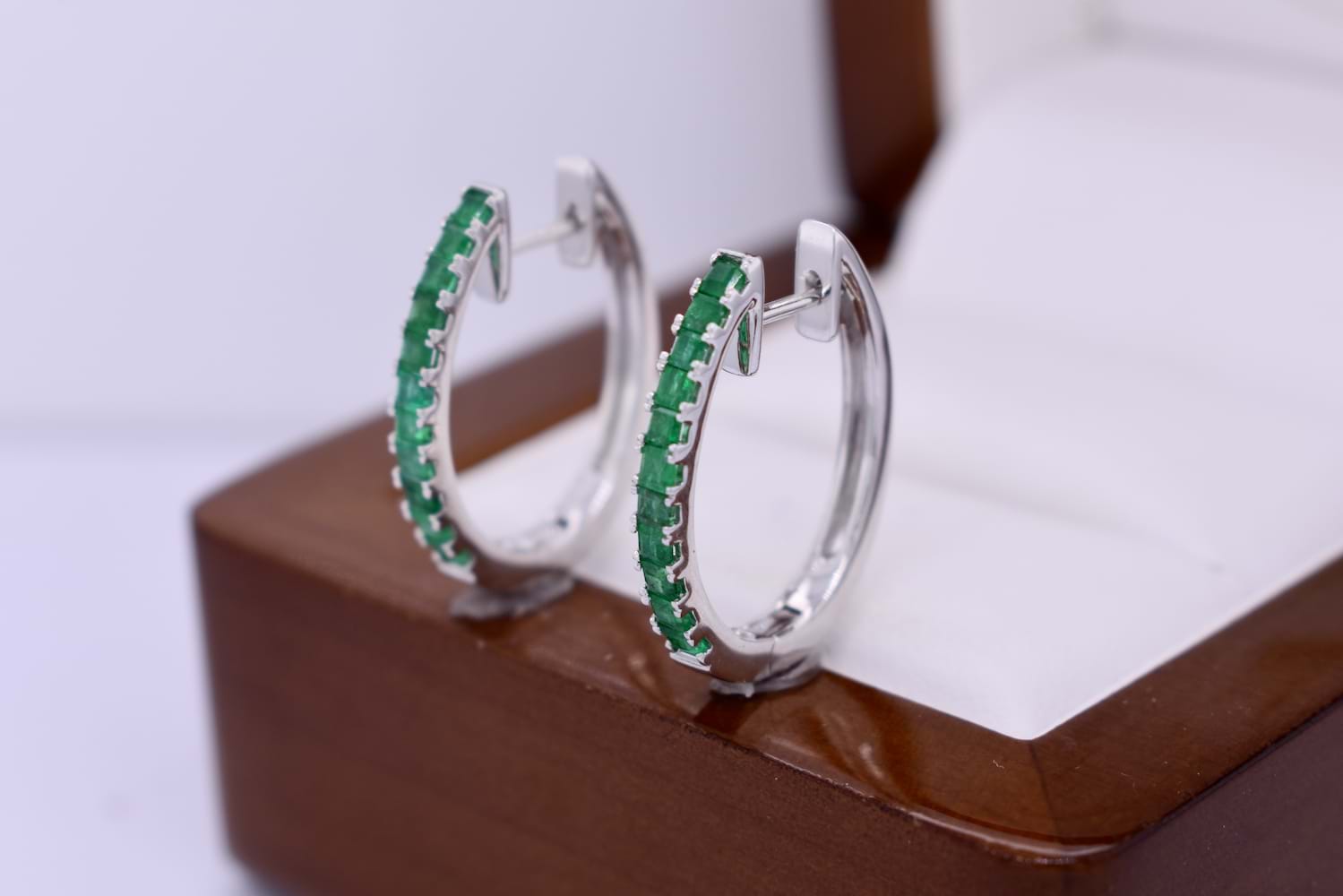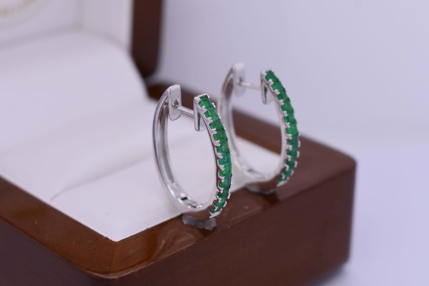 Gorgeous in green, these lovely hoops made from 18ct white gold and feature 22 square cut 2.00mm emeralds, shared 4 claw set in an oval shaped hoops with clipped post fittings and button closure for ease of use. Emeralds are 22 (11 each earring) equalling 0.82ct bright mid green. Independent Valuation Supplied
