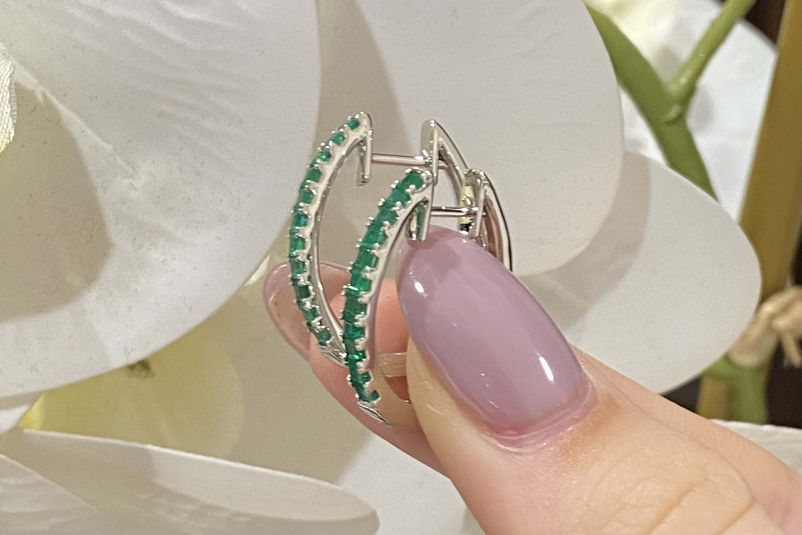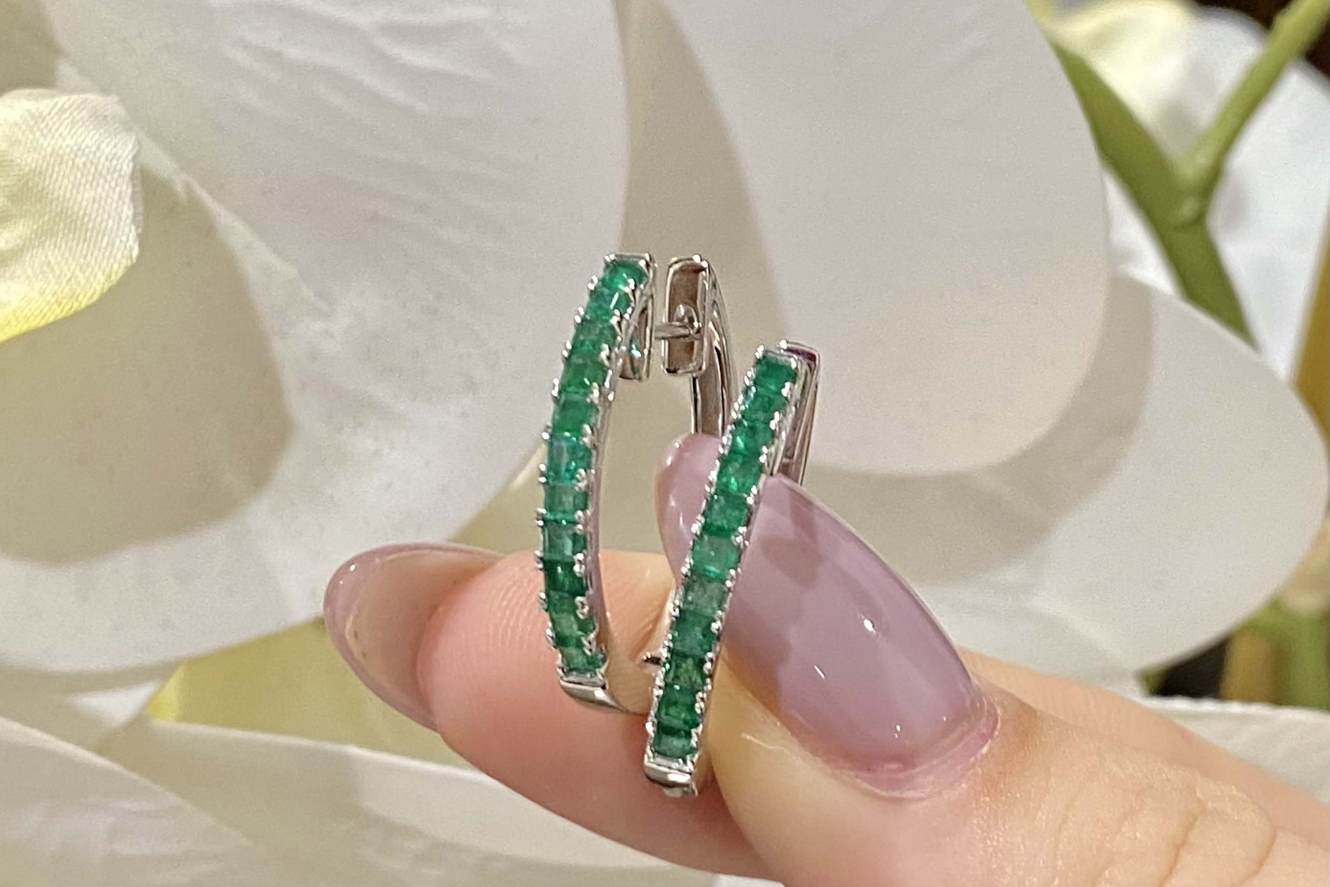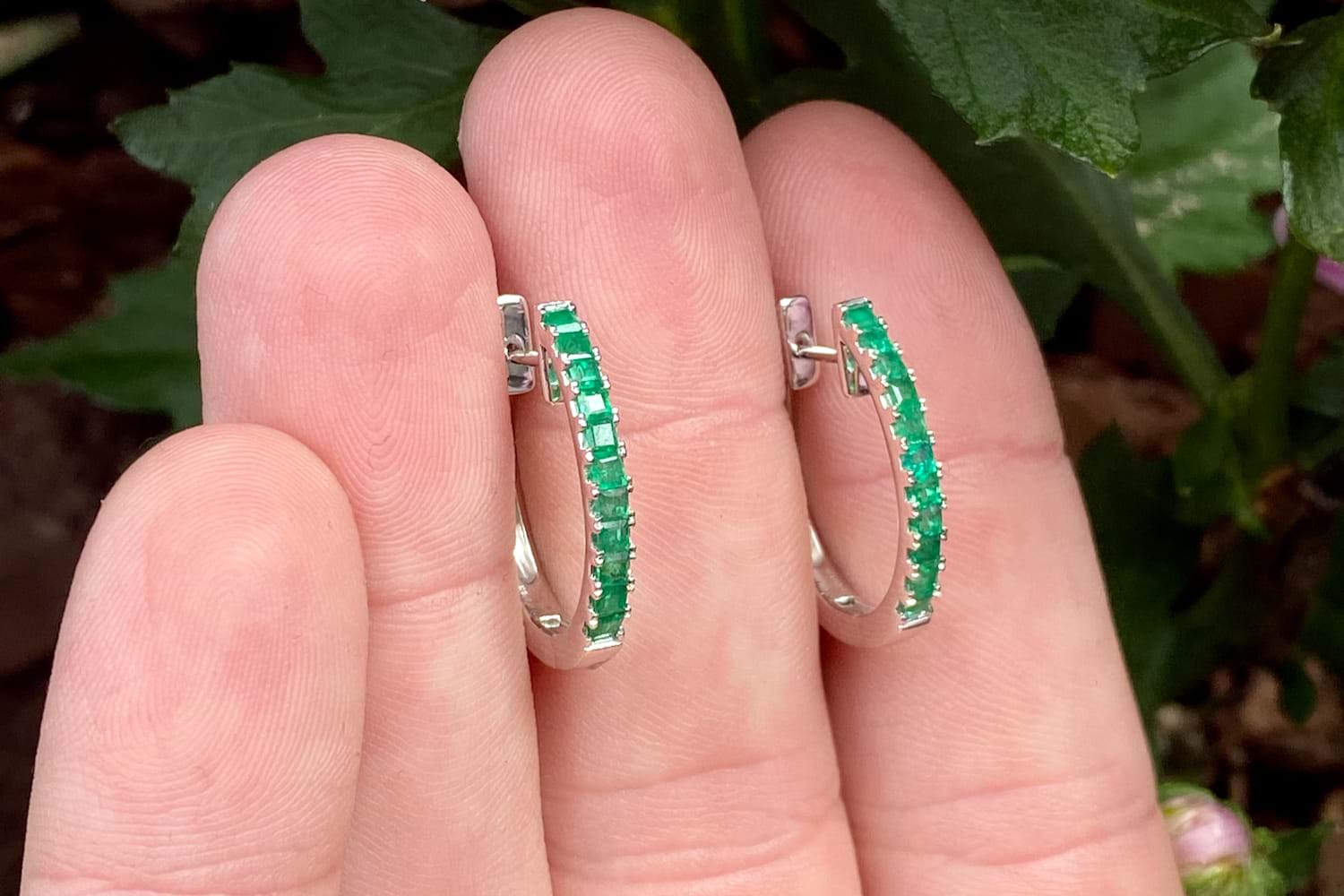 Gorgeous in green, these lovely hoops made from 18ct white gold and feature 22 square cut 2.00mm emeralds, shared 4 claw set in an oval shaped hoops with clipped post fittings and button closure for ease of use. Emeralds are 22 (11 each earring) equalling 0.82ct bright mid green. Independent Valuation Supplied