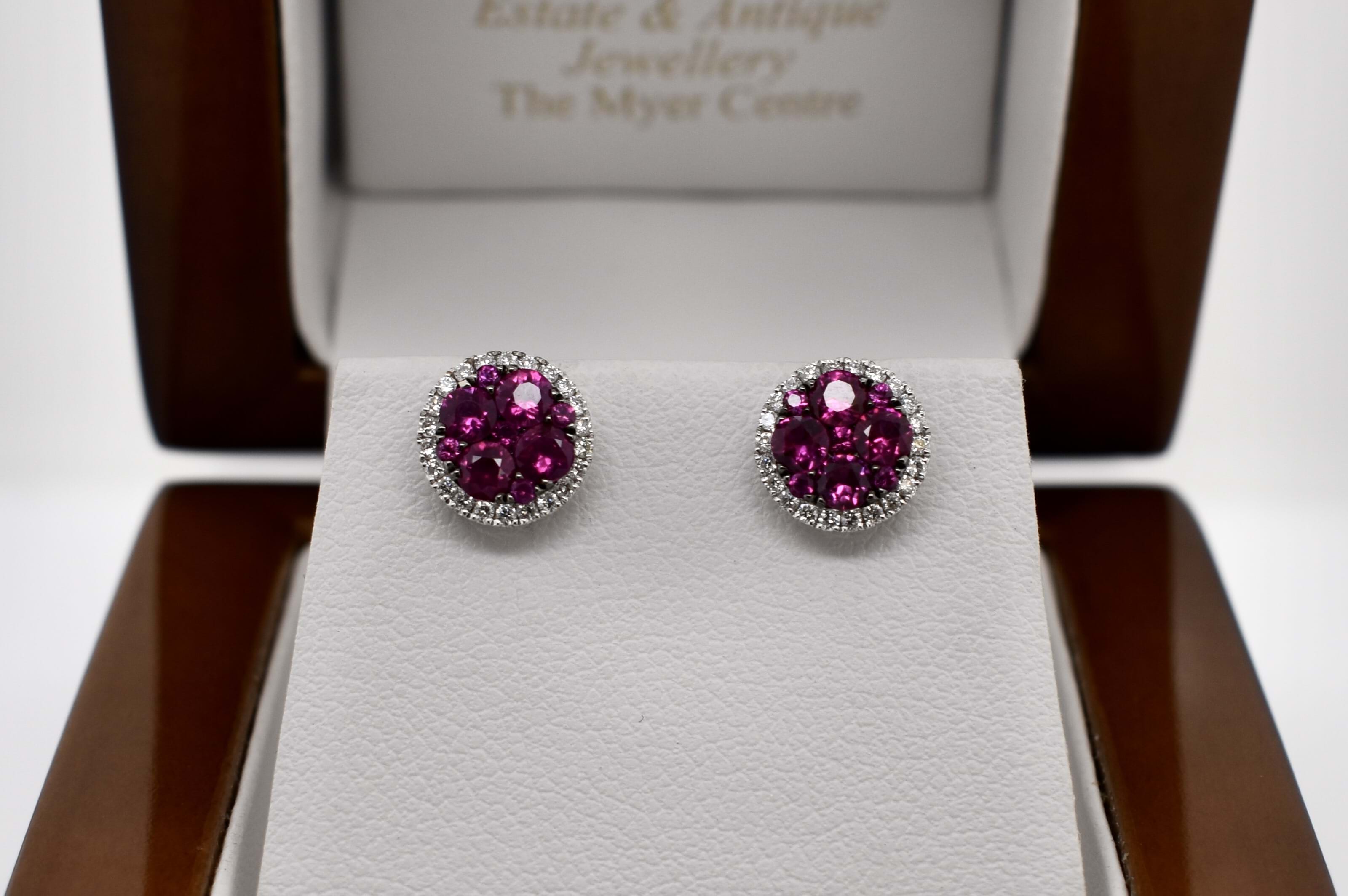 Modern and striking cluster stud earrings crafted in 18ct white gold and containing a total of 18, dark pinkish red, rubies equalling 0.97ct set into a black rhodium plated cluster with a stark white shimmering border of diamonds surrounding them totalling 0.19cts. Earrings have quality stud post and butterfly fittings. Independent Valuation Supplied