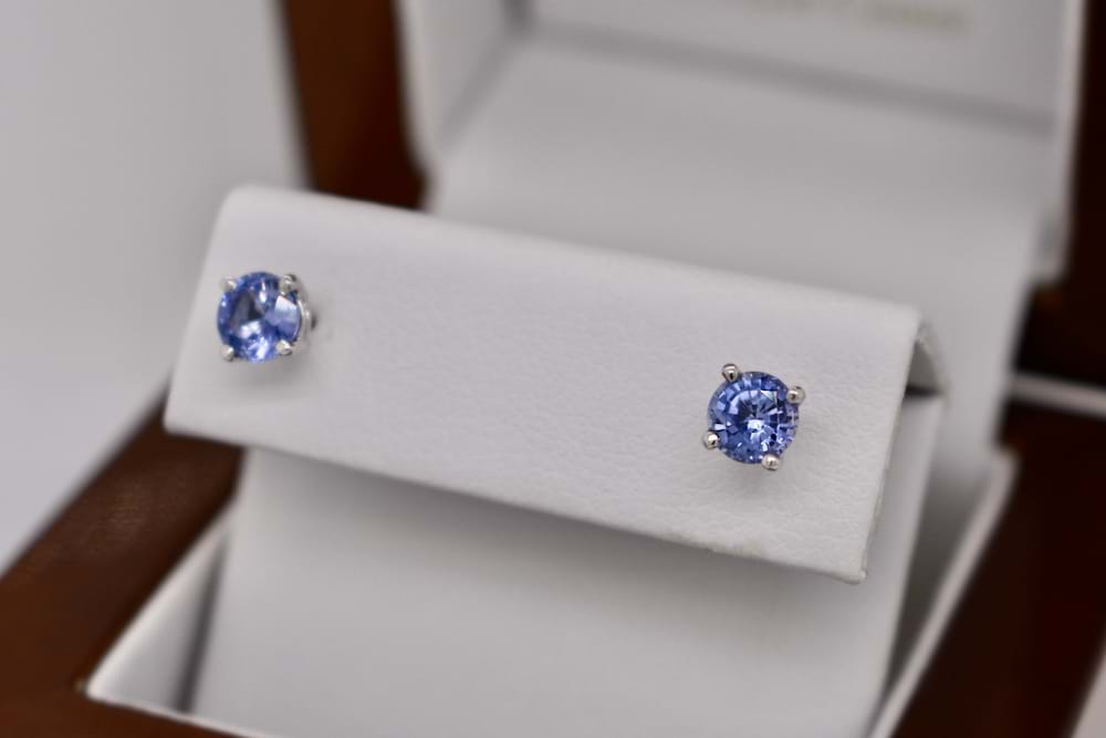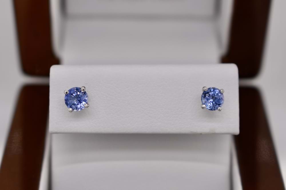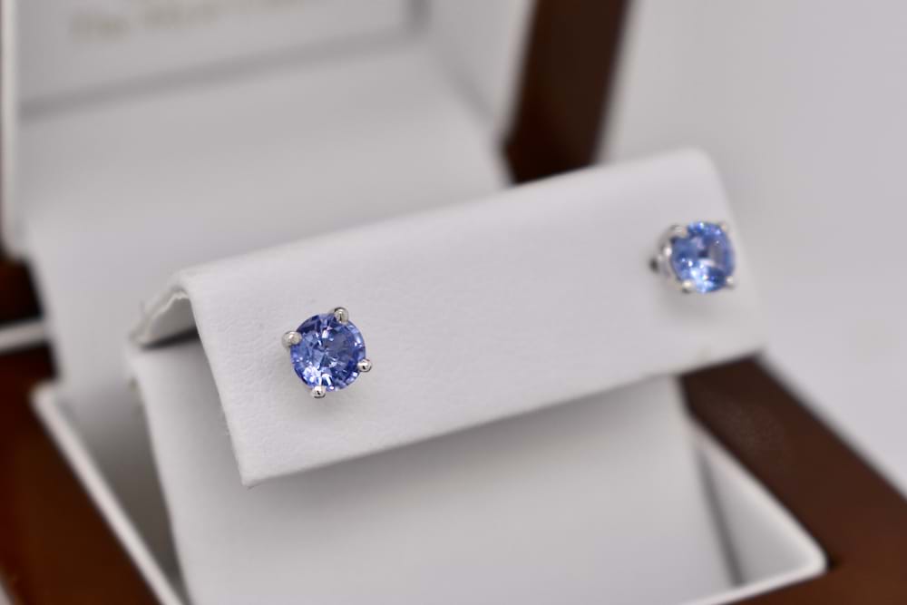 A feminine and beautiful pair of lilac blue sapphires totaling 1.06cts in 18ct white gold four claw settings. Stunning when worn alone or paired with removable jackets. Independent Valuation Supplied