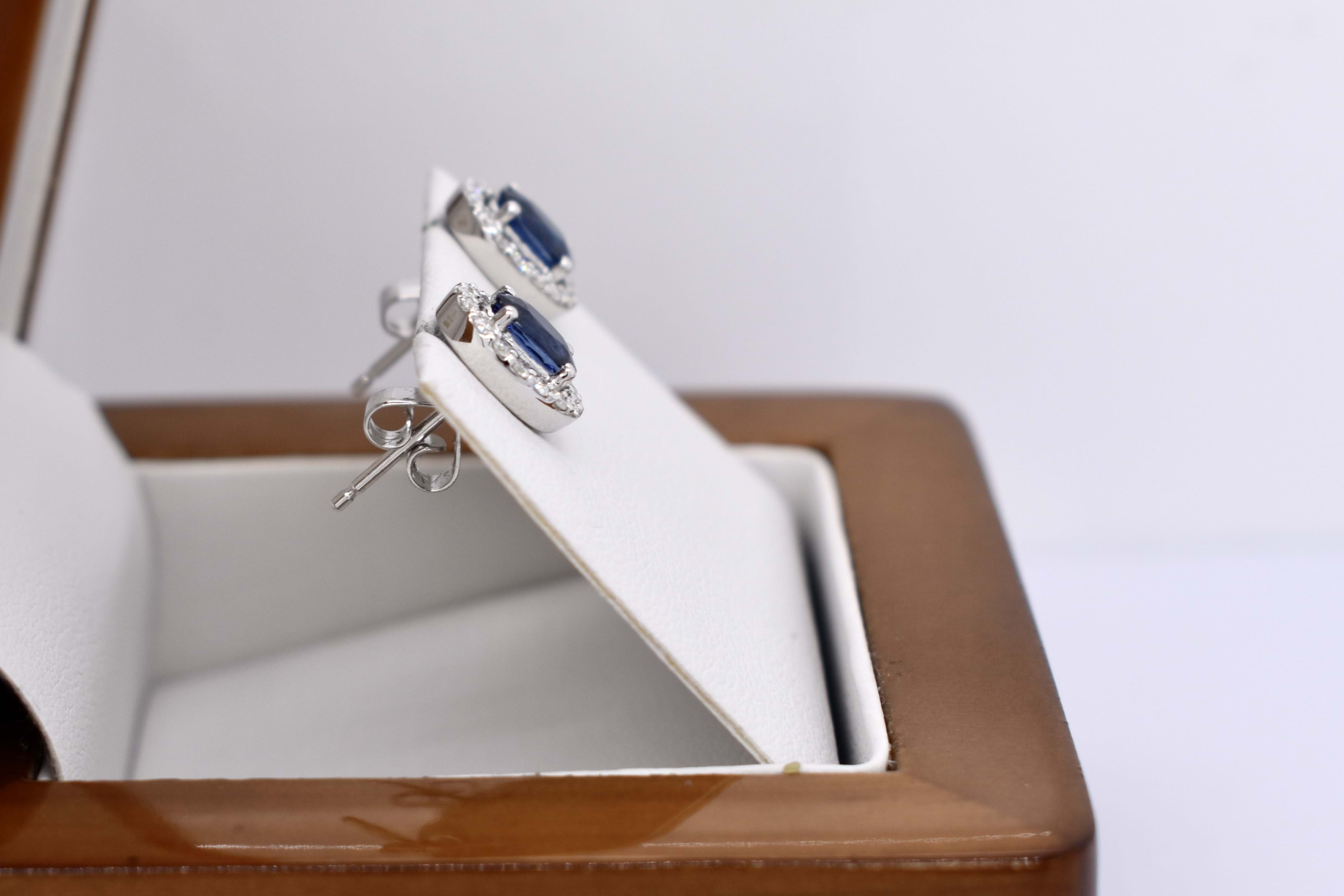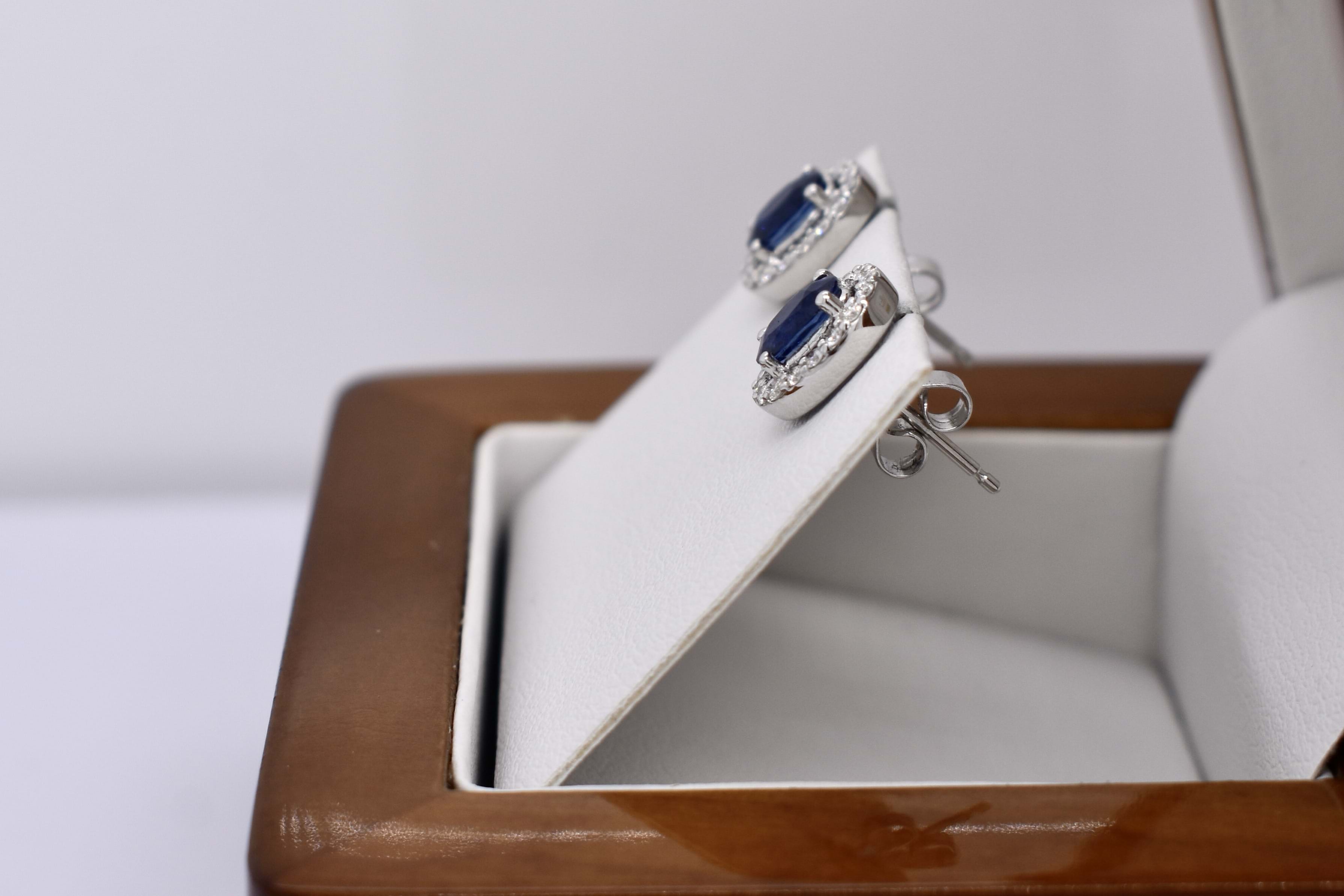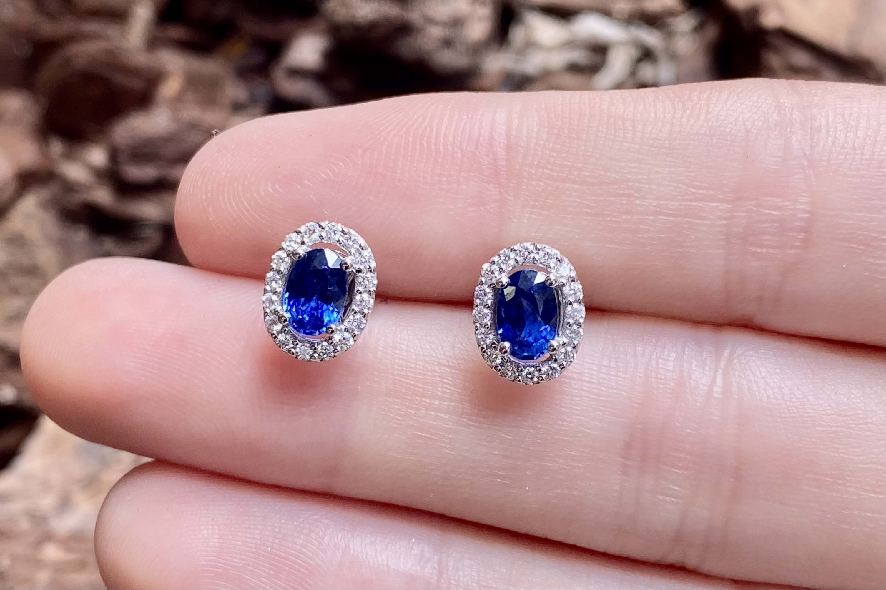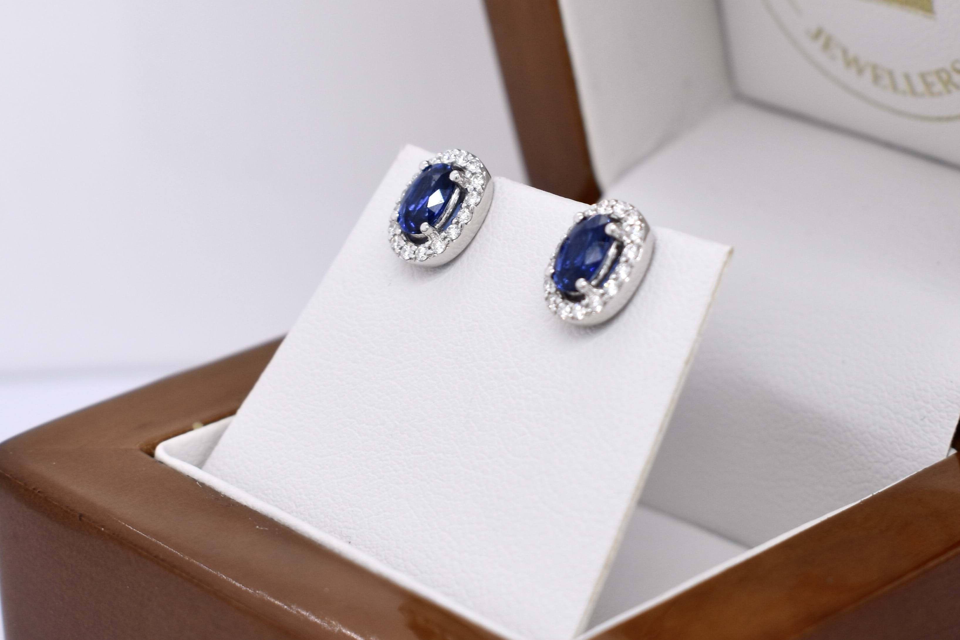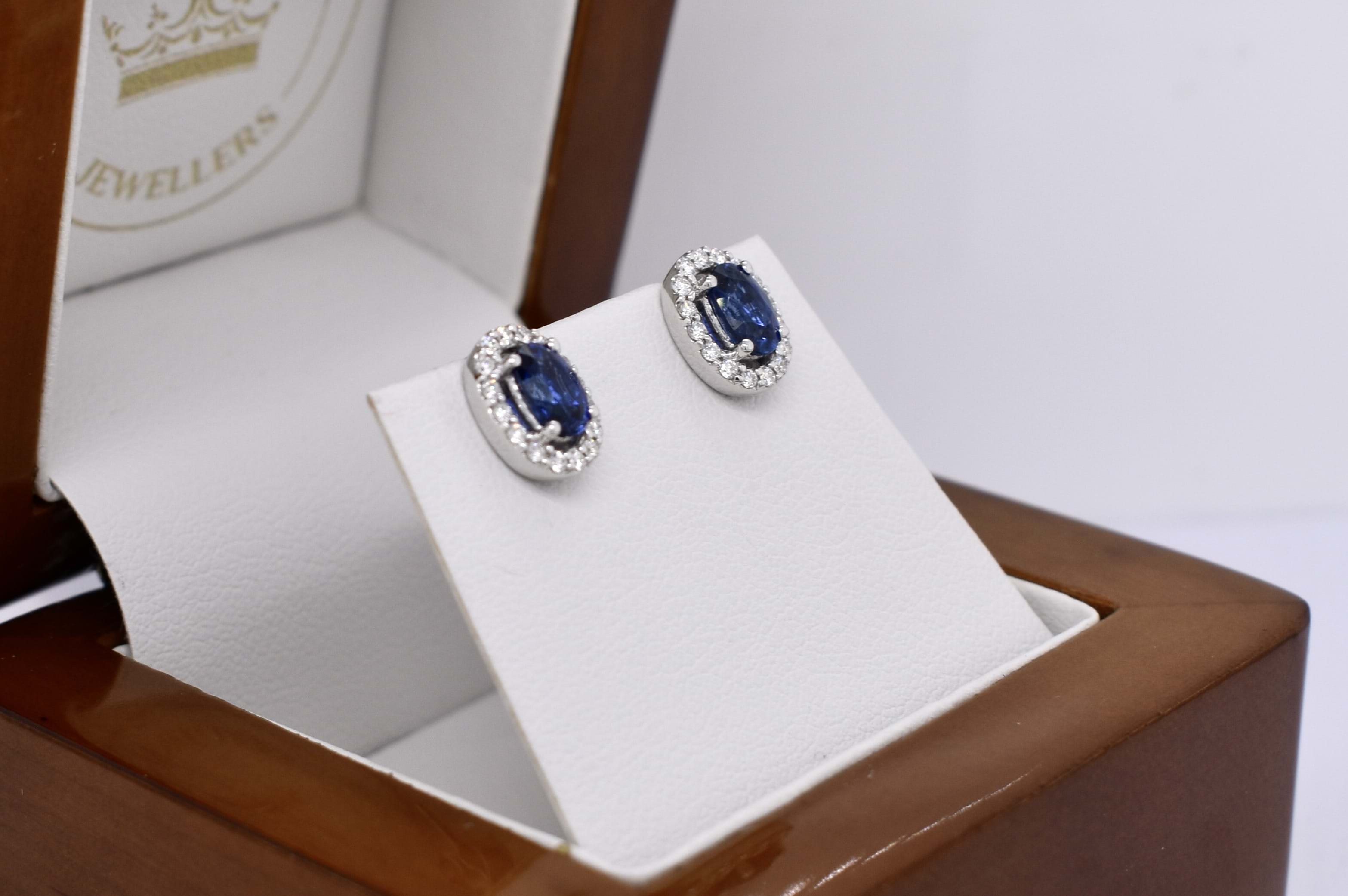 Classic and elegant, this oval pair of studs consisting of two 5.65x3.90mm blue sapphires from Sri Lanka, equalling 1.14ct. Surrounded by a sparkling halo of 16 round brilliant cut 1.10mm diamonds each stud, a total of 32 totalling 0.21ct FG VS-SI. 2.60 grams. Independent Valuation Supplied.
