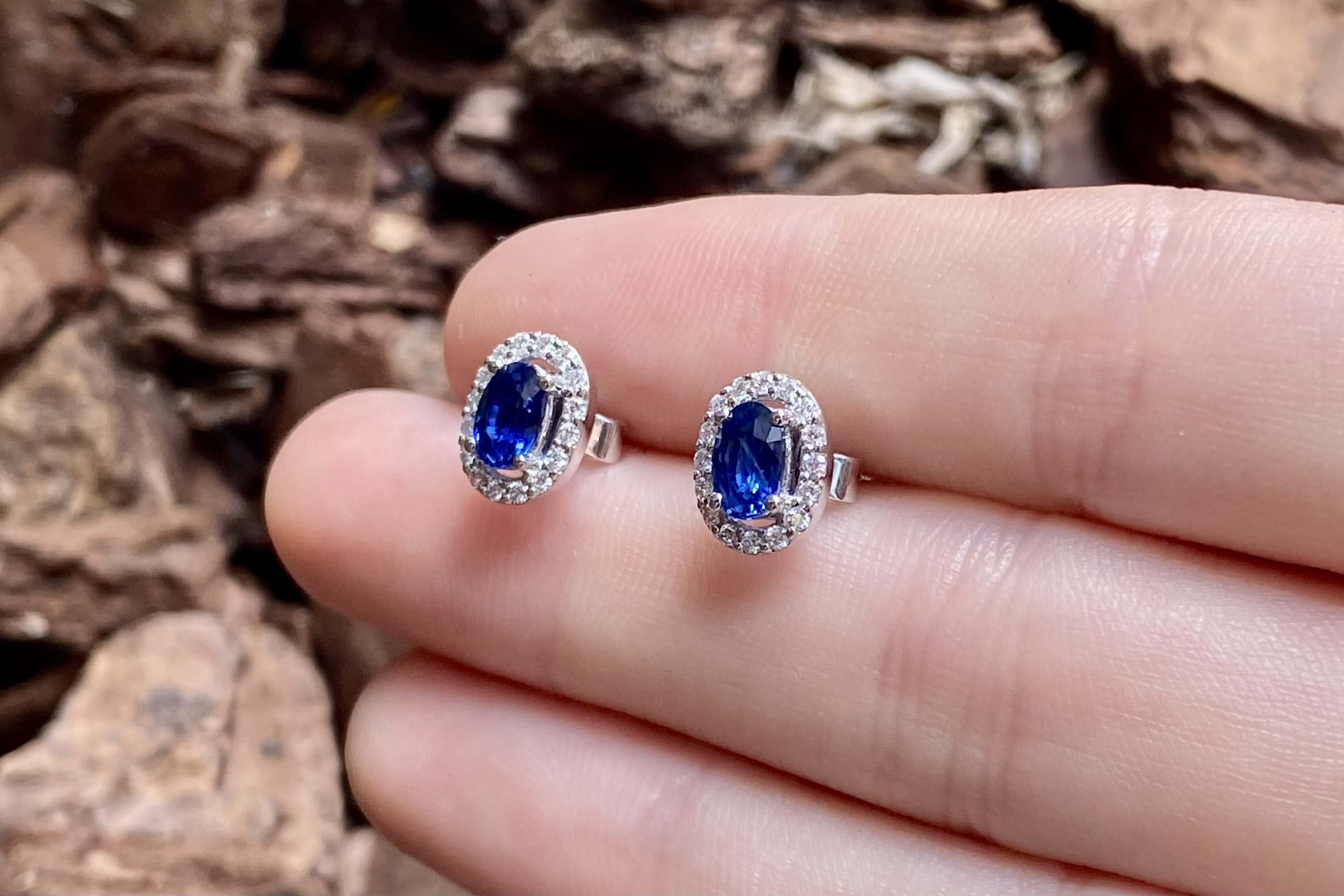 SOLD 18ct White Gold 1.14ct Sri Lankan Blue Sapphire & 0.21ct Diamond Halo Studs