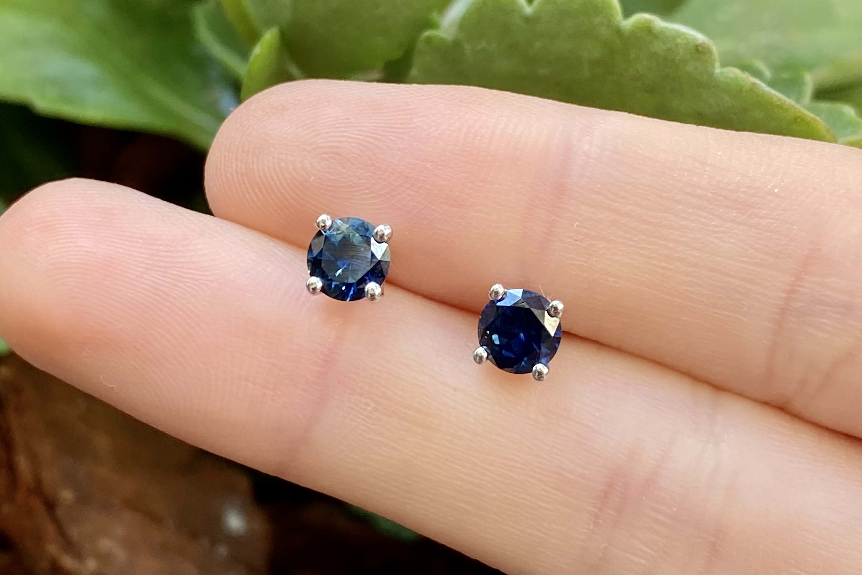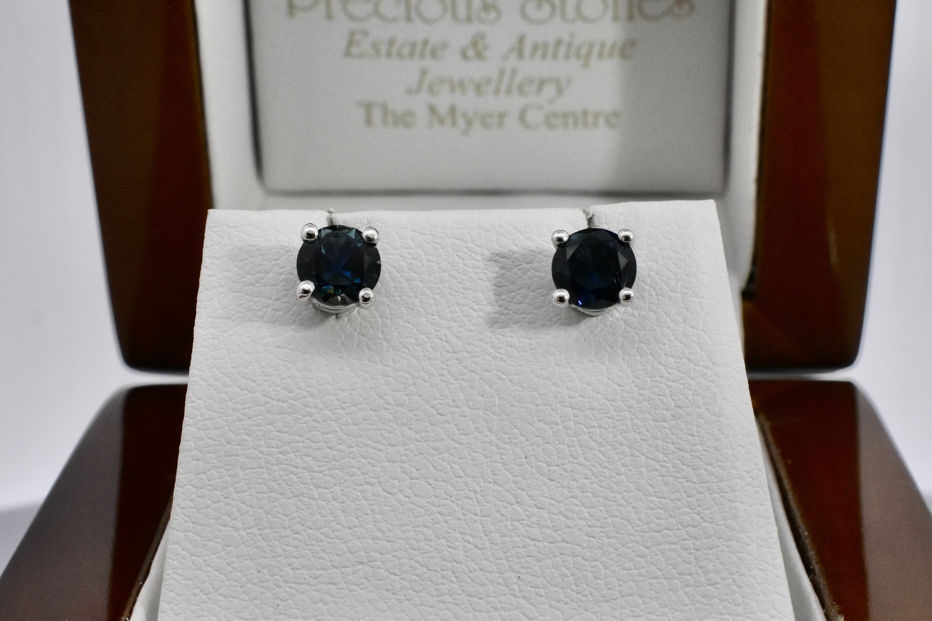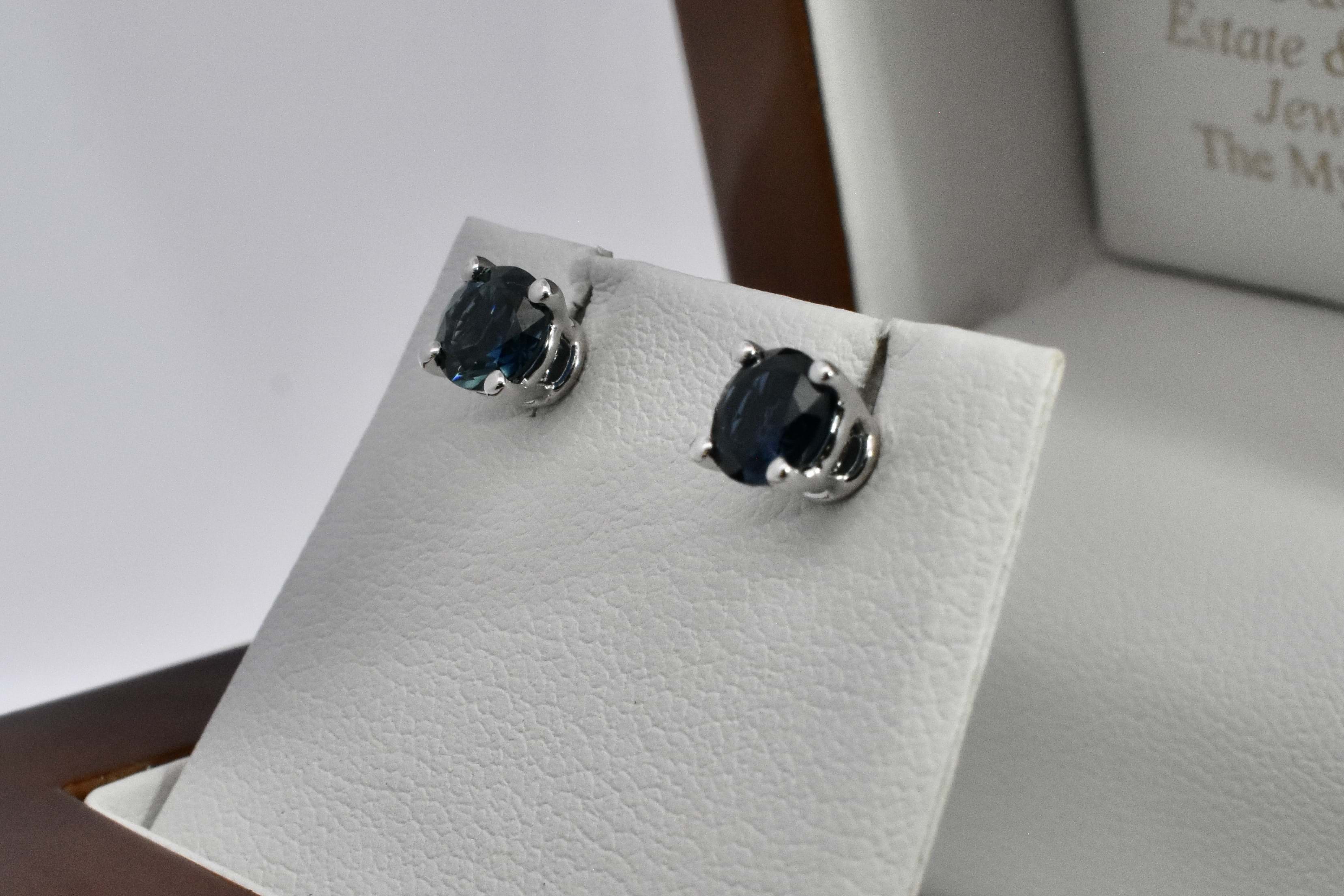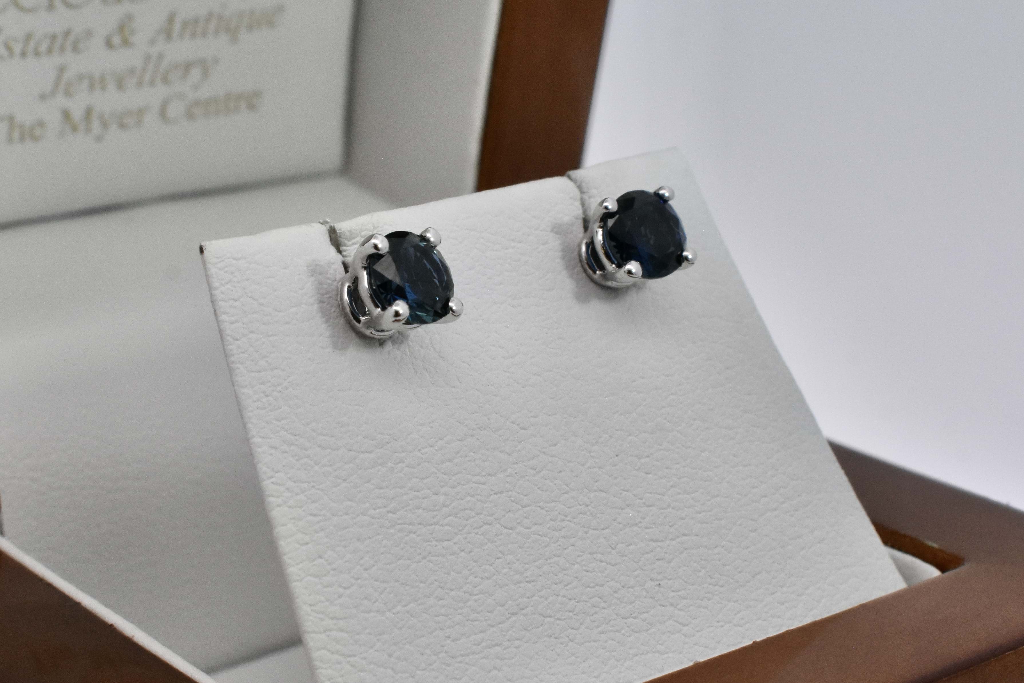 These simple and classic Australian sapphire studs are the perfect staple to any collection. Set in 18ct white gold, these two round bright dark blue sapphires are four claw set, totalling 1.24ct. These studs look fantastic alone or paired with jackets as pictured (available for separate purchase 20350543).