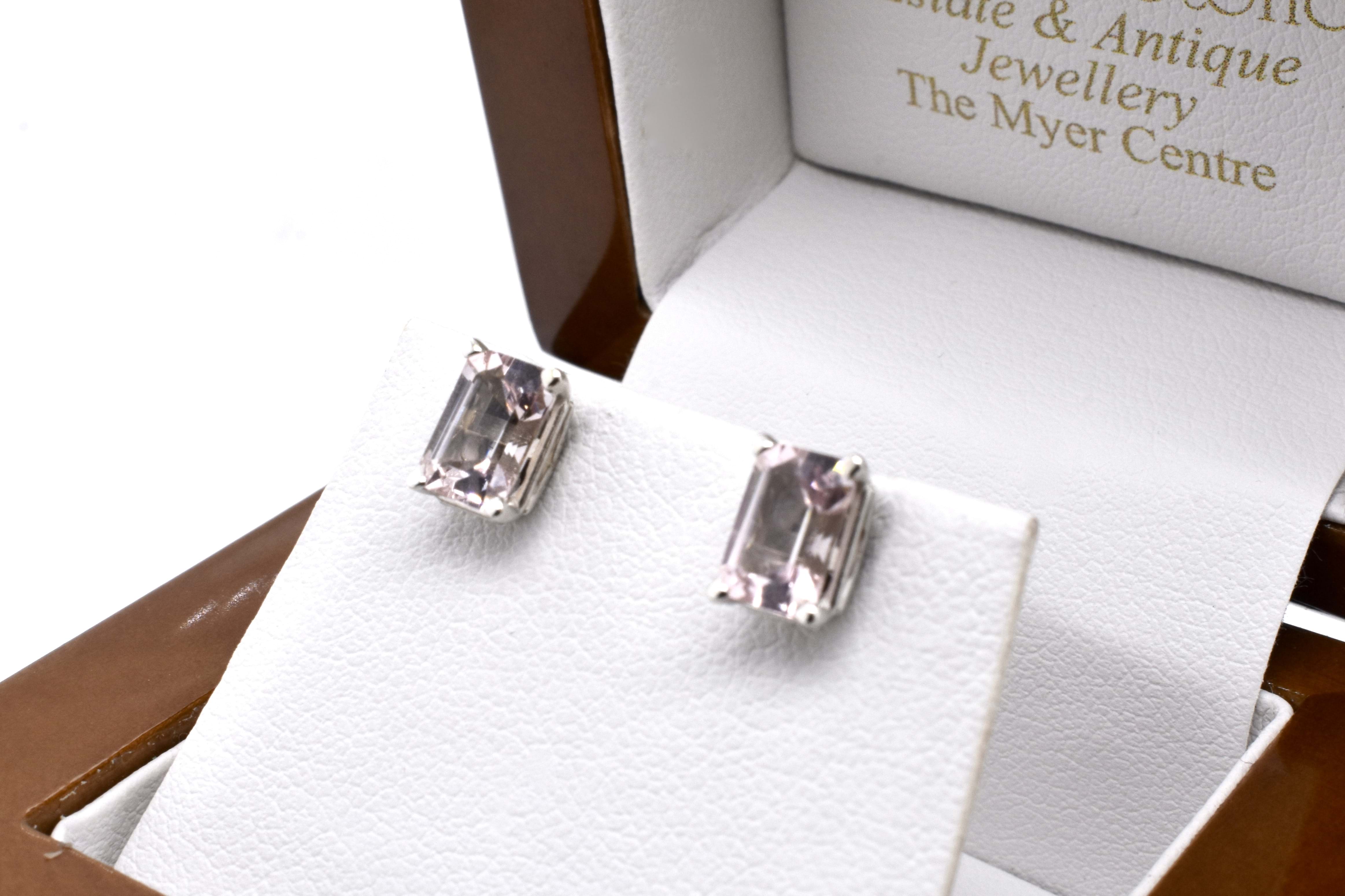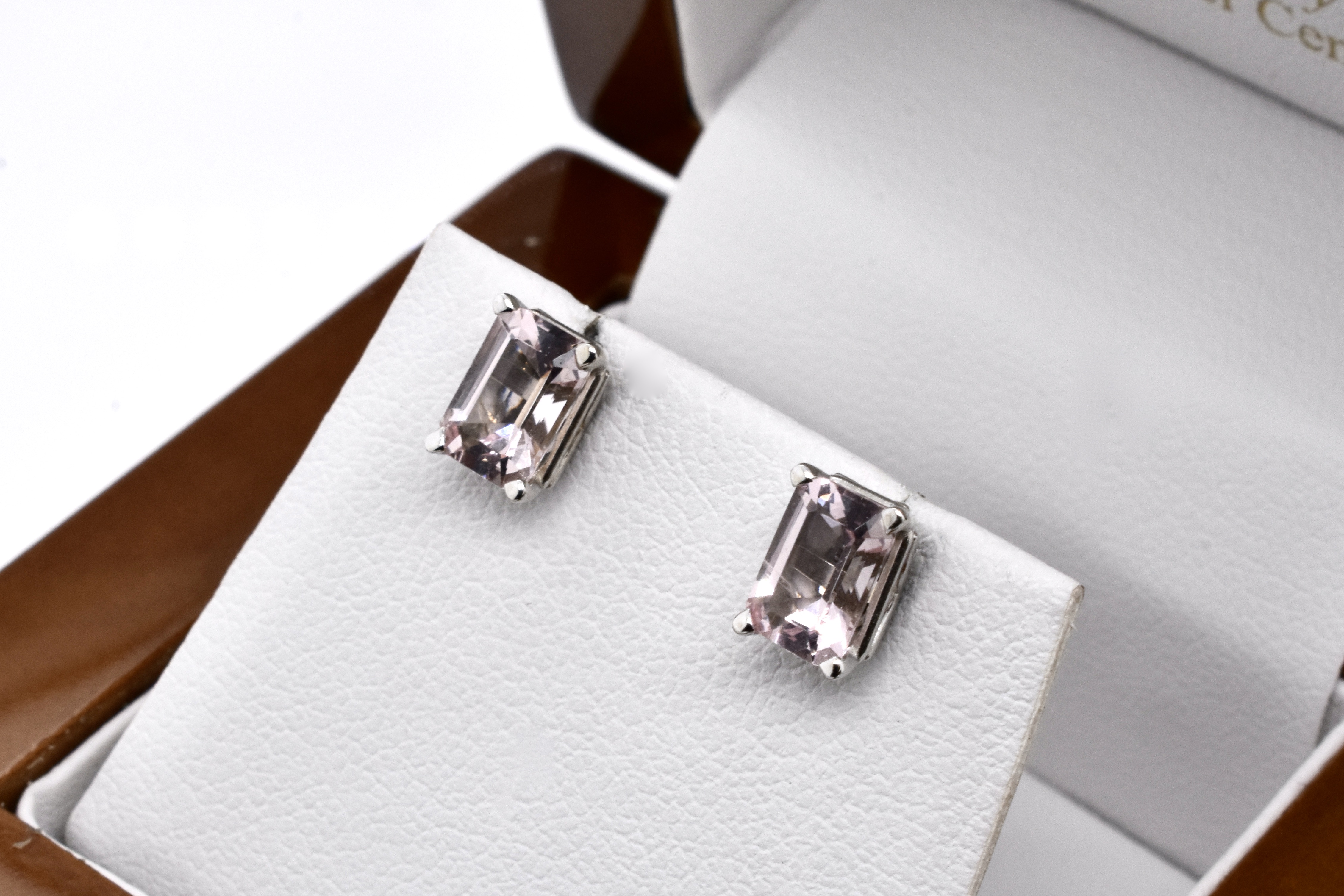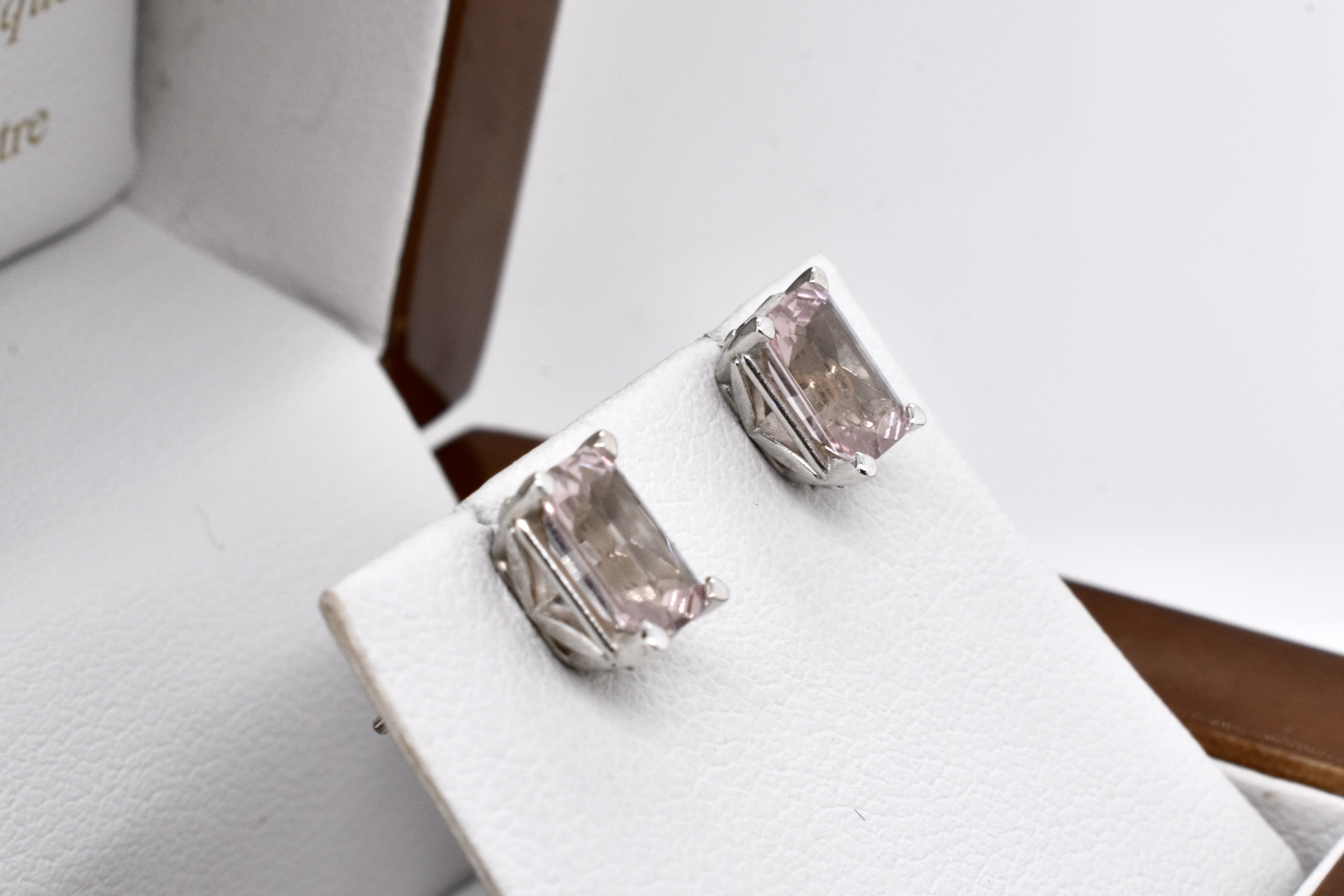 This pretty pair of studs is crafted in 18ct white gold, set with two emerald cut morganites equalling 1.29ct in a lovely soft pink tone, in 4 talon claw settings with post and butterfly fittings