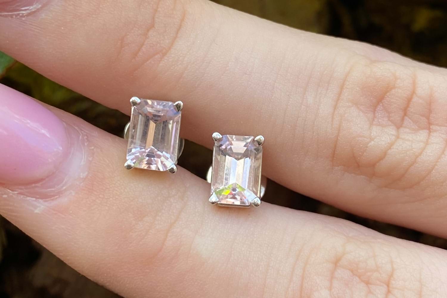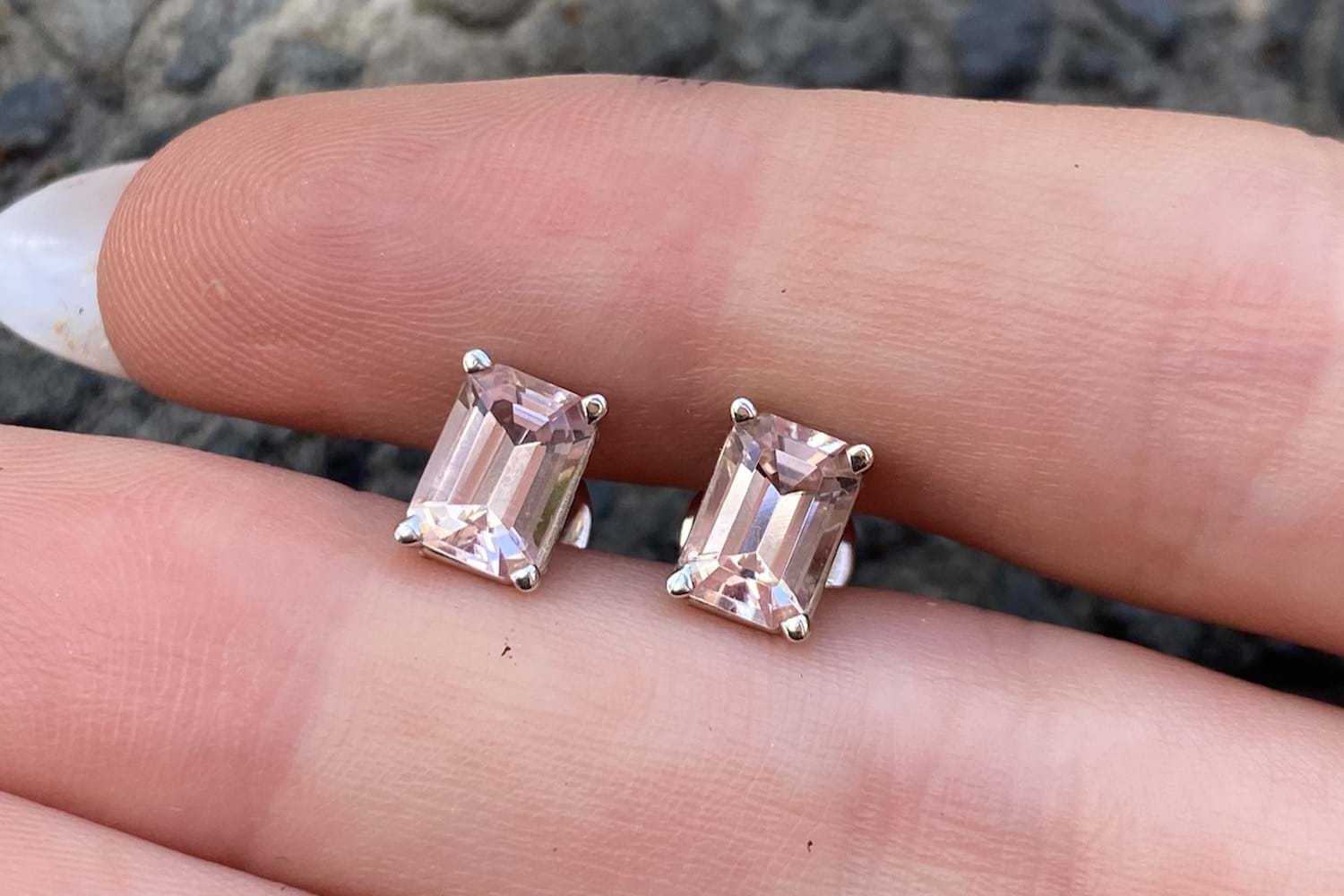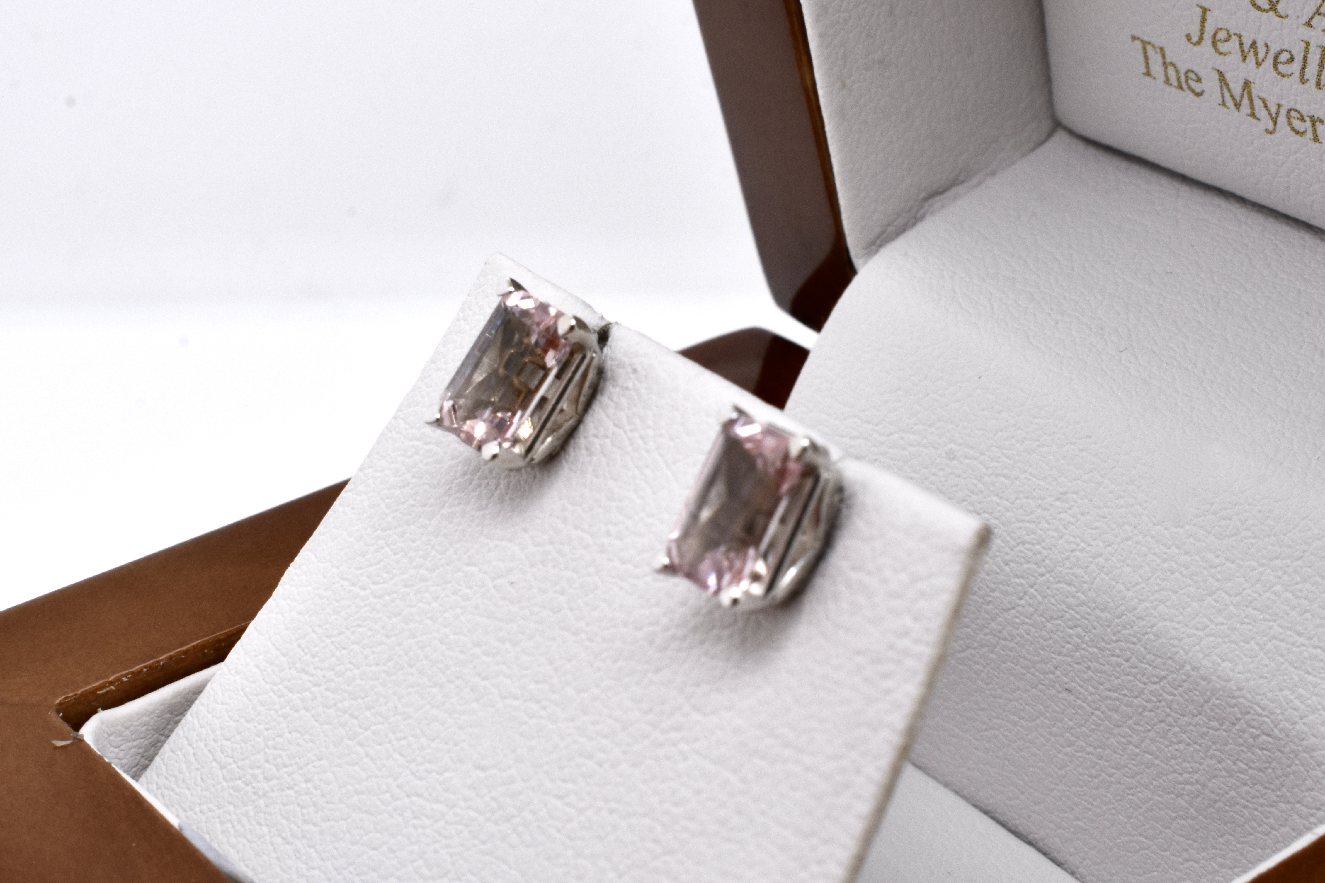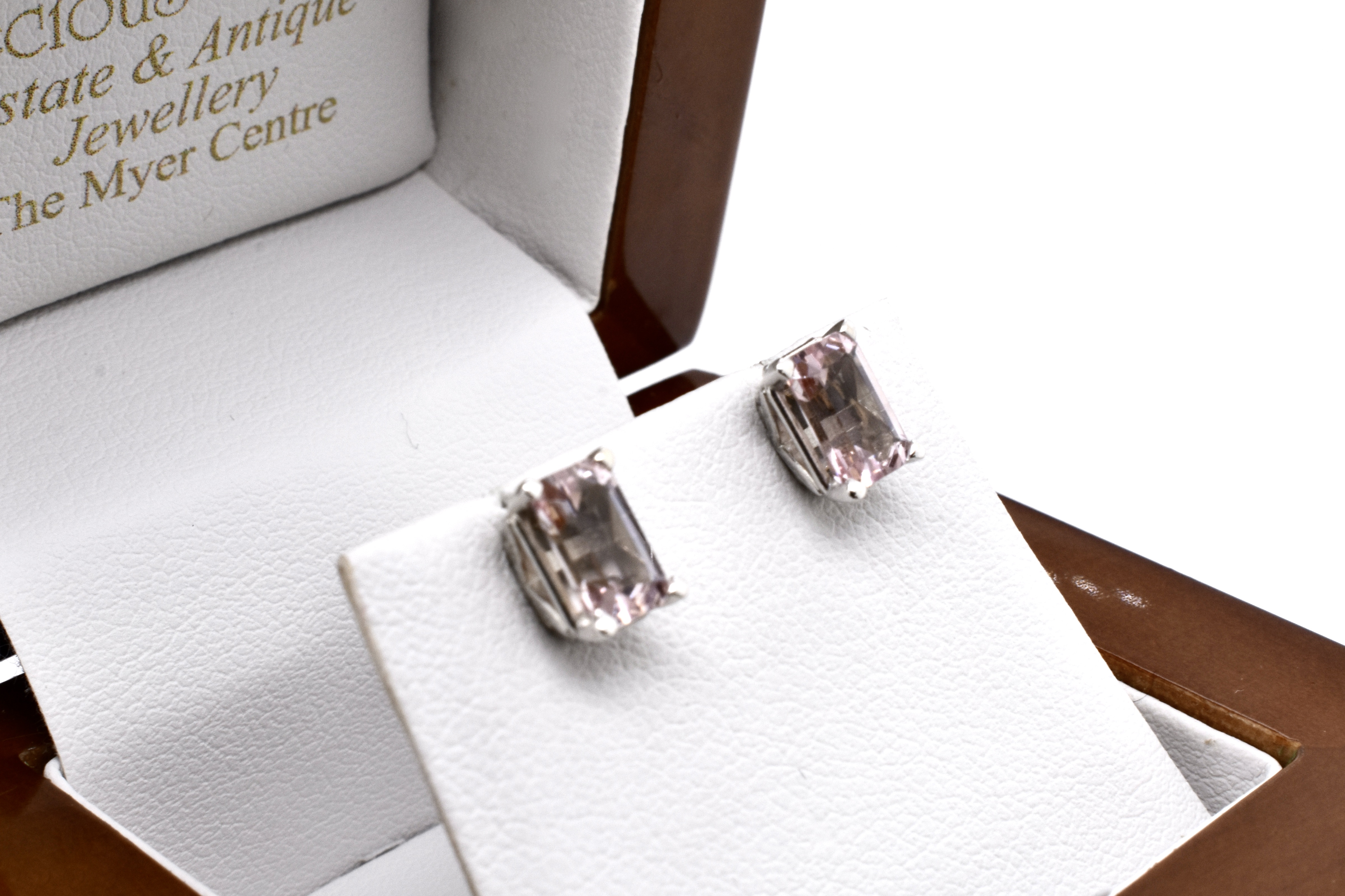 This pretty pair of studs is crafted in 18ct white gold, set with two emerald cut morganites equalling 1.29ct in a lovely soft pink tone, in 4 talon claw settings with post and butterfly fittings
