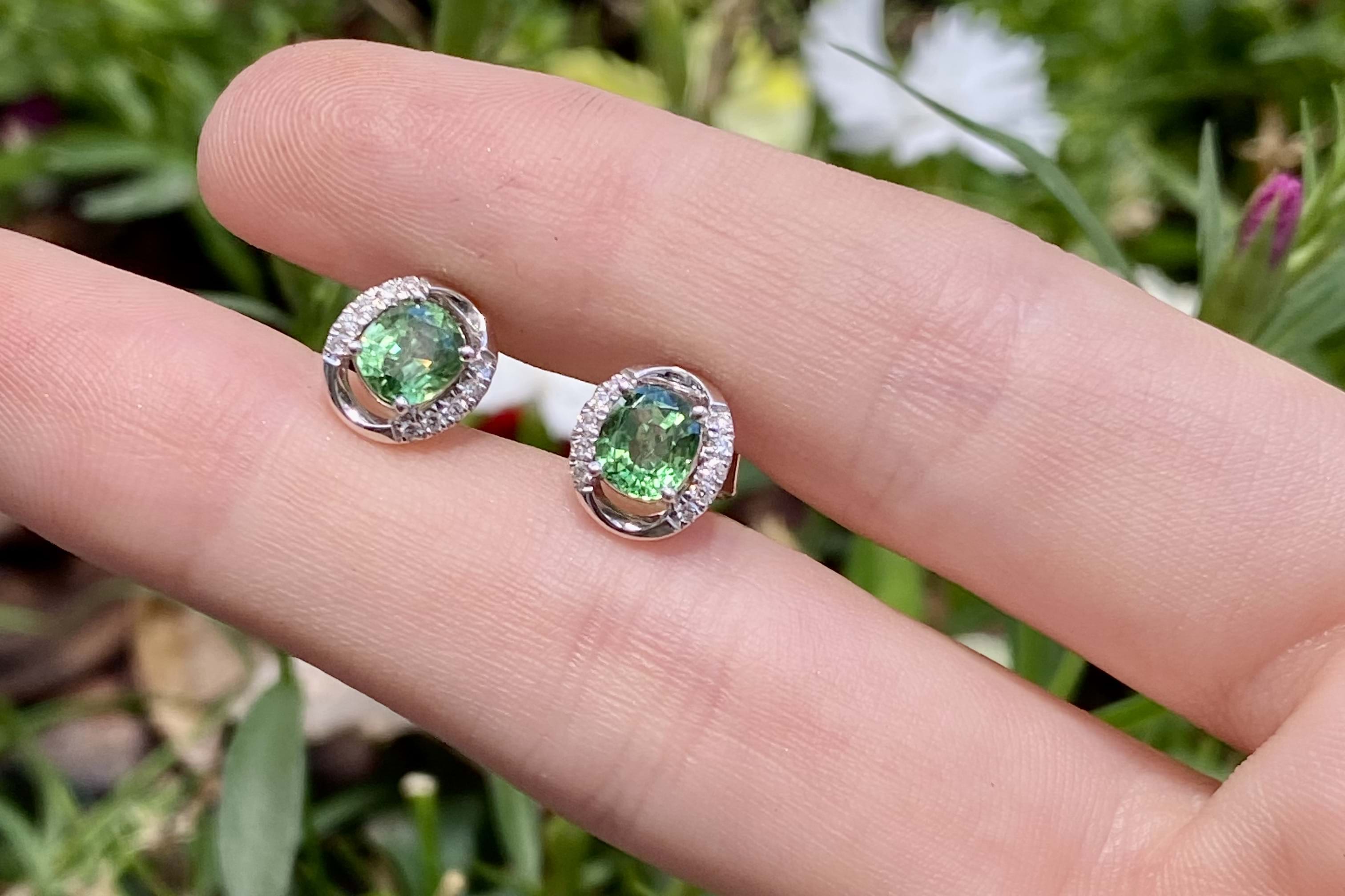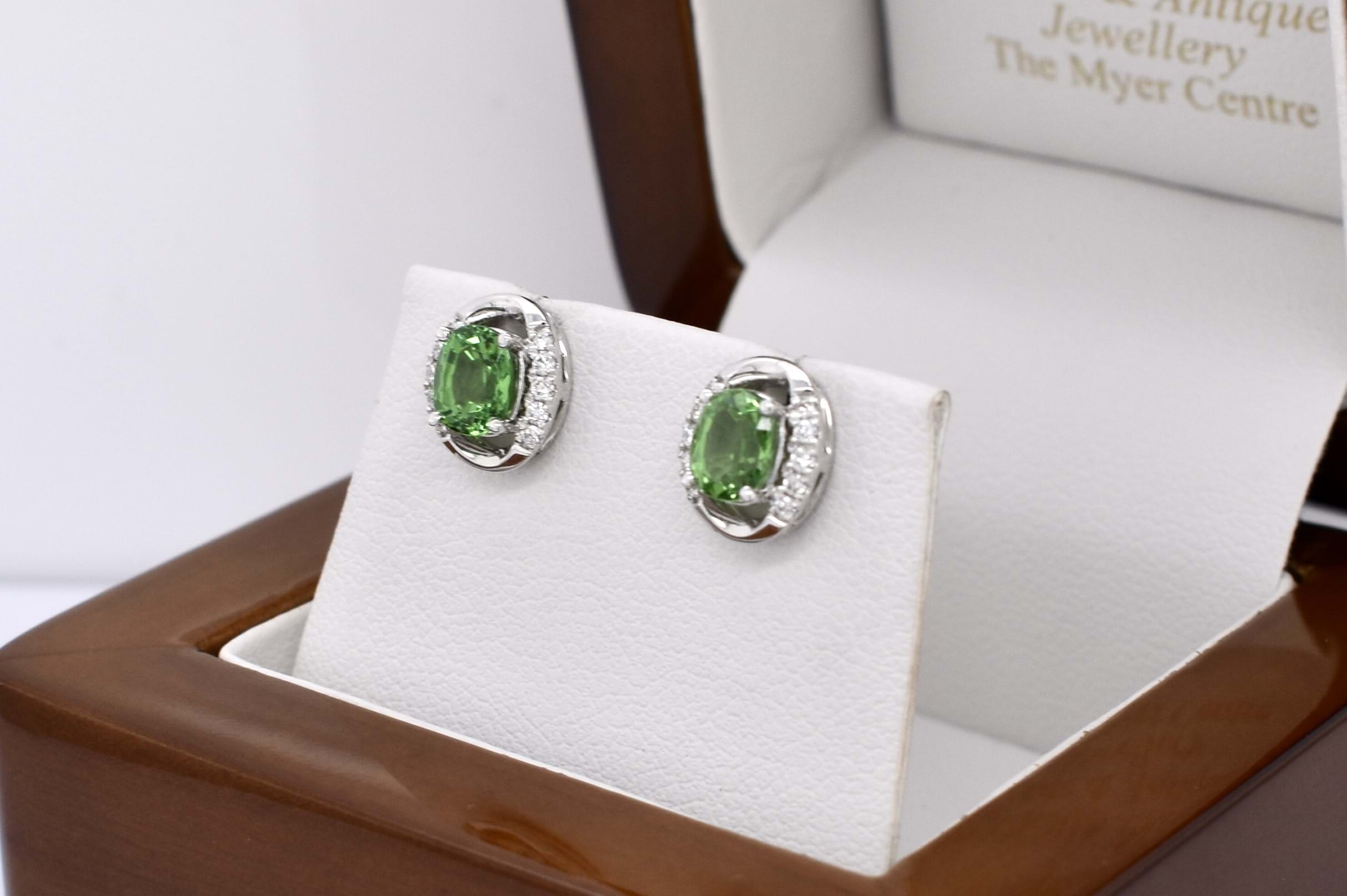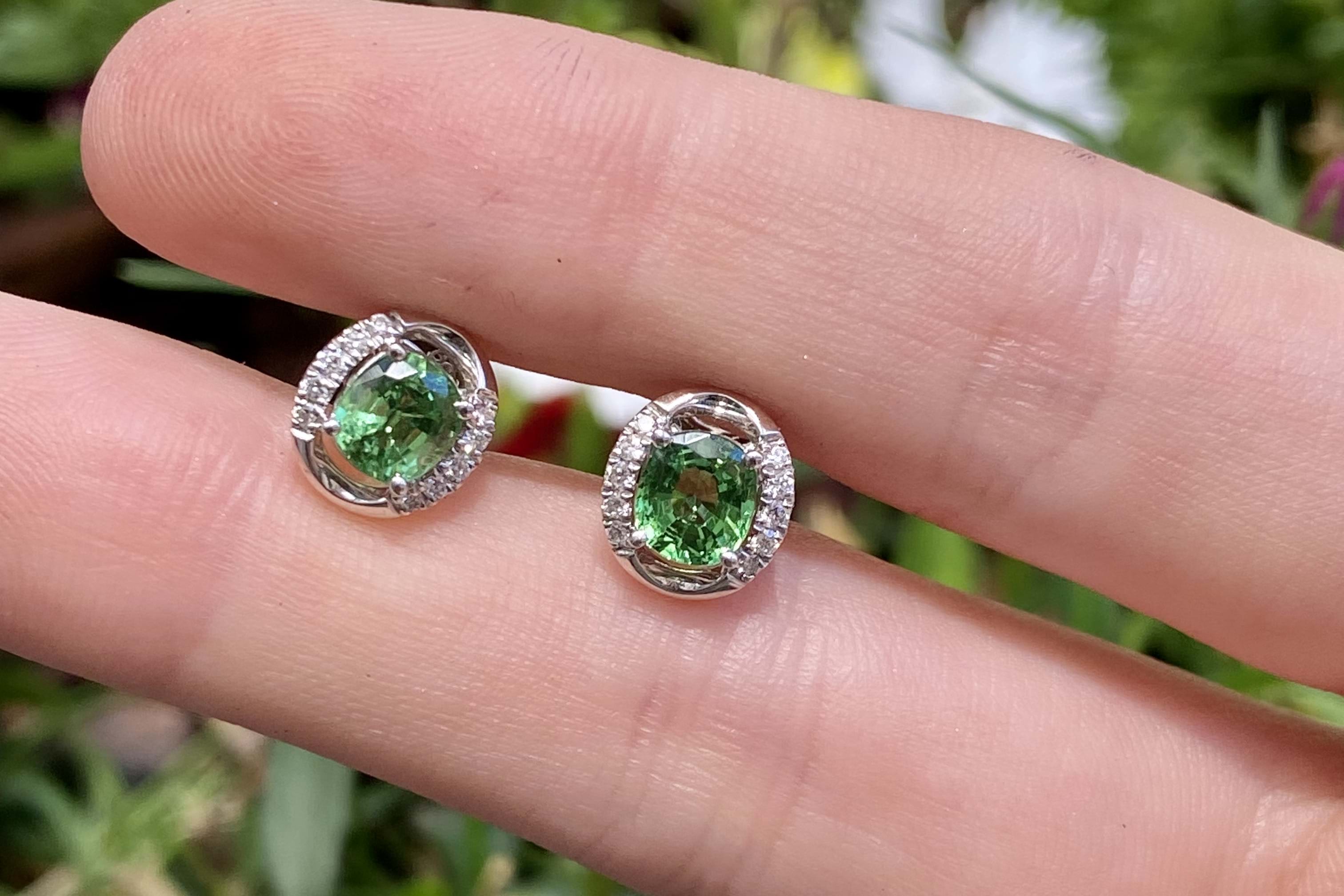 SOLD 18ct White Gold 1.51ct Light Green Tsavorite Garnet & 0.13ct G SI Diamond Oval Studs