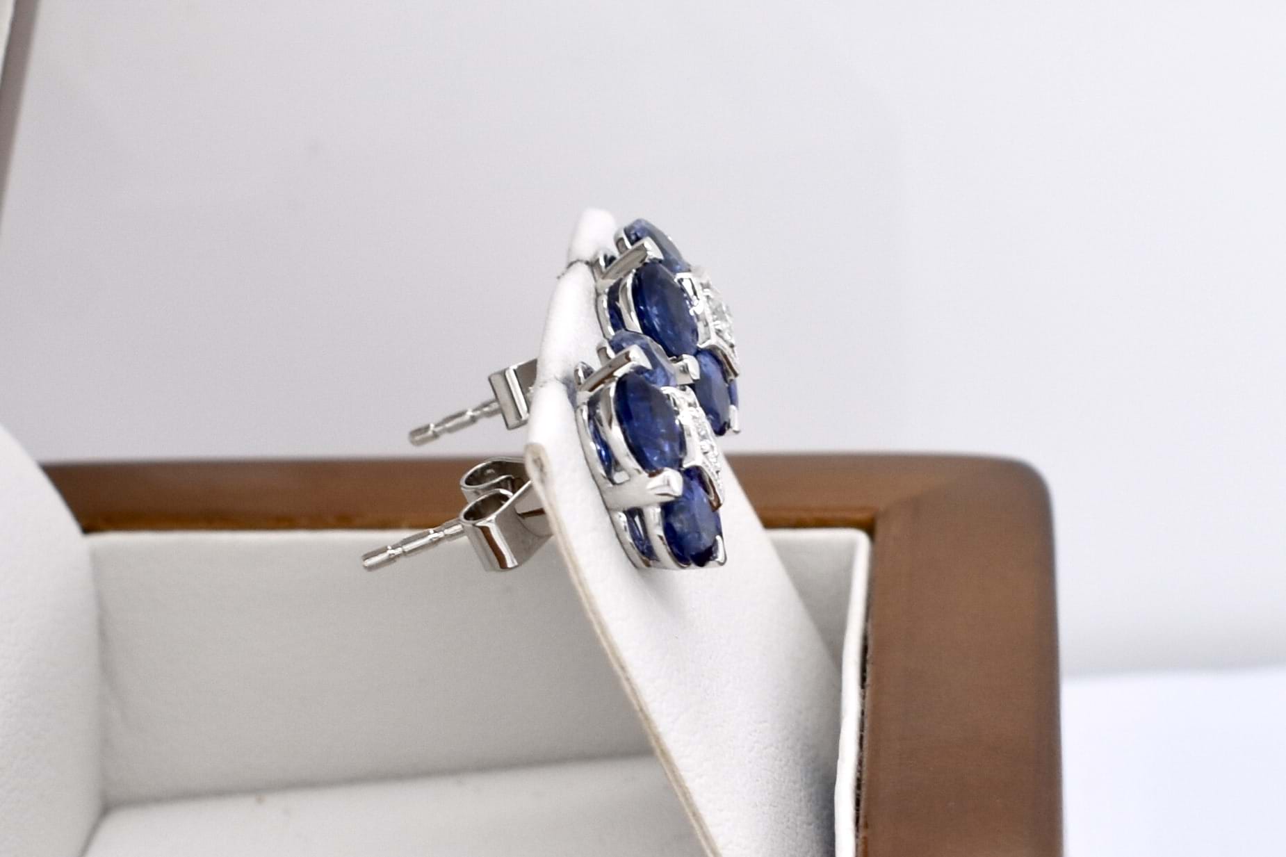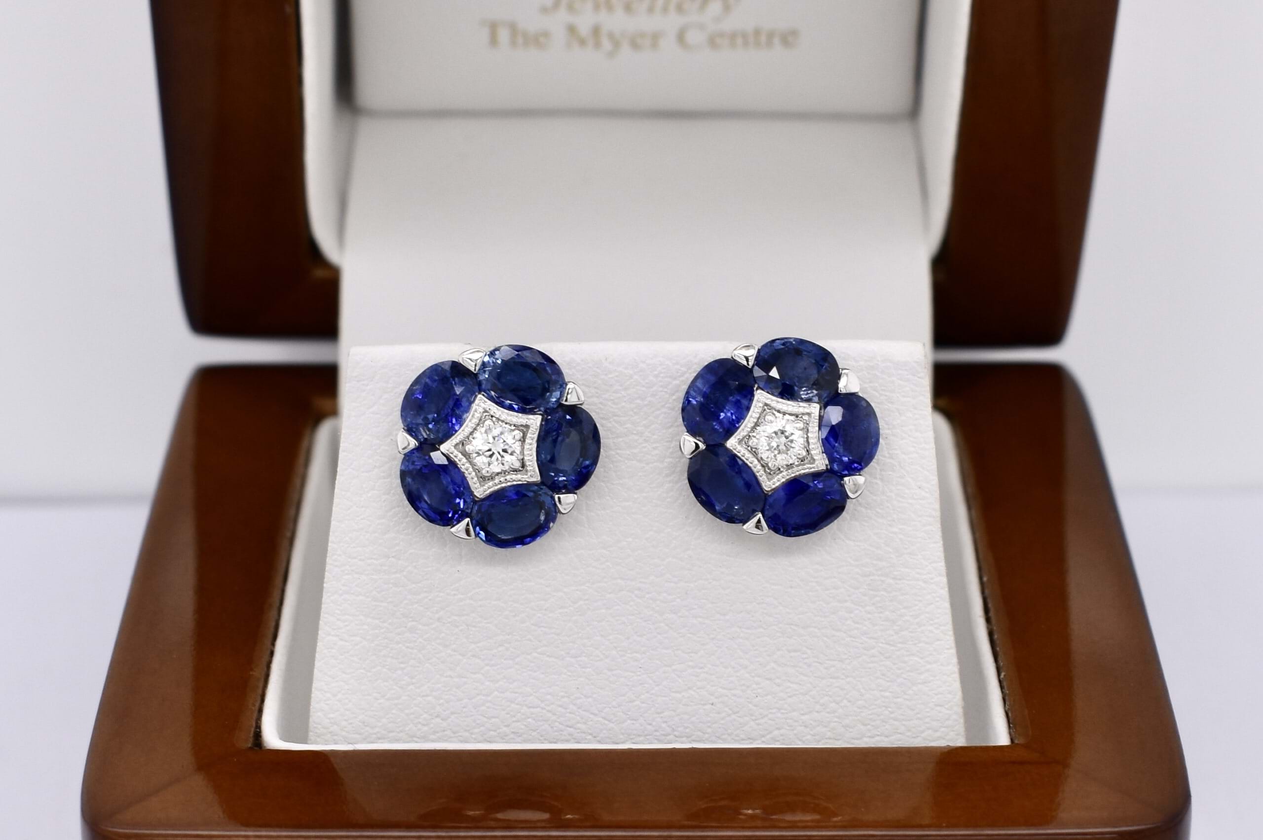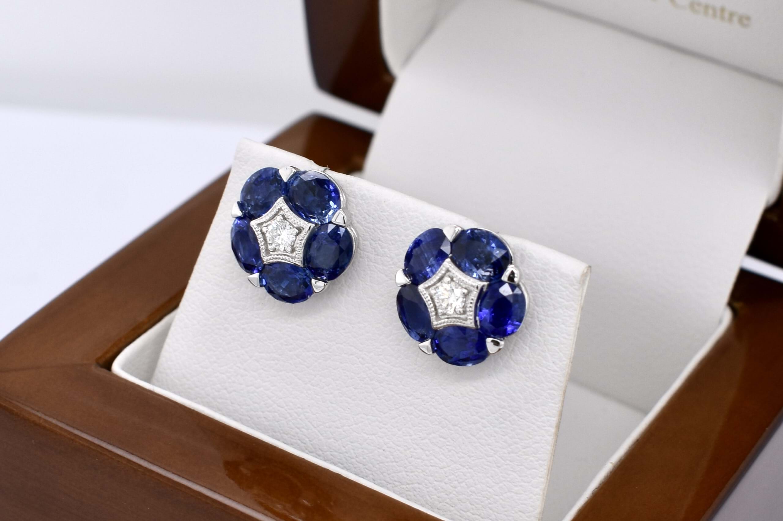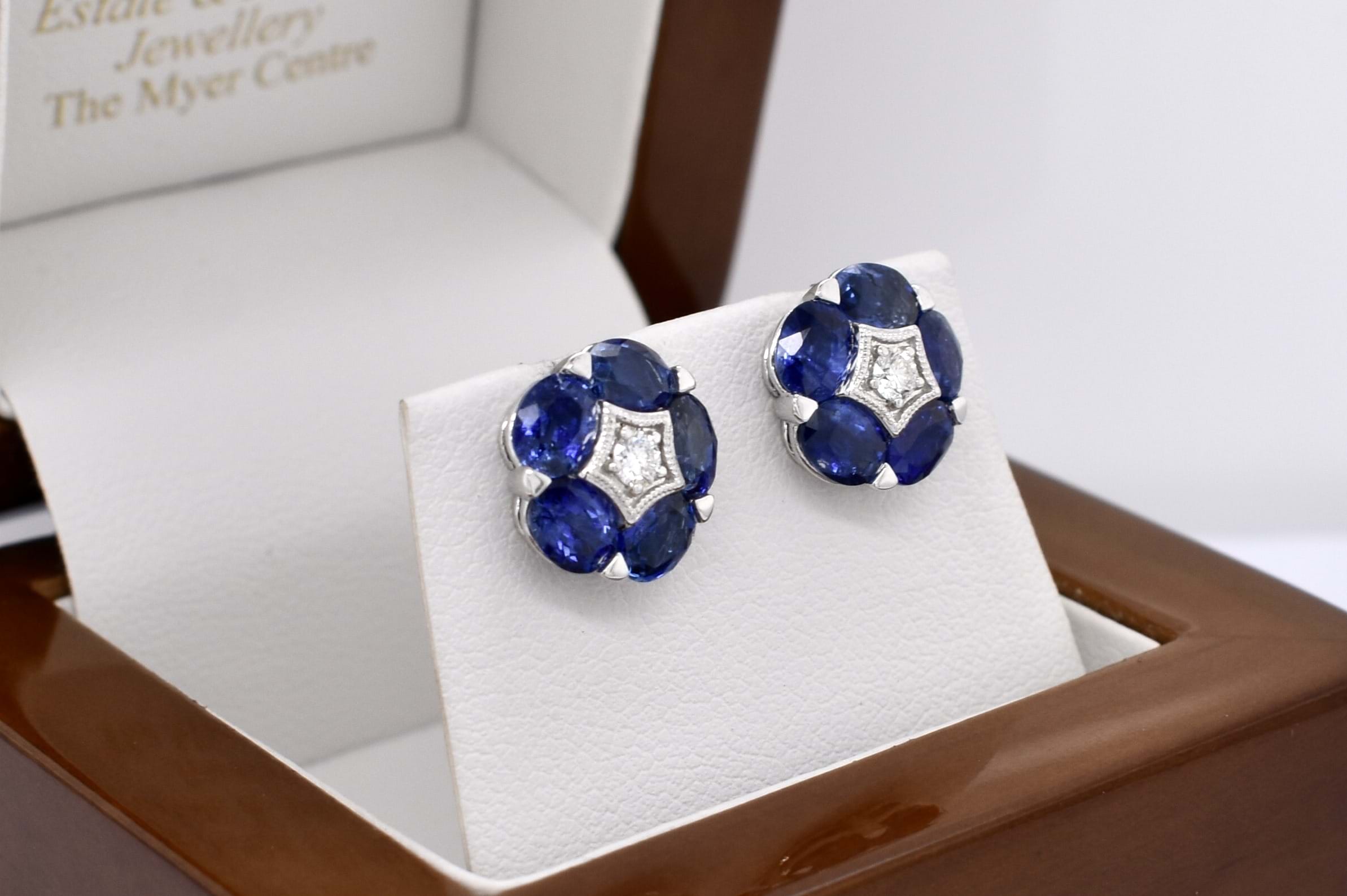 SOLD 18ct White Gold 4.52ct Blue Sapphire & 0.14ct G VS Diamond Flower Cluster Studs