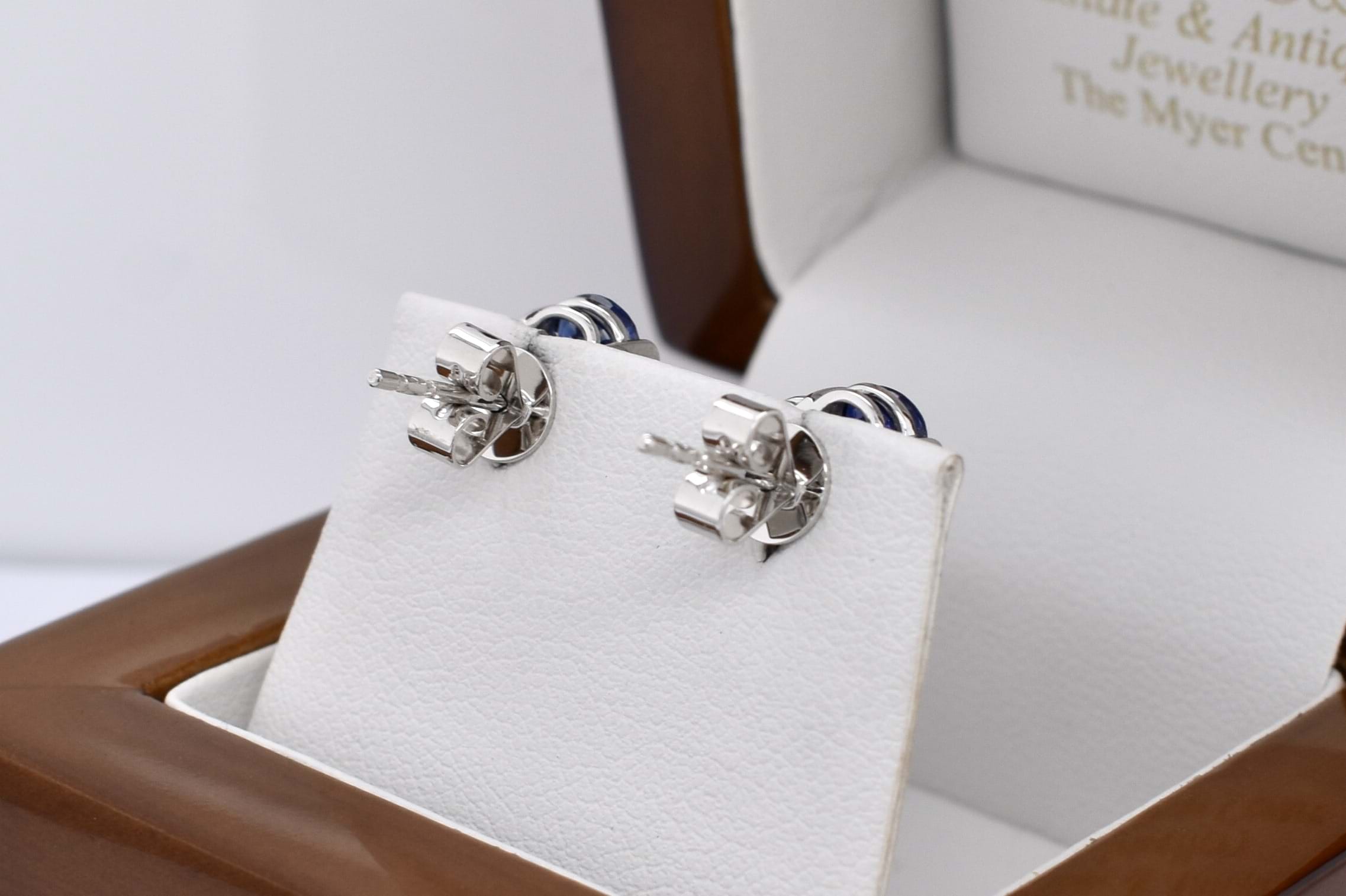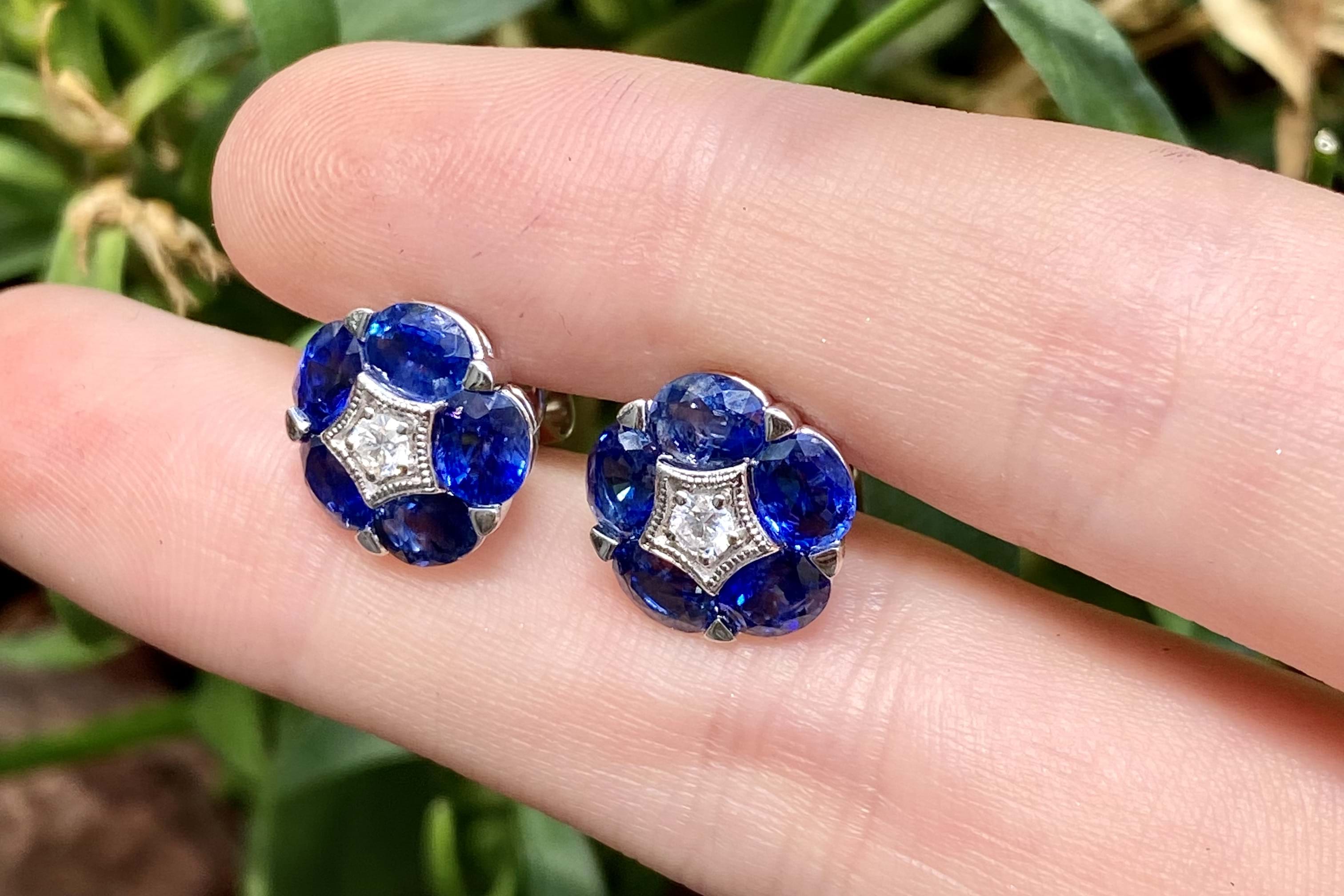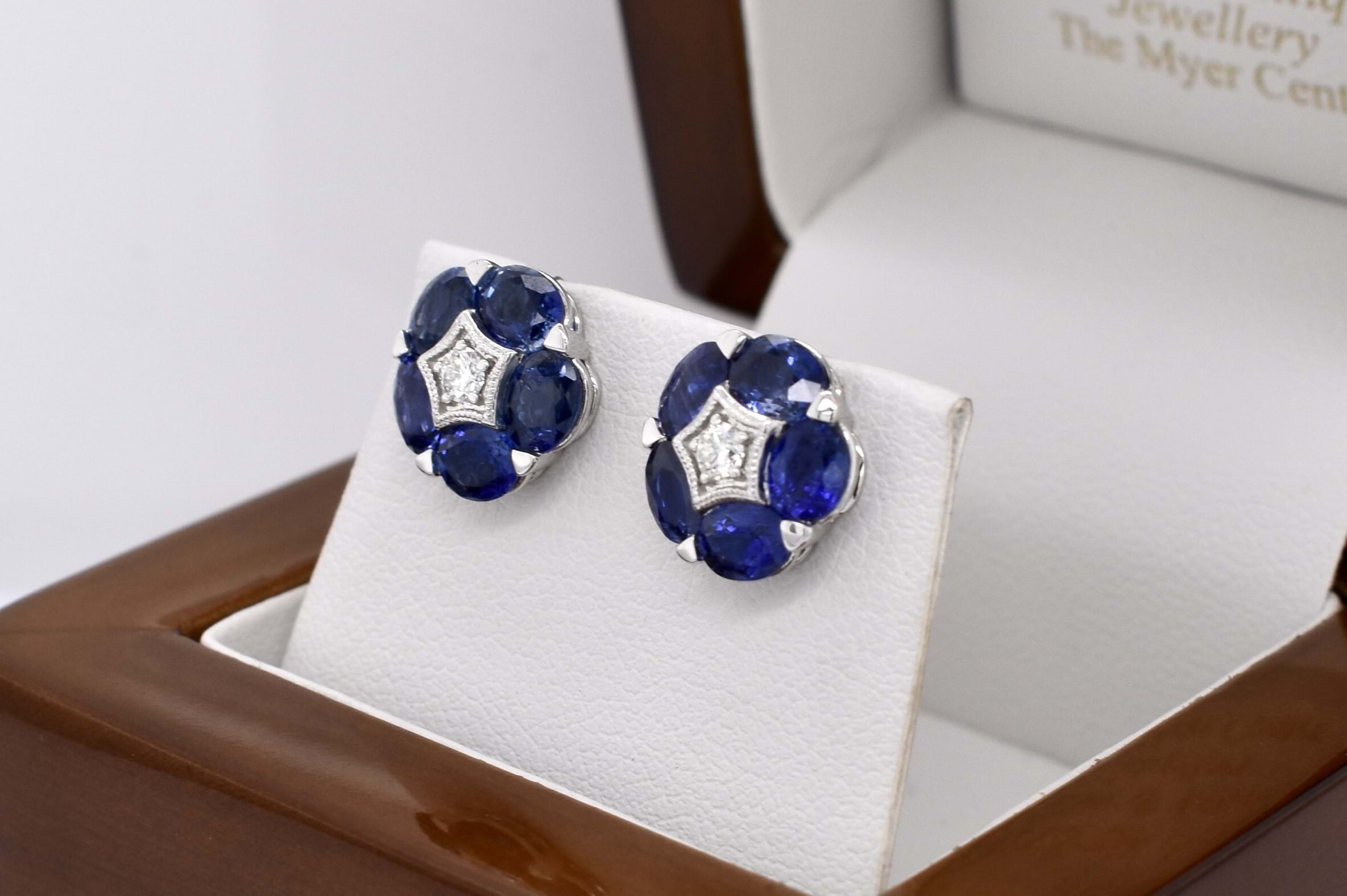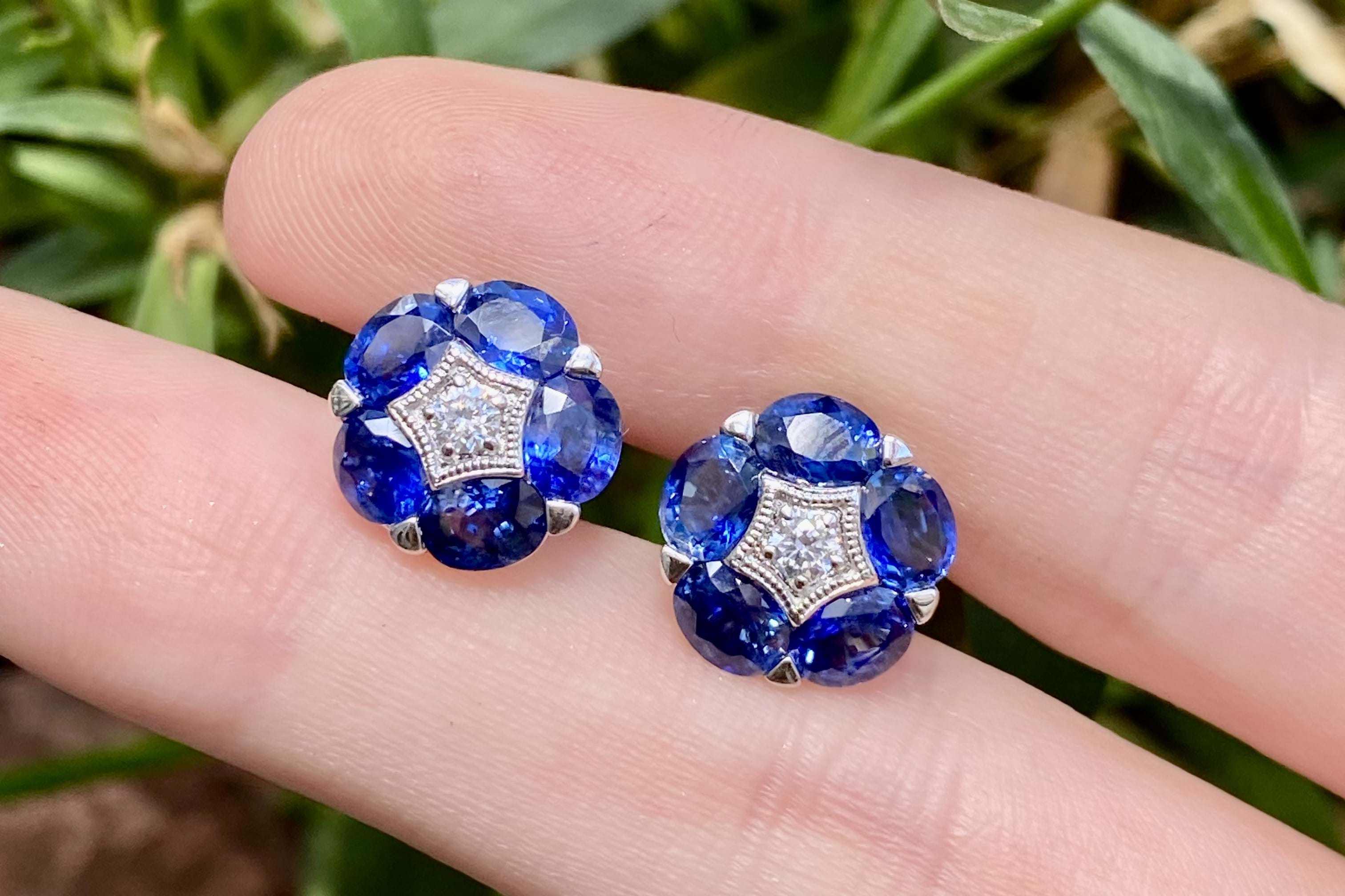 Add the prettiest pop of colour with these 18ct white gold studs, consisting of ten bright dark blue sapphires (5 each ear) measuring 4.80 x 3.90mm, totalling 4.52ct. There is a sparkling round brilliant cut 2.70mm diamond, star grain set, at the centre of each flower. Diamonds equalling 0.14ct GVS. Finished with classic post and butterfly settings. 4.12grams. Independent Valuation Supplied.