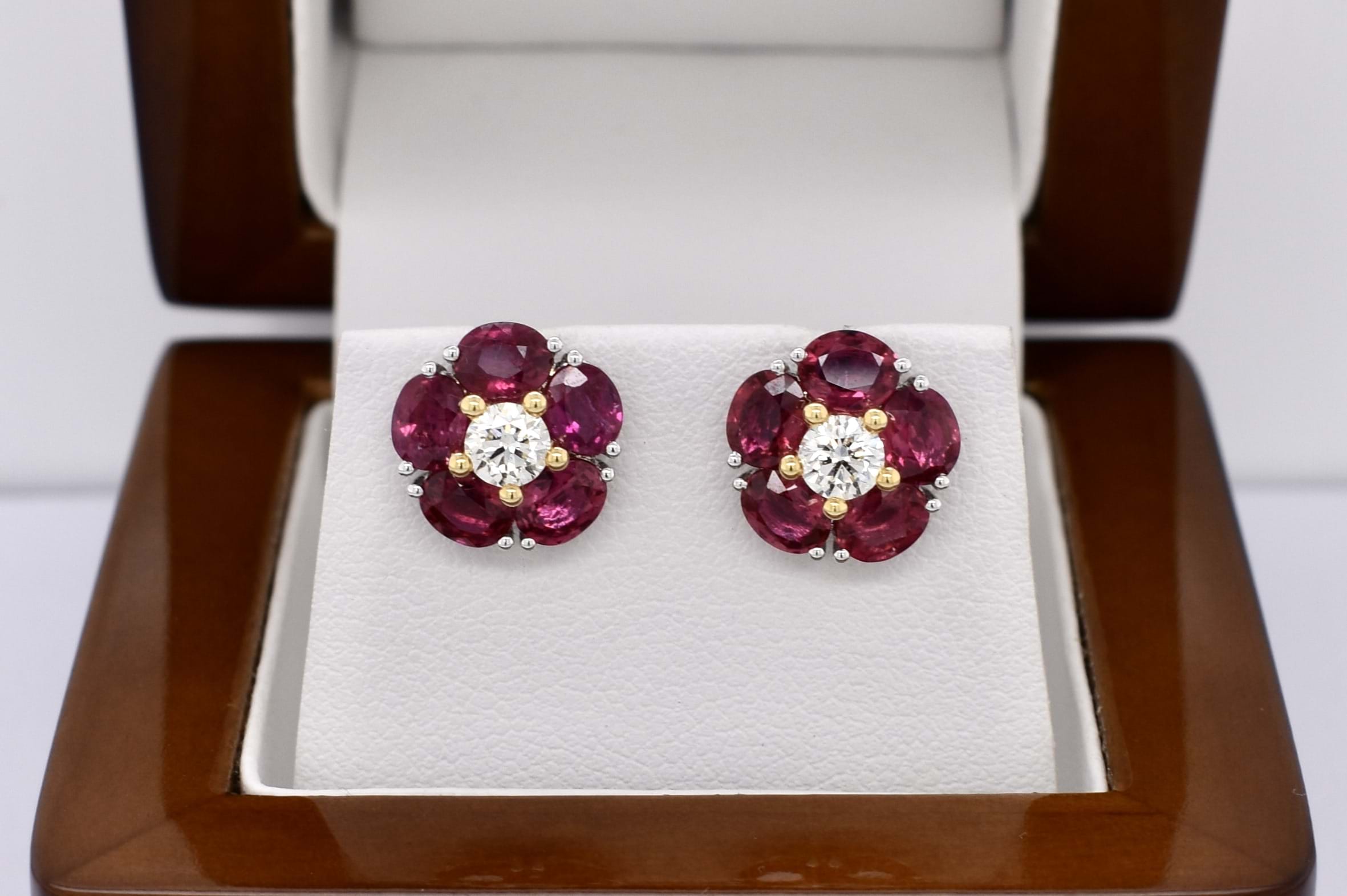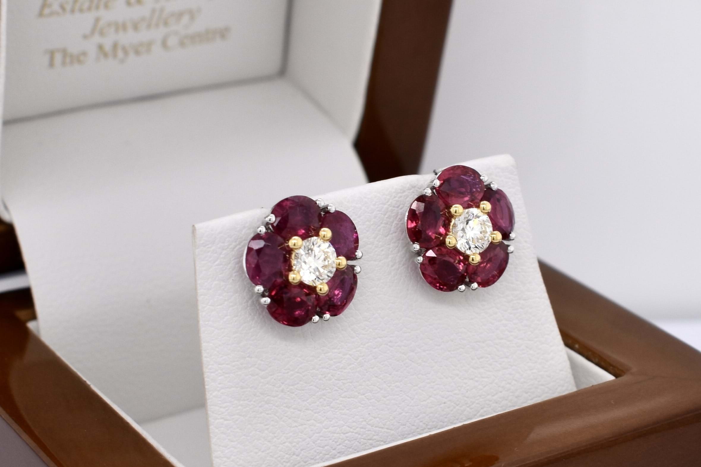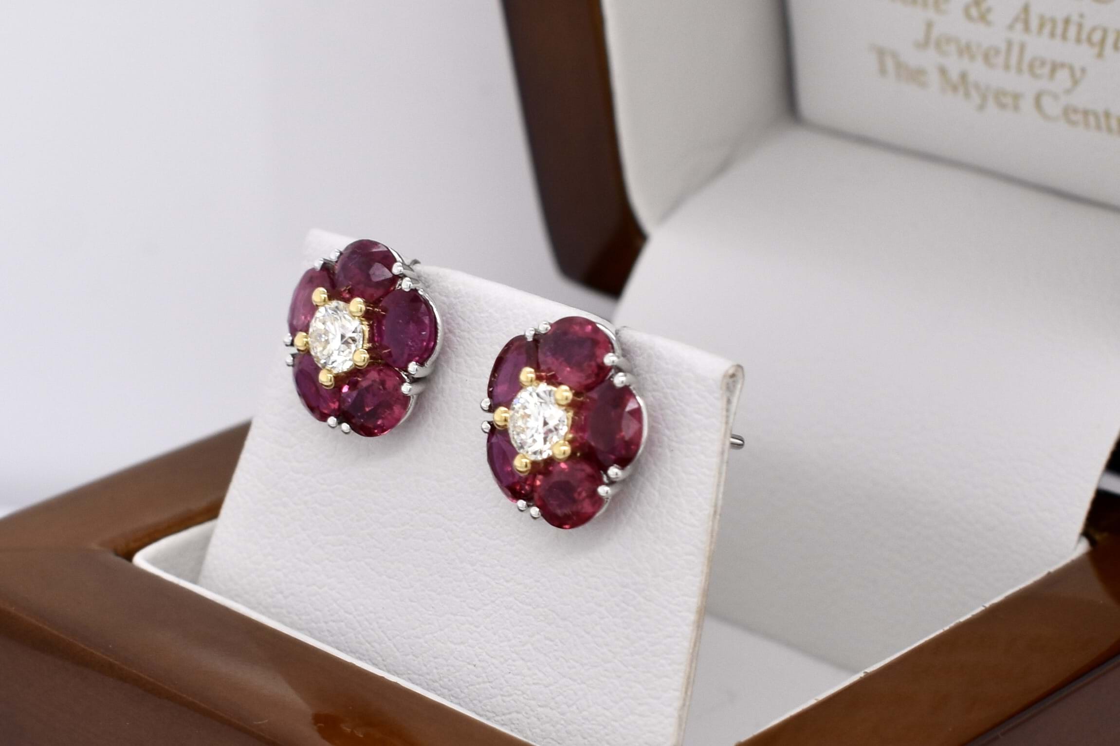 Add the prettiest pop of colour with these 18ct white gold studs, consisting of ten bright dark red eye clean rubies (5 each ear) measuring 4.75 x 3.80mm, totalling 3.82ct. There is a sparkling round brilliant cut 4.10mm diamond, claw set in yellow gold, at the centre of each flower. Diamonds equalling 0.54ct J VS. Finished with classic post and butterfly settings. 4.11grams. Independent Valuation Supplied.