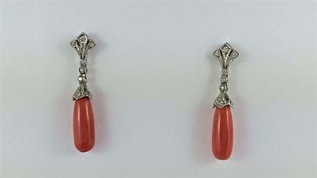 A beautiful pair of Art Deco inspired earrings in 9ct white gold with Coral & Diamonds. Independent Valuation supplied.