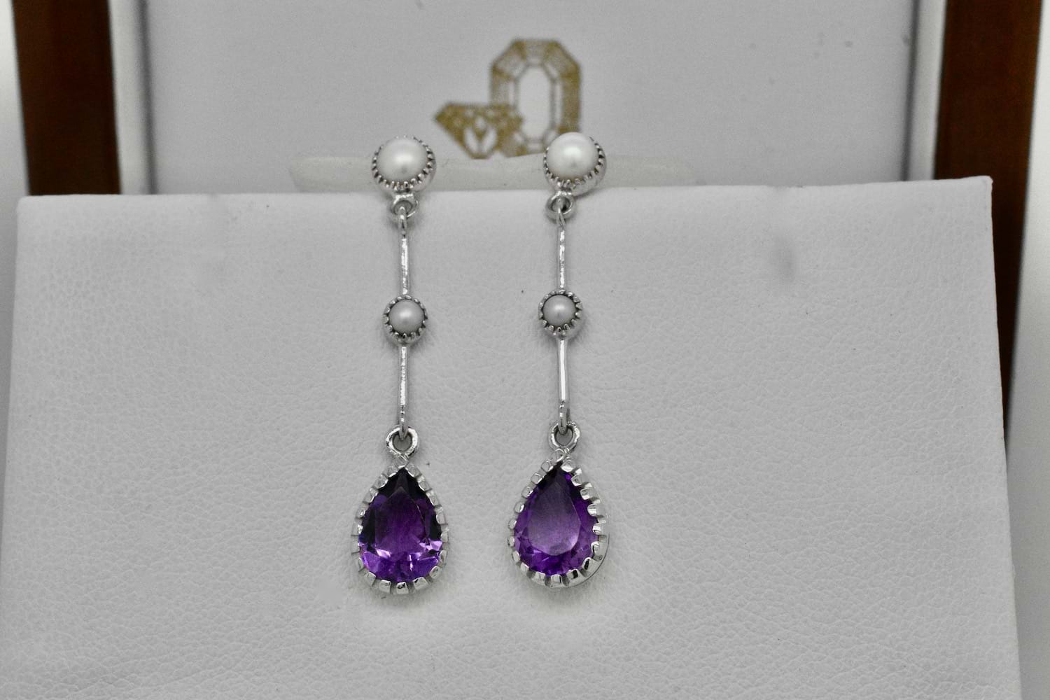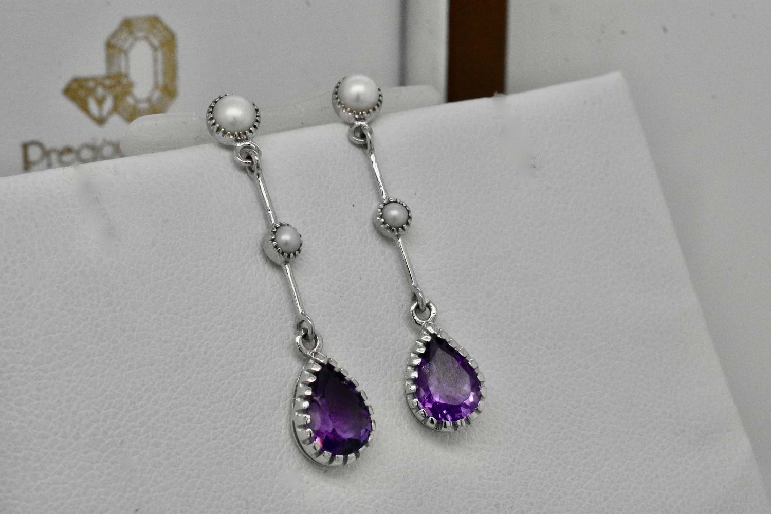 SOLD 9ct White Gold Amethyst & Freshwater Pearl Drop Earrings