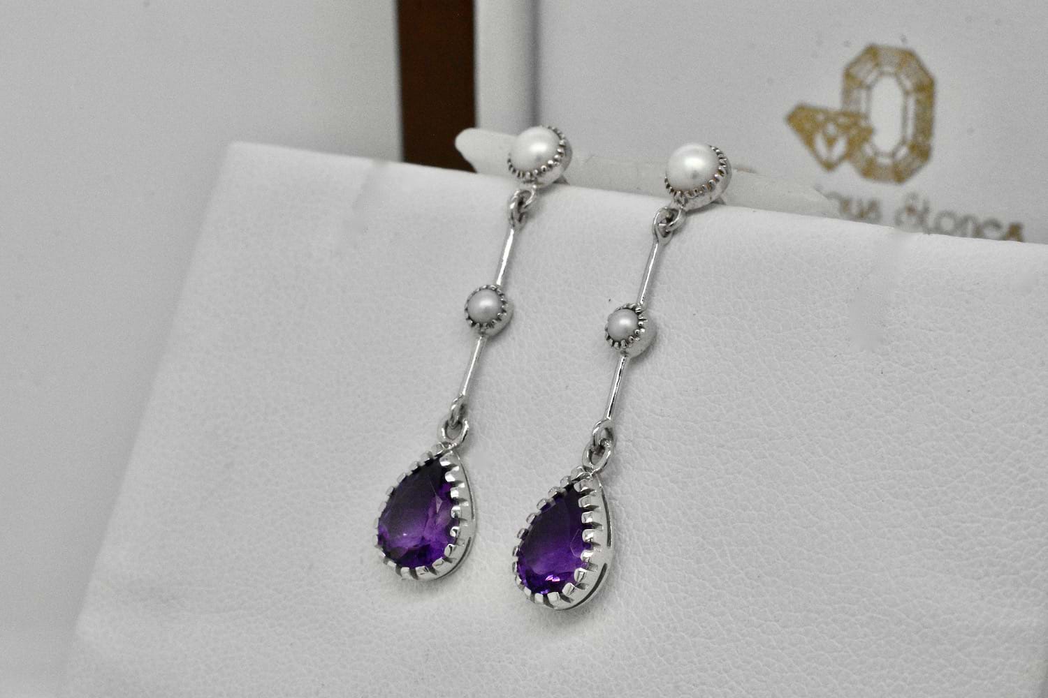 Pretty and feminine drop earrings crafted in 9ct white gold with a round seed pearl stud top, a small drop with another white seed pearl followed by a final bar and pearshape amethyst suspended from the bottom.