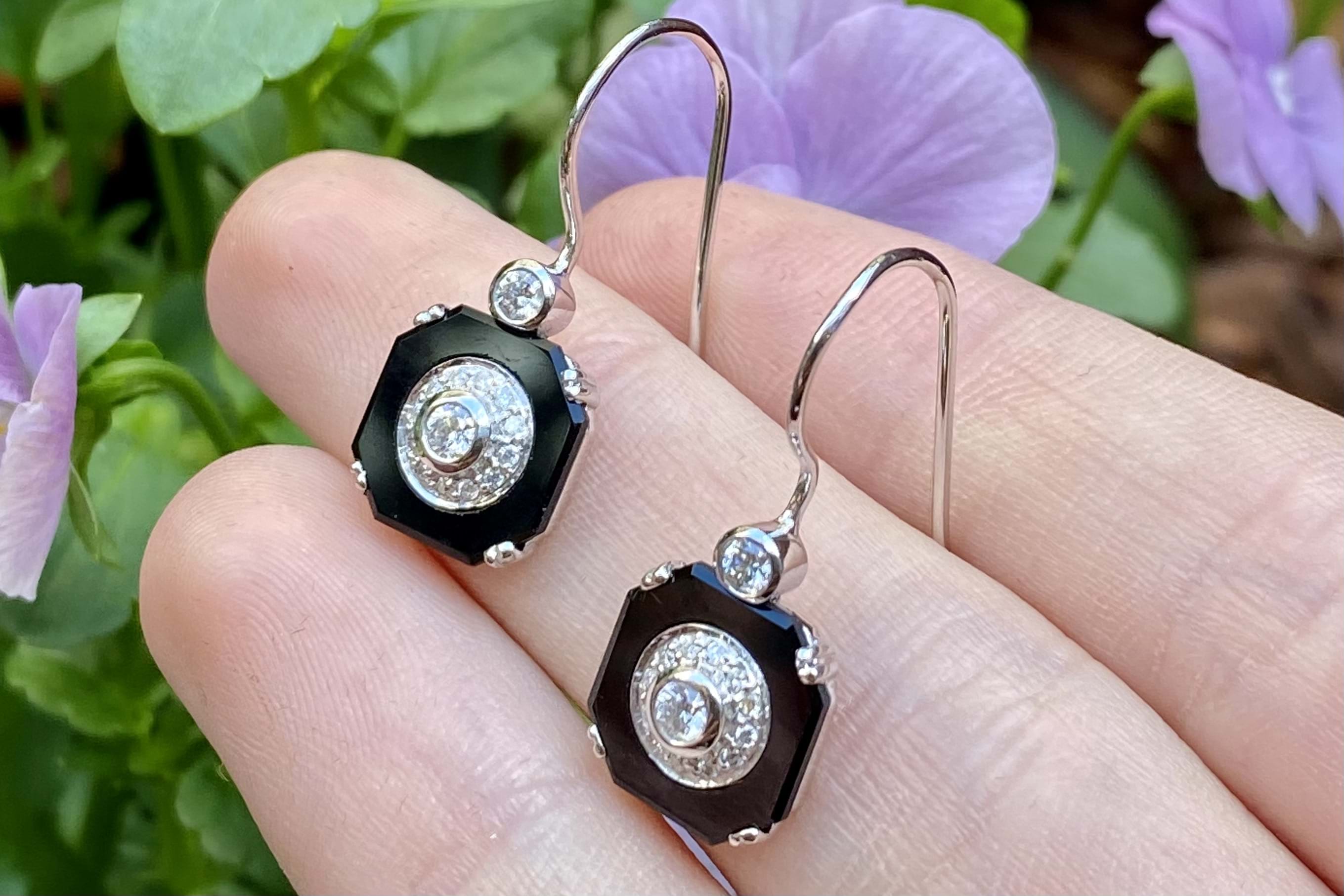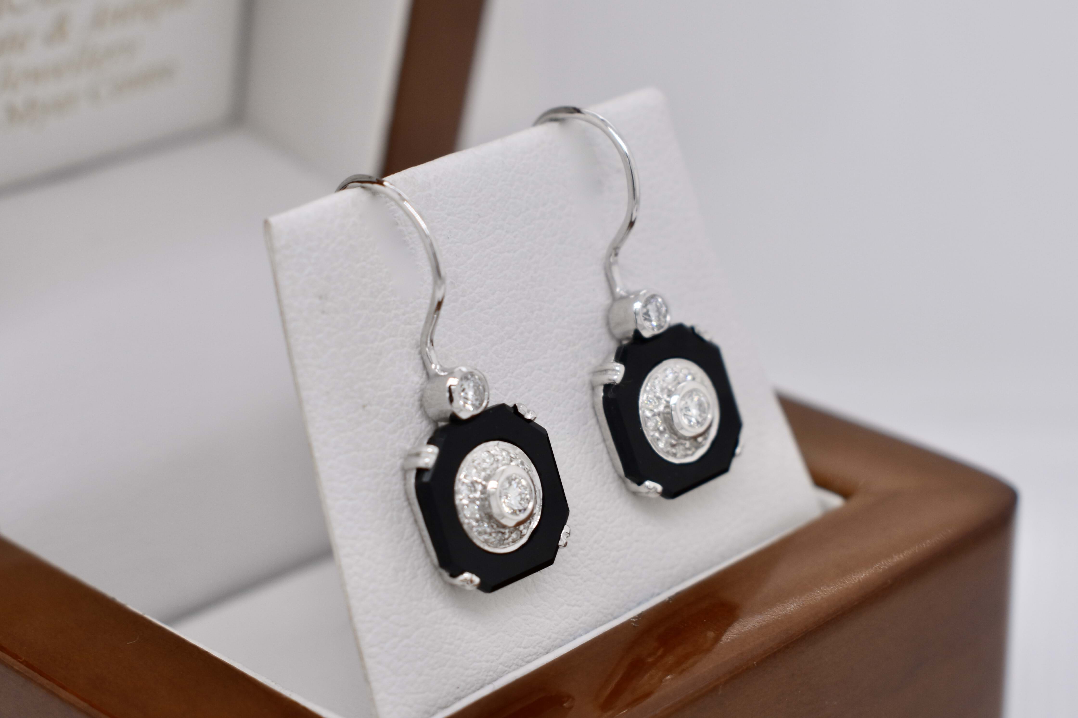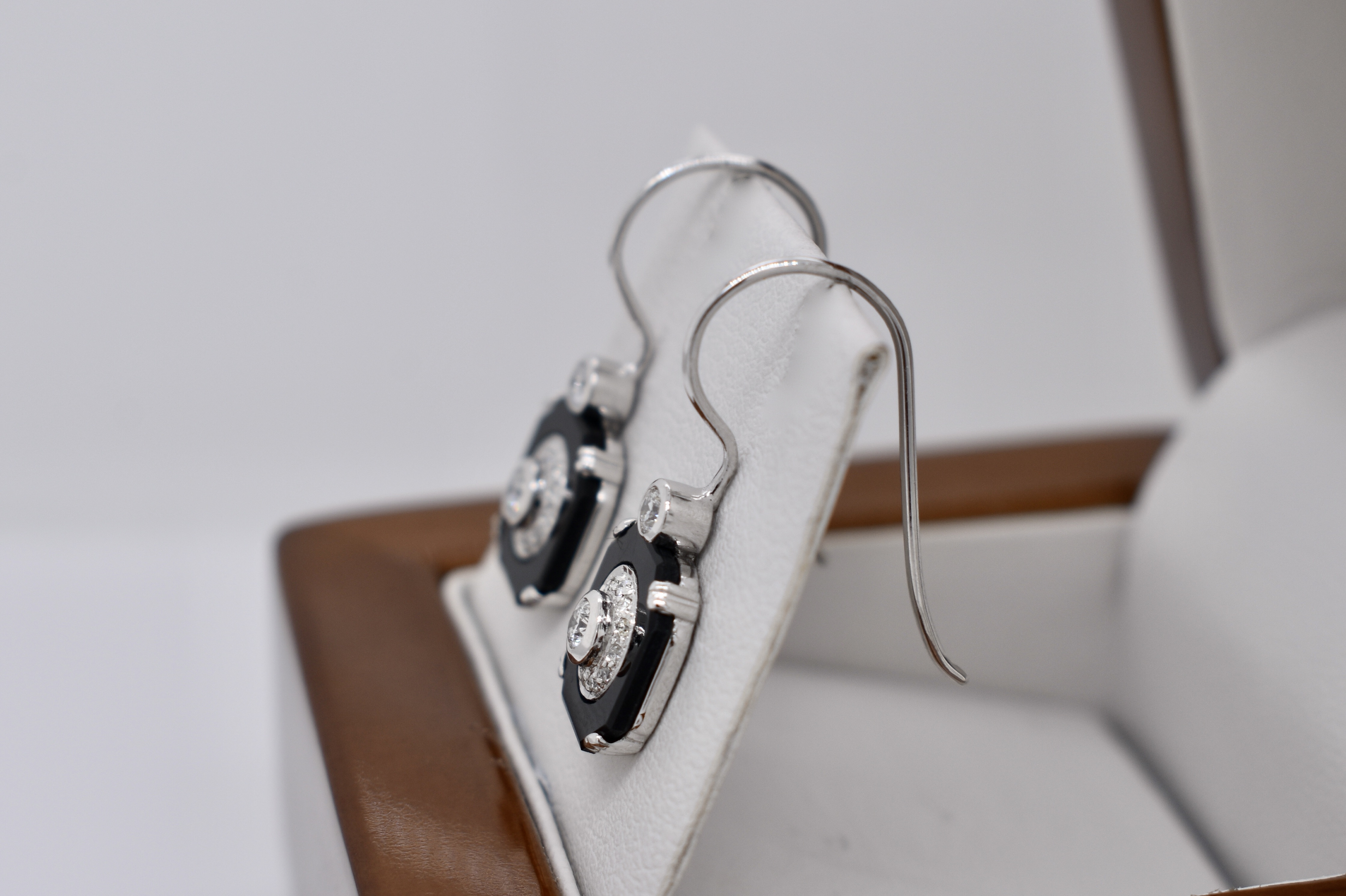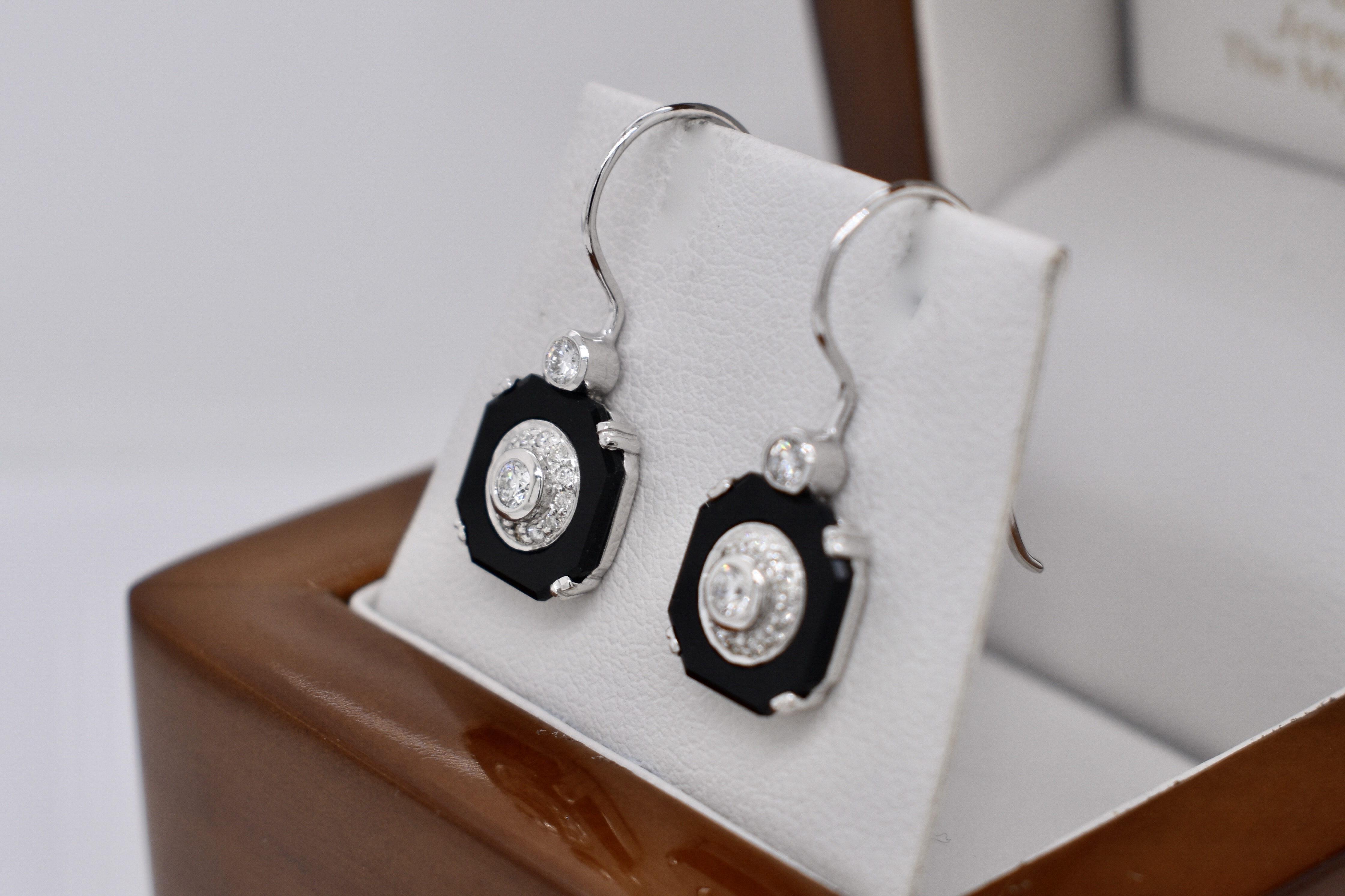 SOLD 9ct White Gold Onyx & Diamond Deco Style Drop Earrings