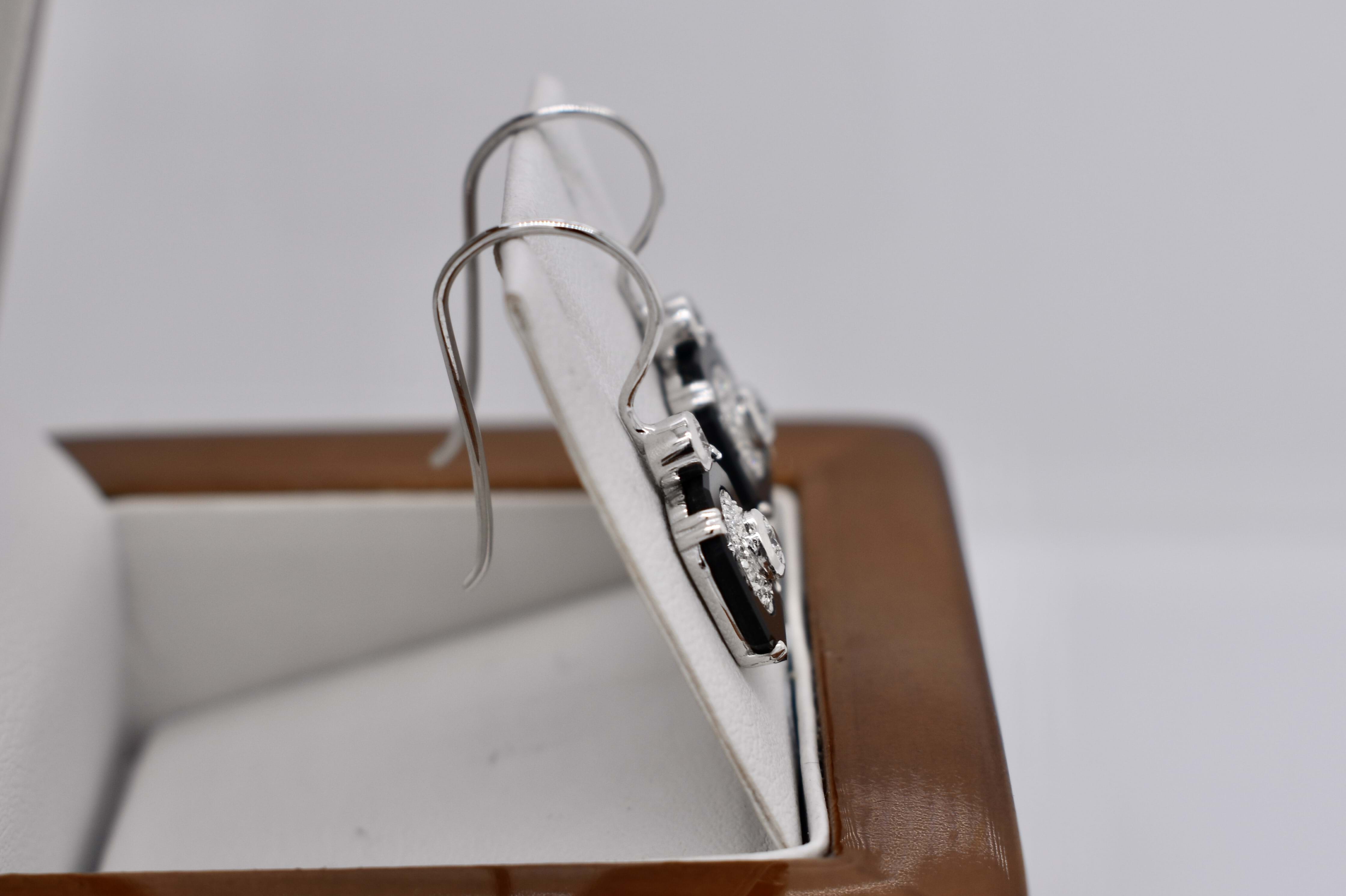 Art Deco inspired earrings crafted in 9ct white gold feature square emerald cut panel of black onyx with a central feature of shimmering diamonds totalling 0.36cts G/H SI-P1 suspended from shepherd hook fittings. Independent Valuation Supplied