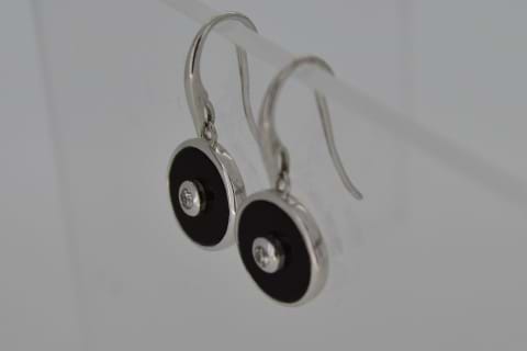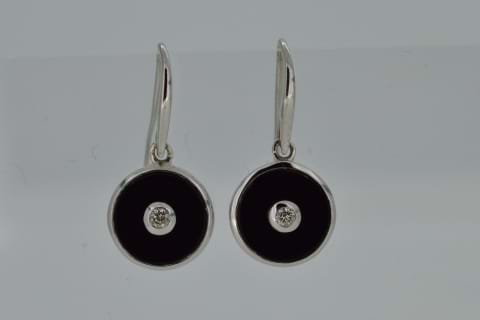 Classic round drops featuring round black onyx bezel set in 9ct white gold with a sparkling round diamond bezel set in the centre and suspended from shepherd hook fittings.