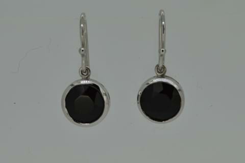 Simple and contemporary. A 9ct white gold pair of earrins featuring round faceted black onyx bezel set, suspended from shepherd hook fittings.
