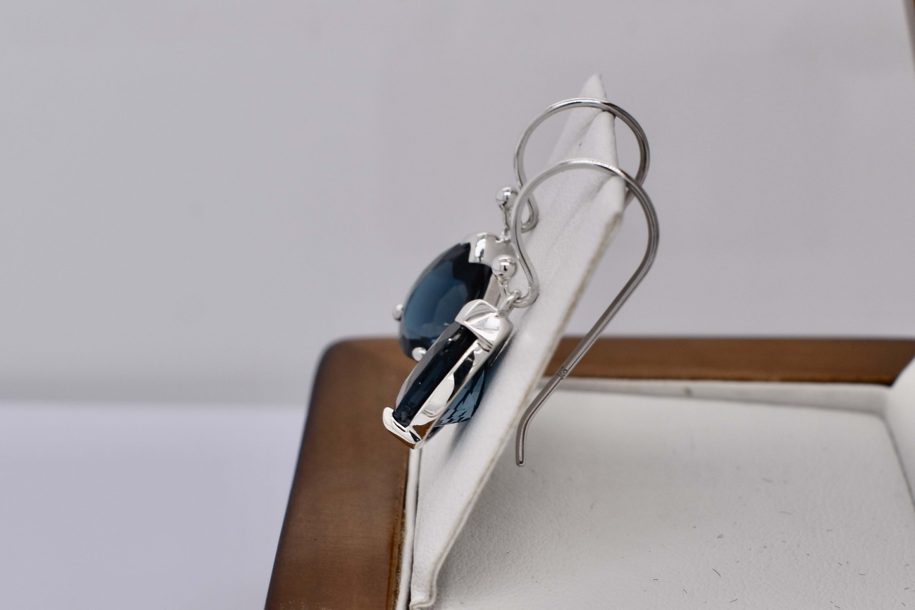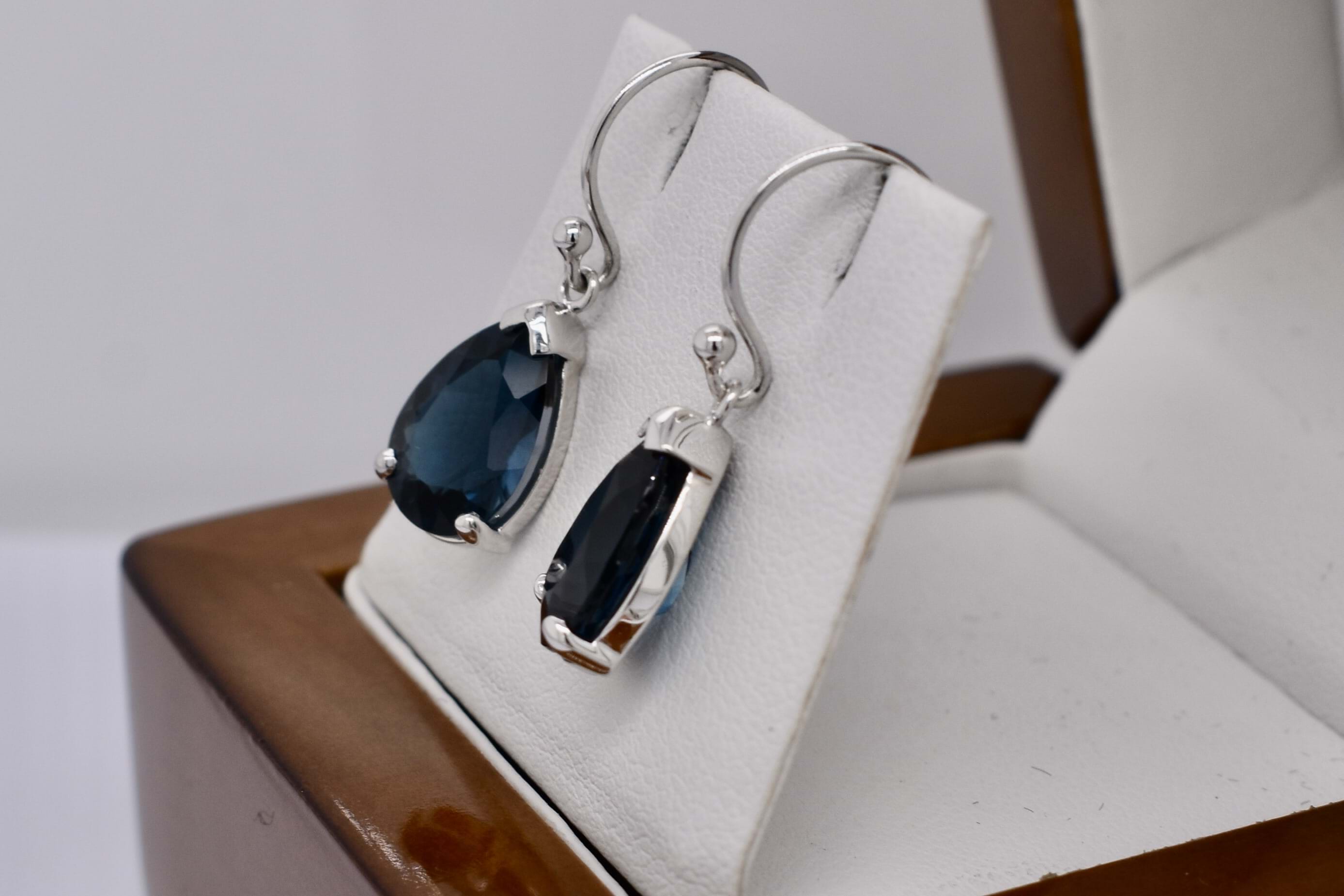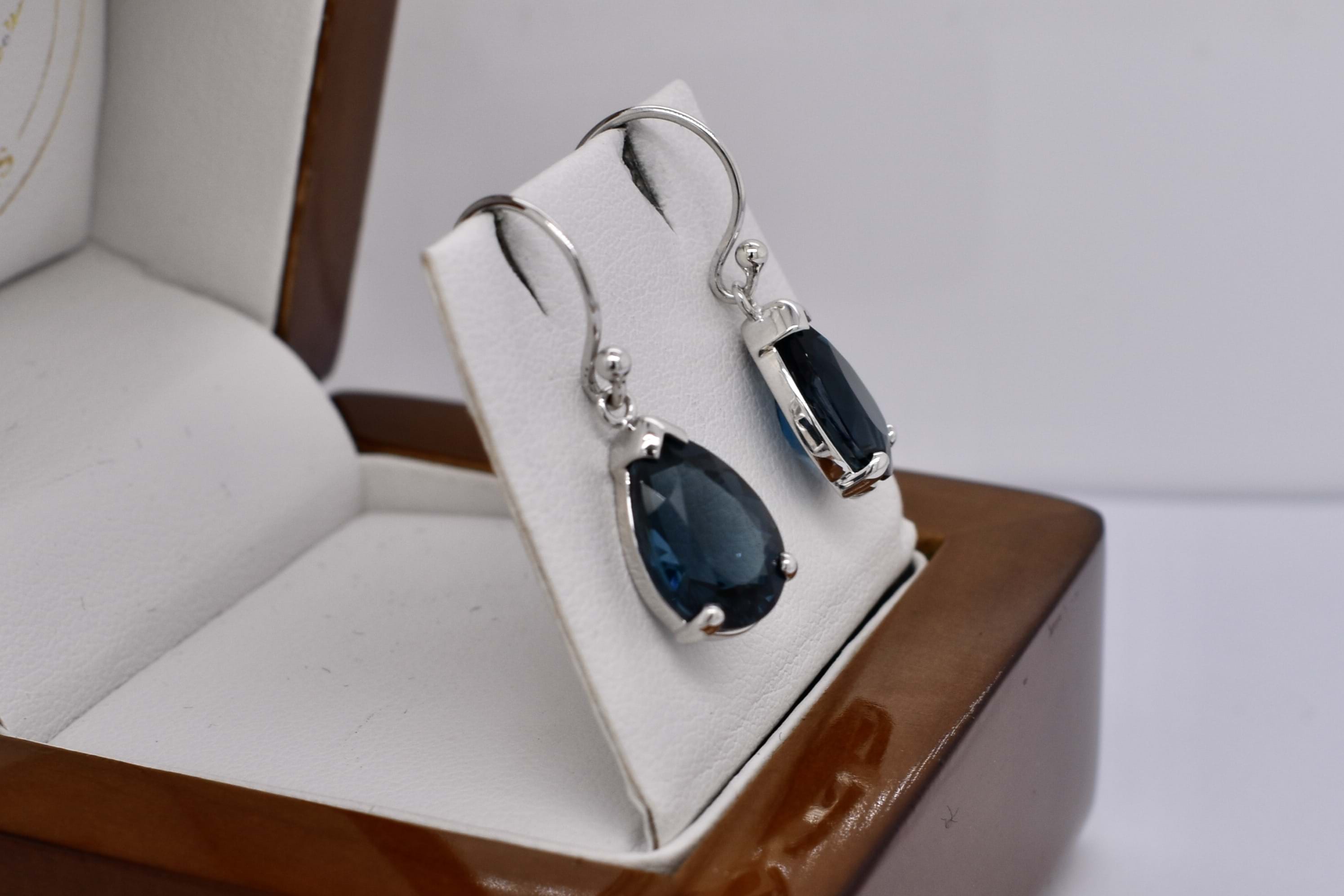 This gorgeous pair of pear shaped drops, features two beautiful London blue topaz stones measuring 12.4x7.7mm, two claw and cap set in 9ct white gold with shepherd hook fittings.