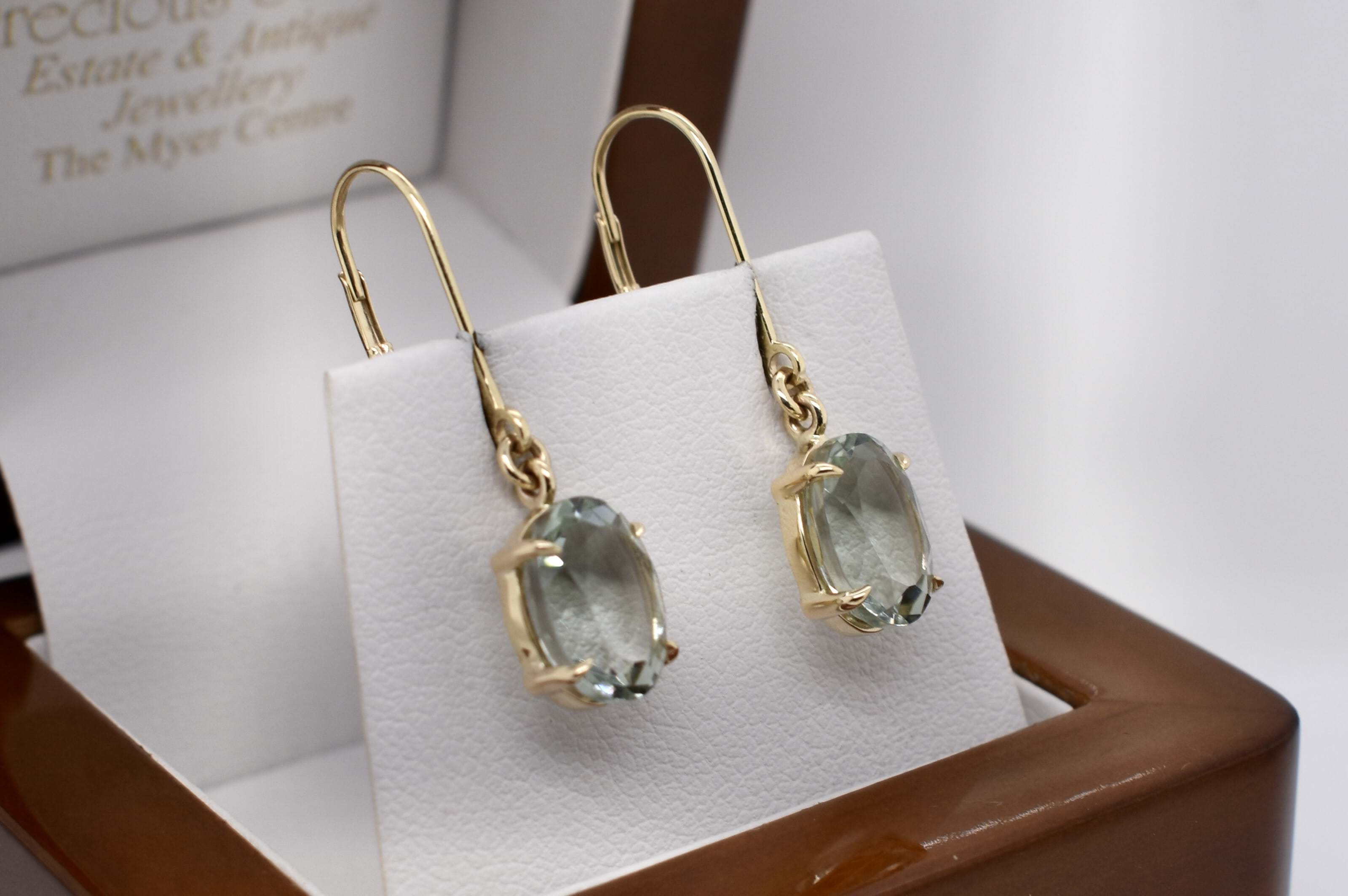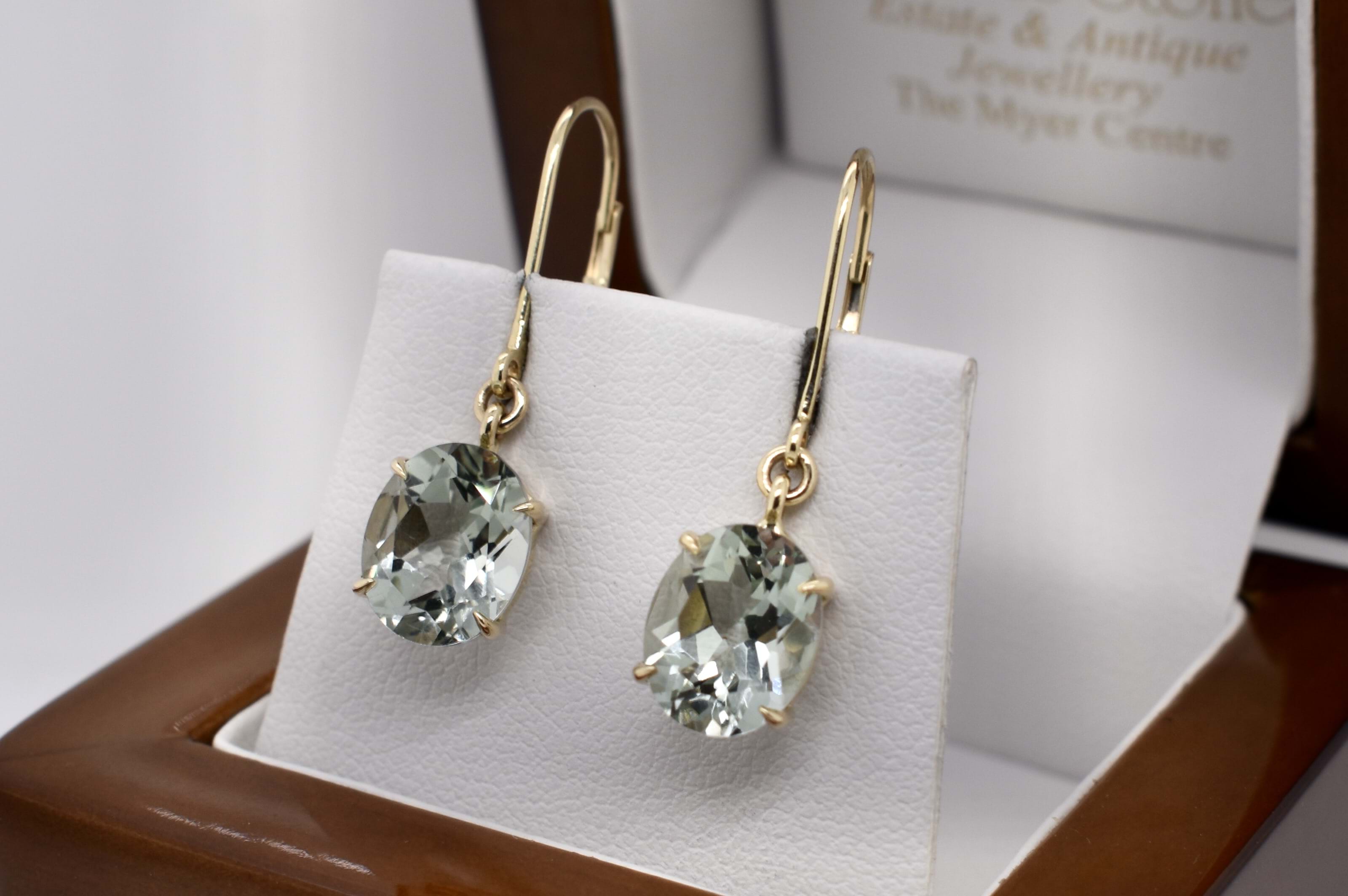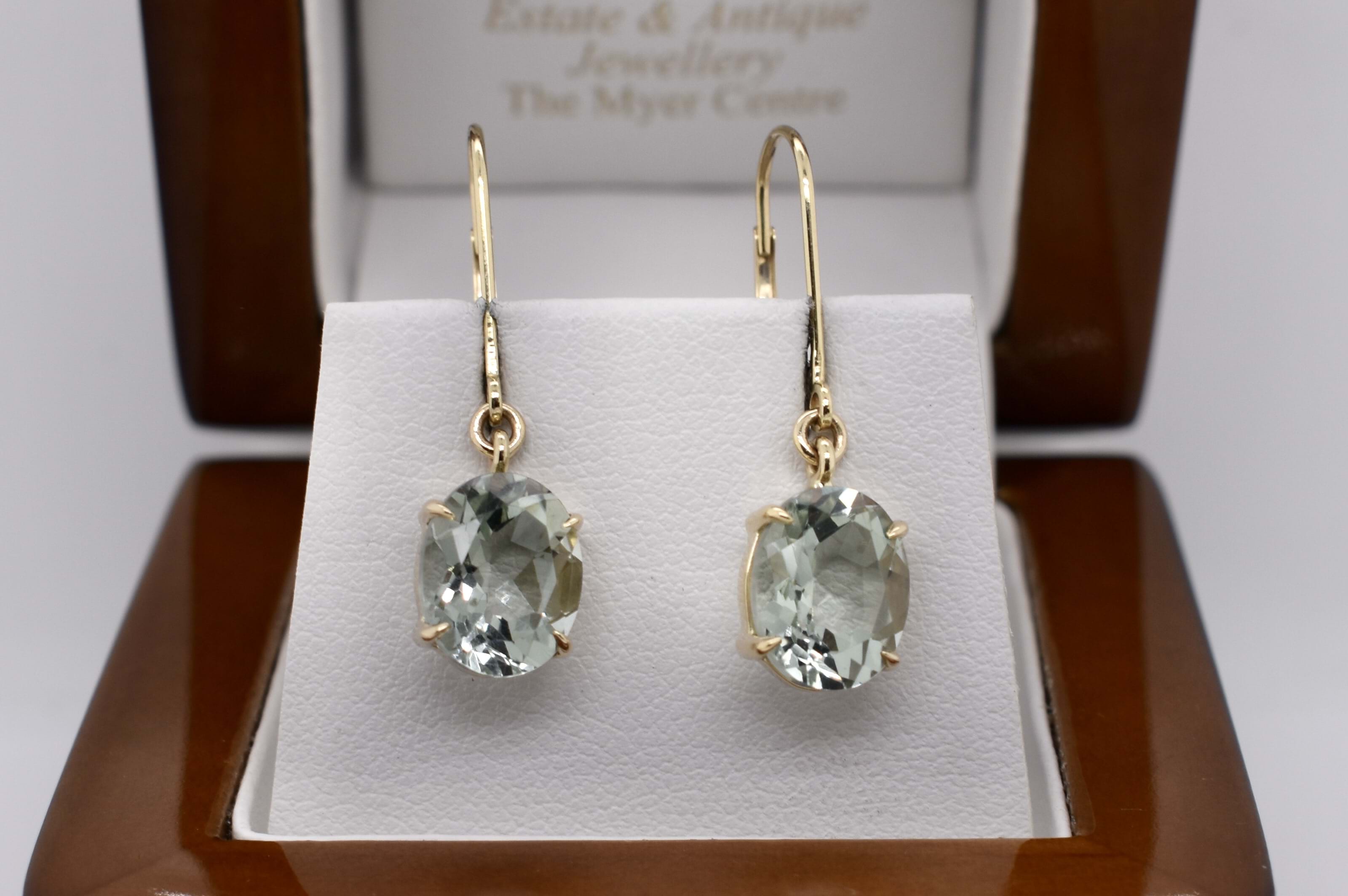 Beautiful oval shaped prasiolite drops, measuring 10.0x8.0mm, bezel set in 9ct yellow gold. Completed with secure euroclip fittings.