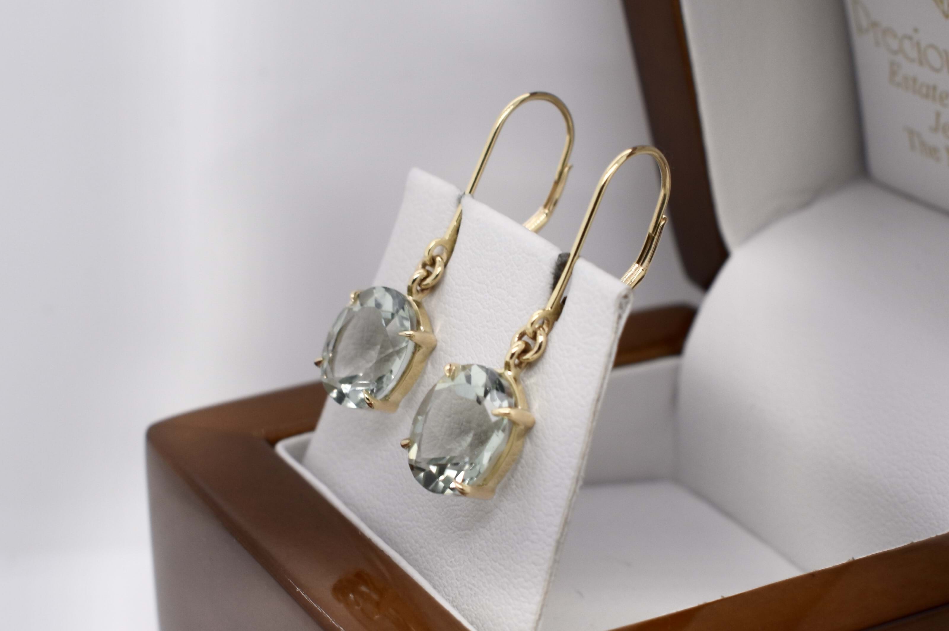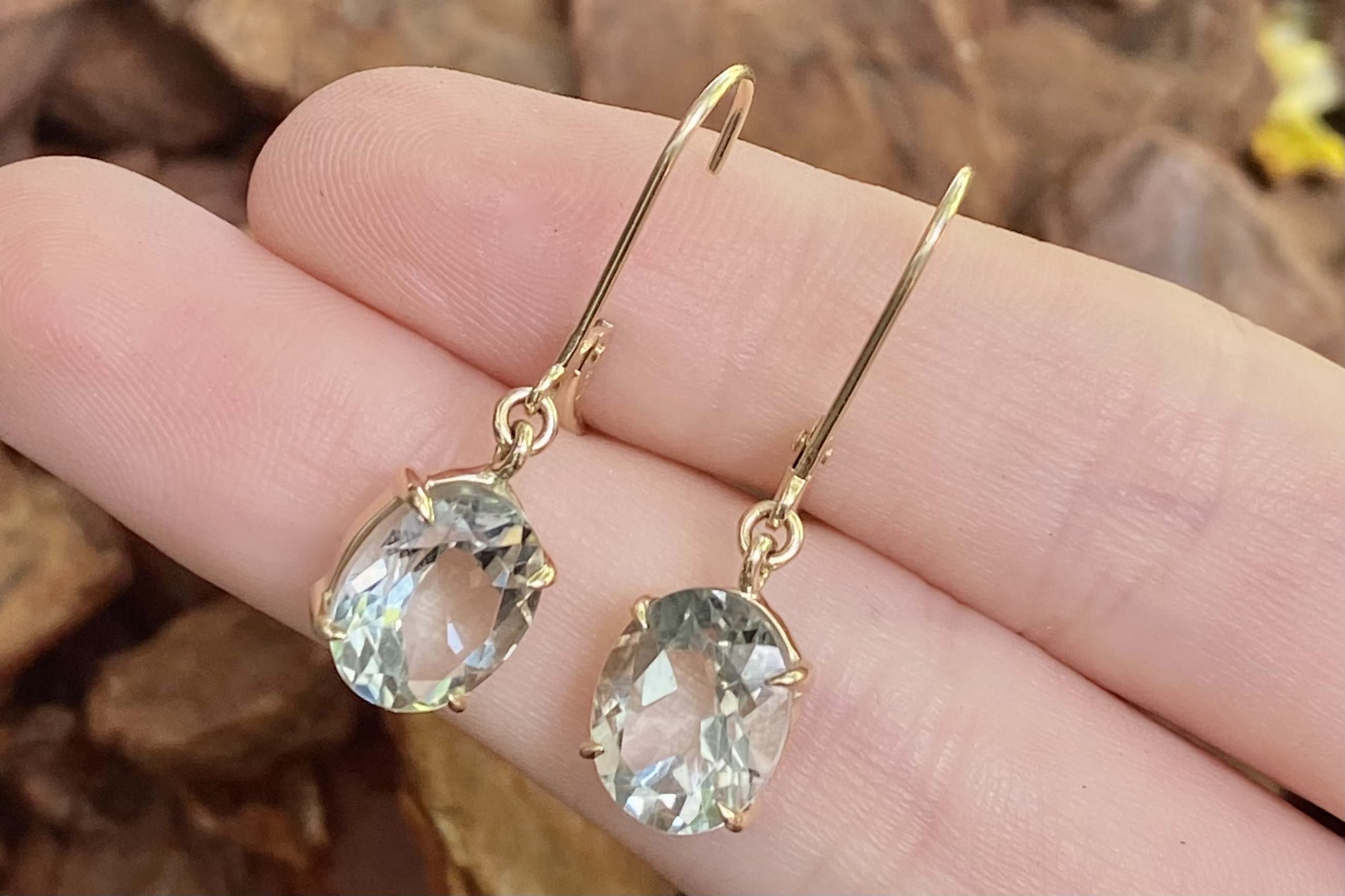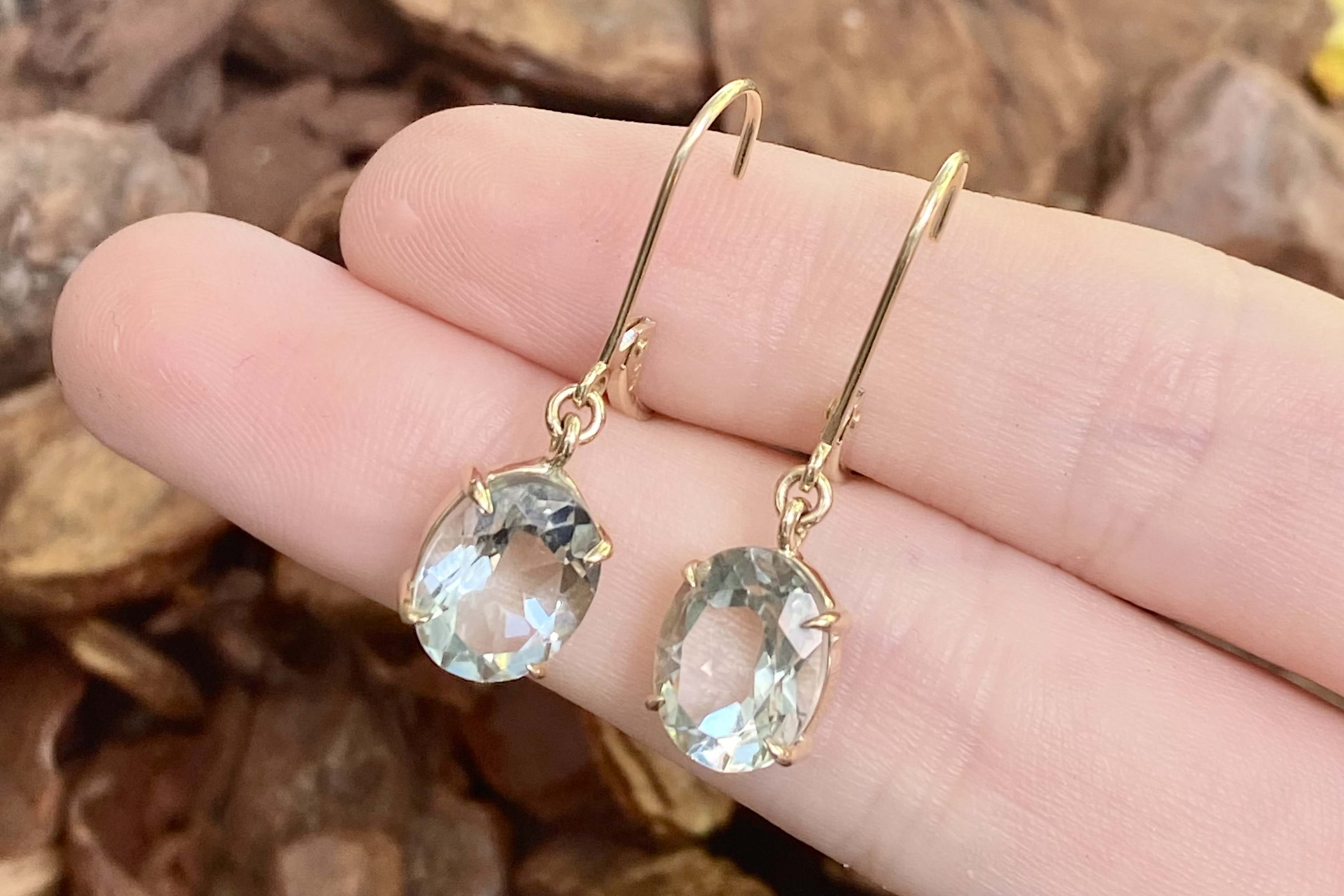 Beautiful oval shaped prasiolite drops, measuring 10.0x8.0mm, bezel set in 9ct yellow gold. Completed with secure euroclip fittings.