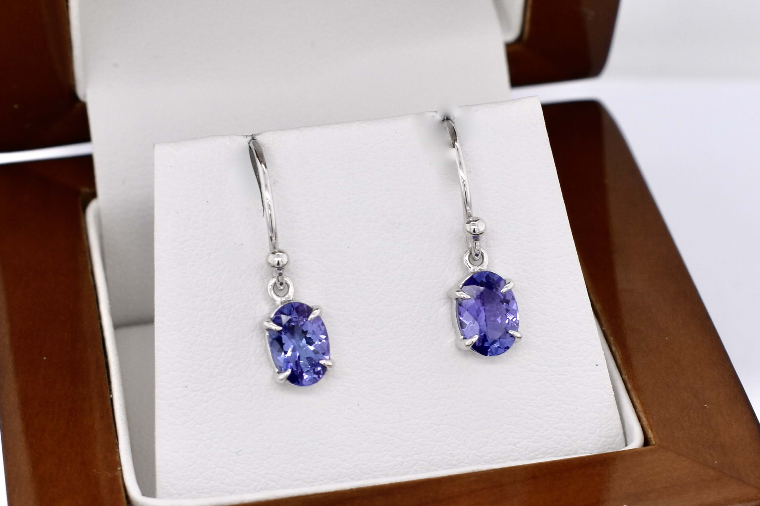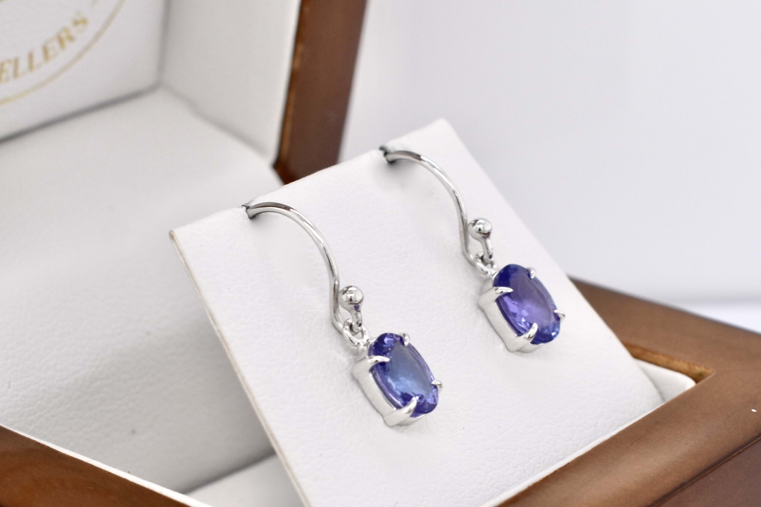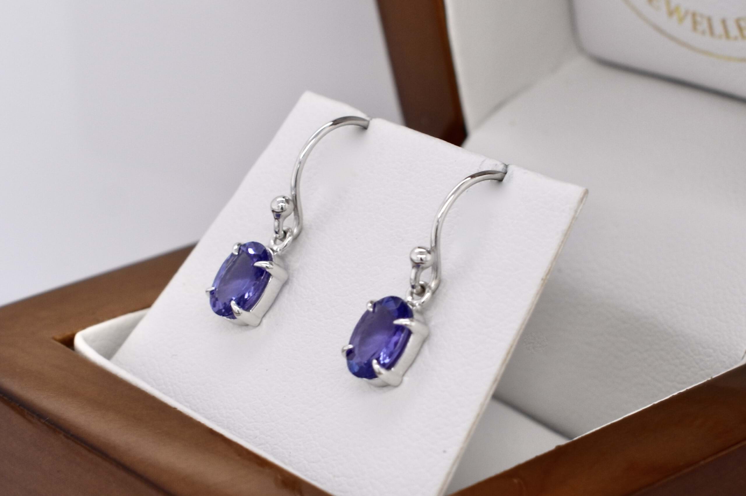 A lovely pair of matched oval 6.4x5.2mm tanzanites, four claw set in handmade 9ct white gold drop earrings, with shepherd hook fittings.