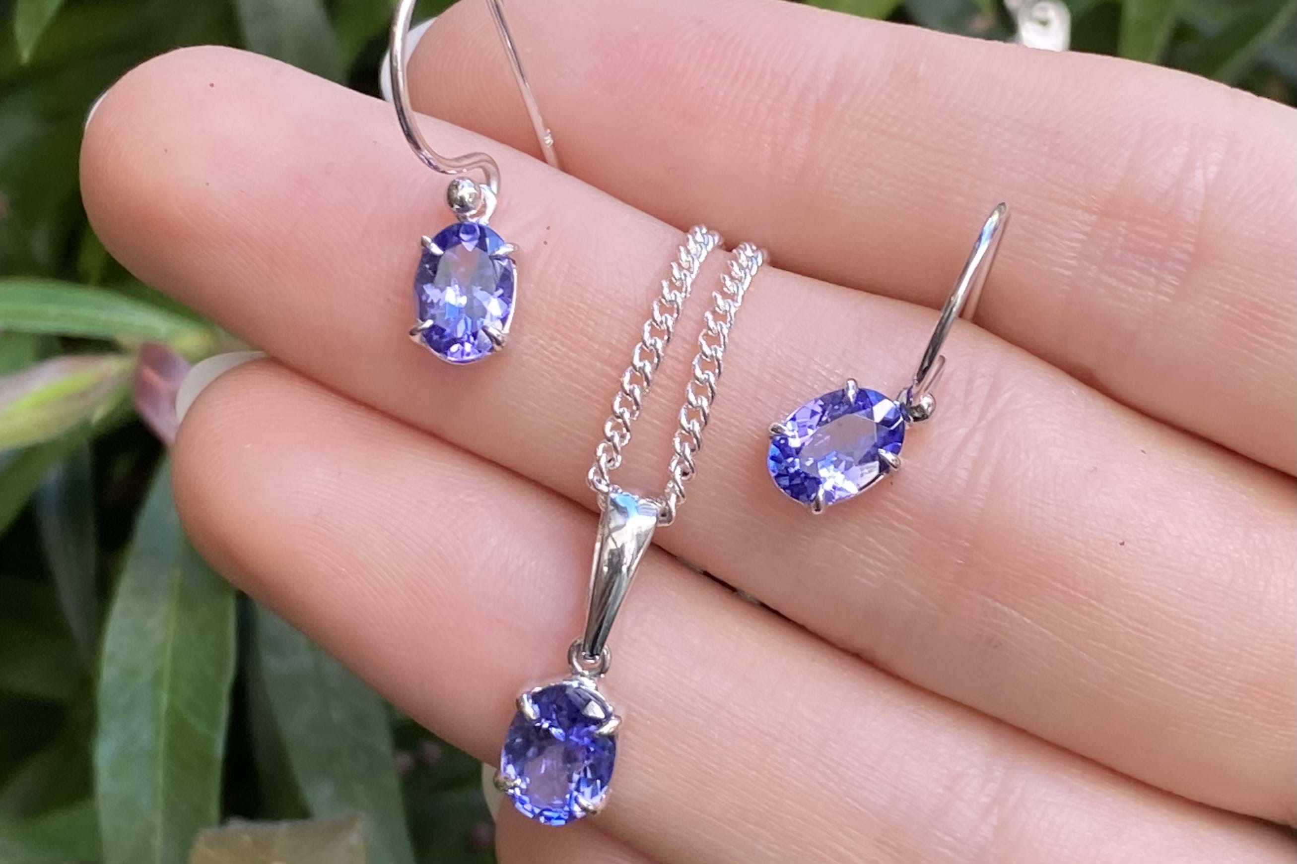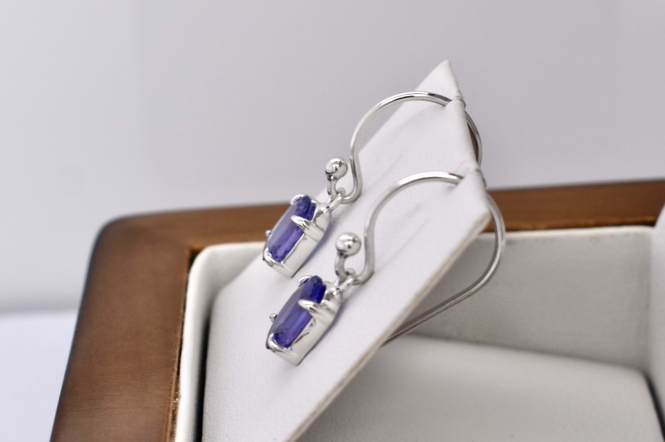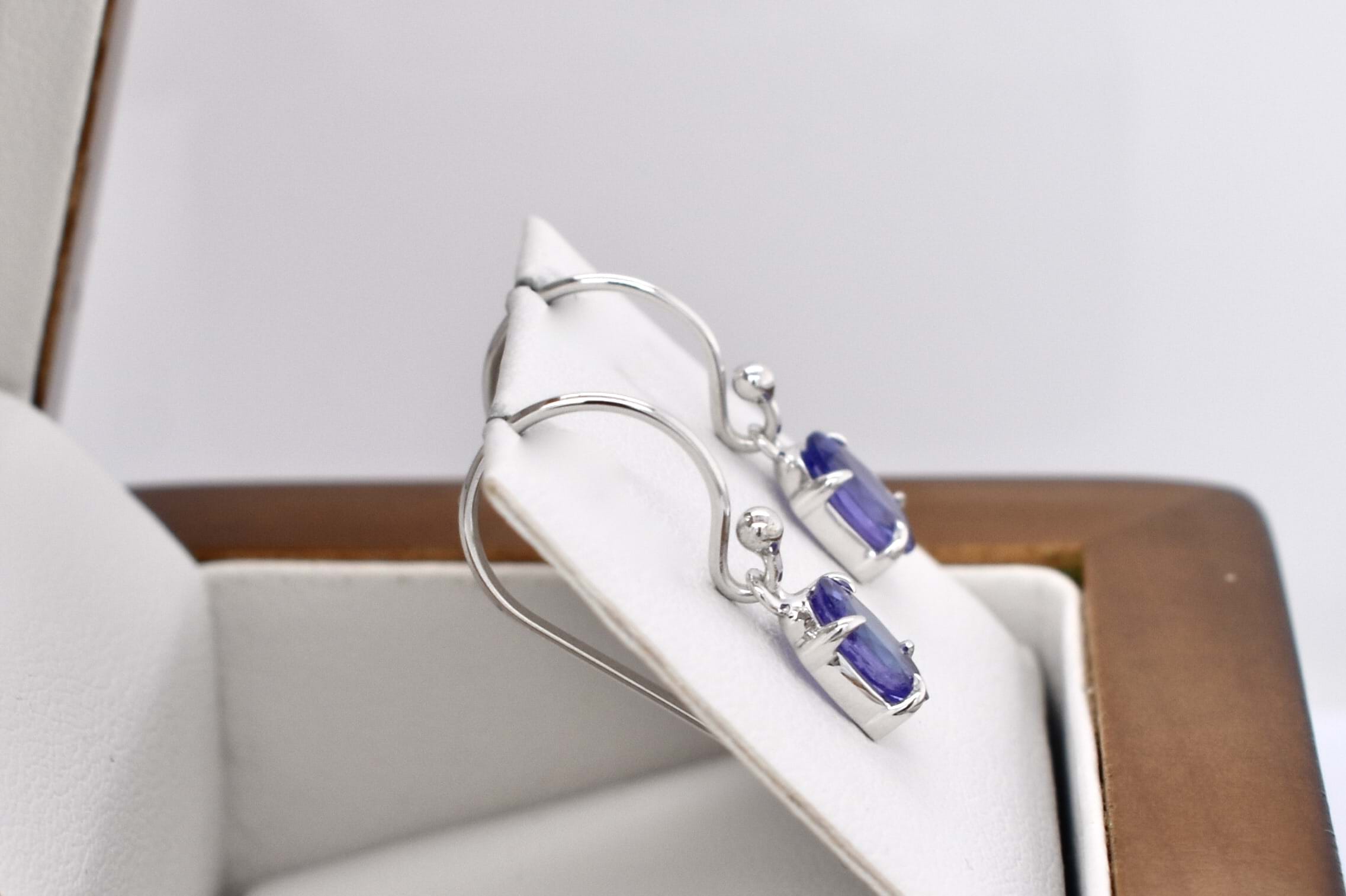 A lovely pair of matched oval 6.4x5.2mm tanzanites, four claw set in handmade 9ct white gold drop earrings, with shepherd hook fittings.