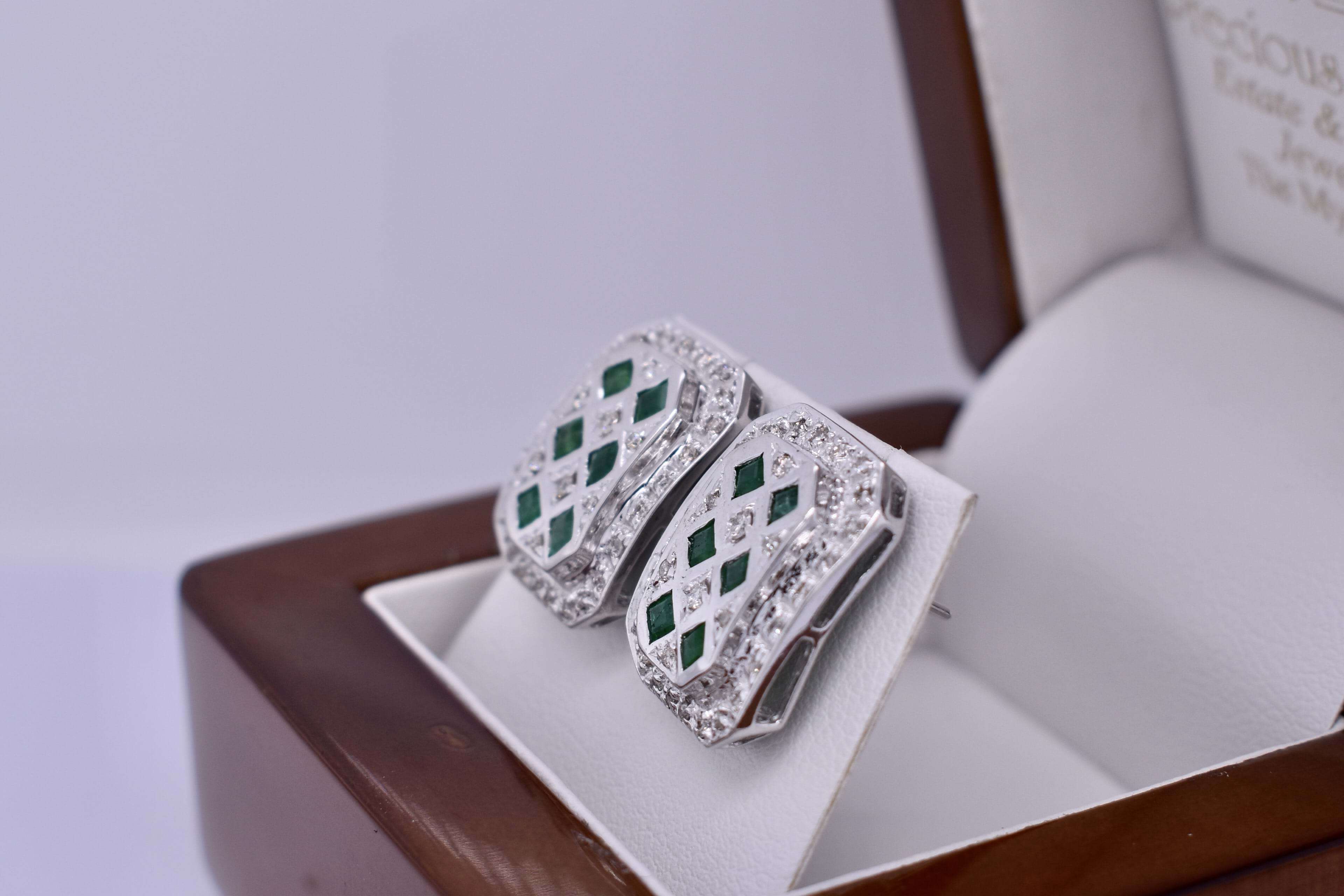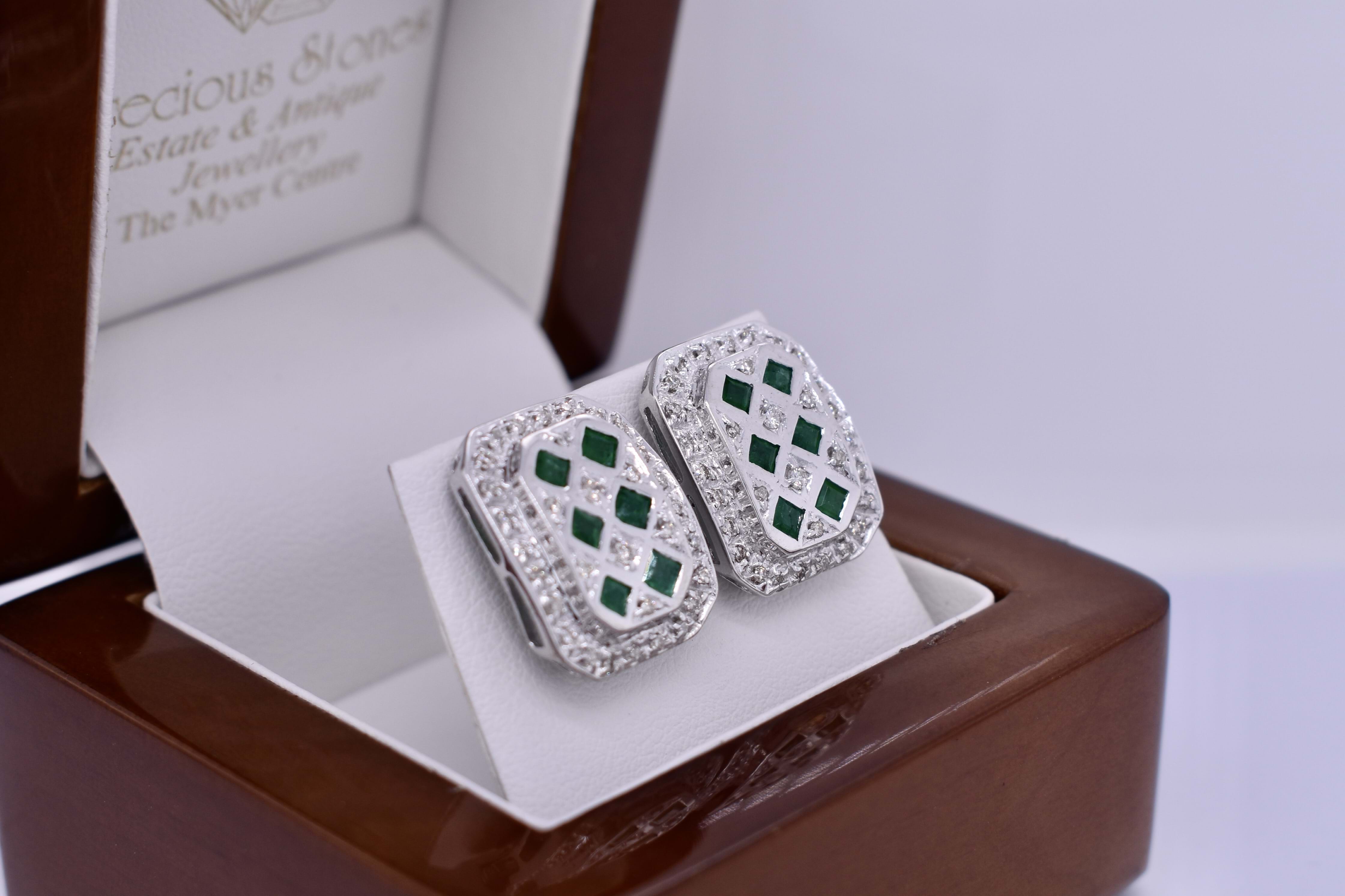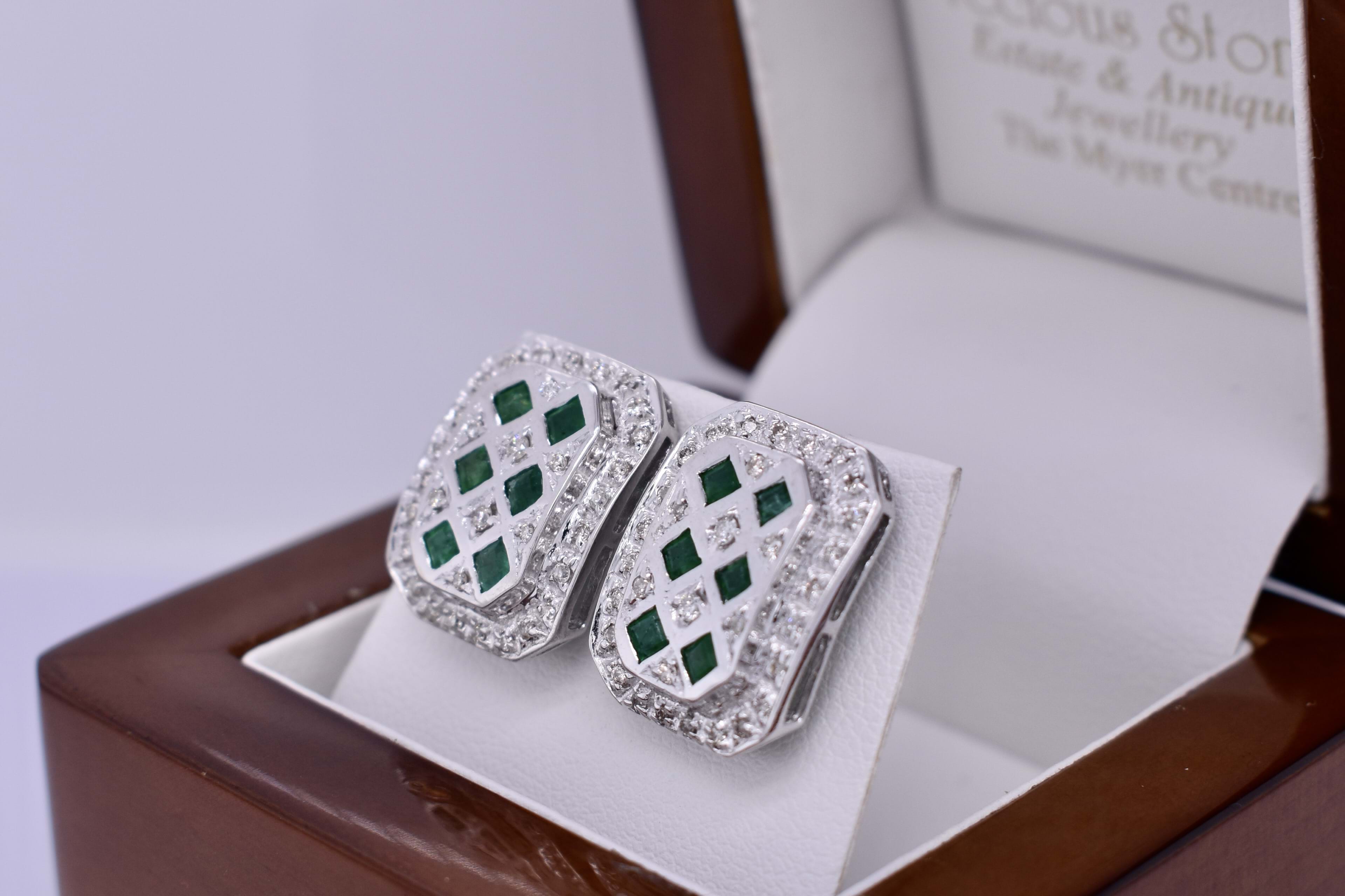 Fabulous and fun, these 14ct white gold criss-cross diagonal emerald and diamond earrings, featuring 12 square bright mid green 2.4-2.2mm emeralds, diagonally bezel set alternating with round brilliant cut diamonds. Surrounded by a boarder set with more round brilliant cut diamonds, a total of 64 diamonds measuring 1.5-1.1mm and equalling 0.44ct H-L S1-P1. Earrings are a slightly curved emerald cut shape, 17.7x14.4mm, with post and butterfly fittings as well as a concealed hook which can be used to hang additional pearls/drops from allowing for great versatility. Independent Valuation Supplied.