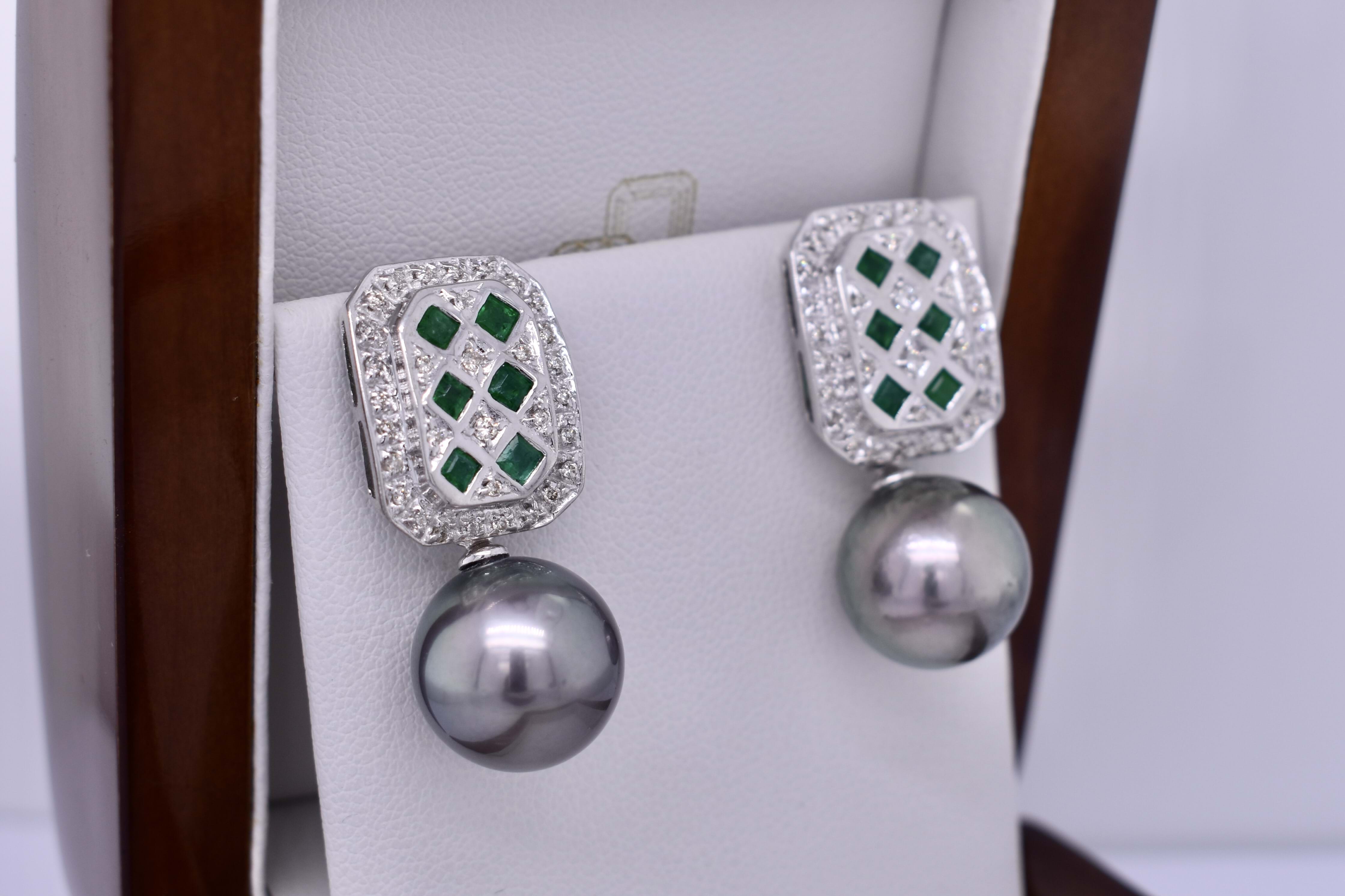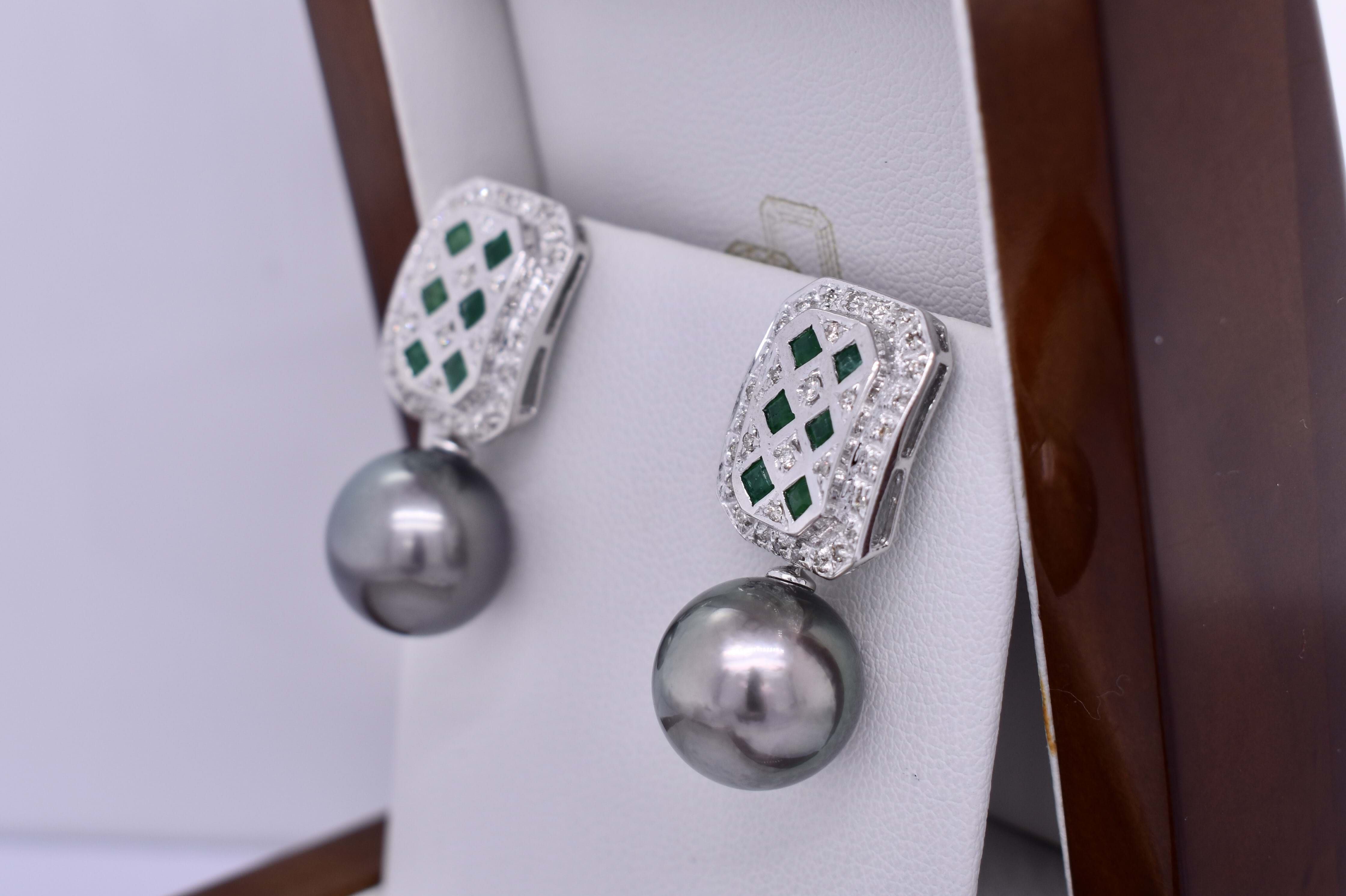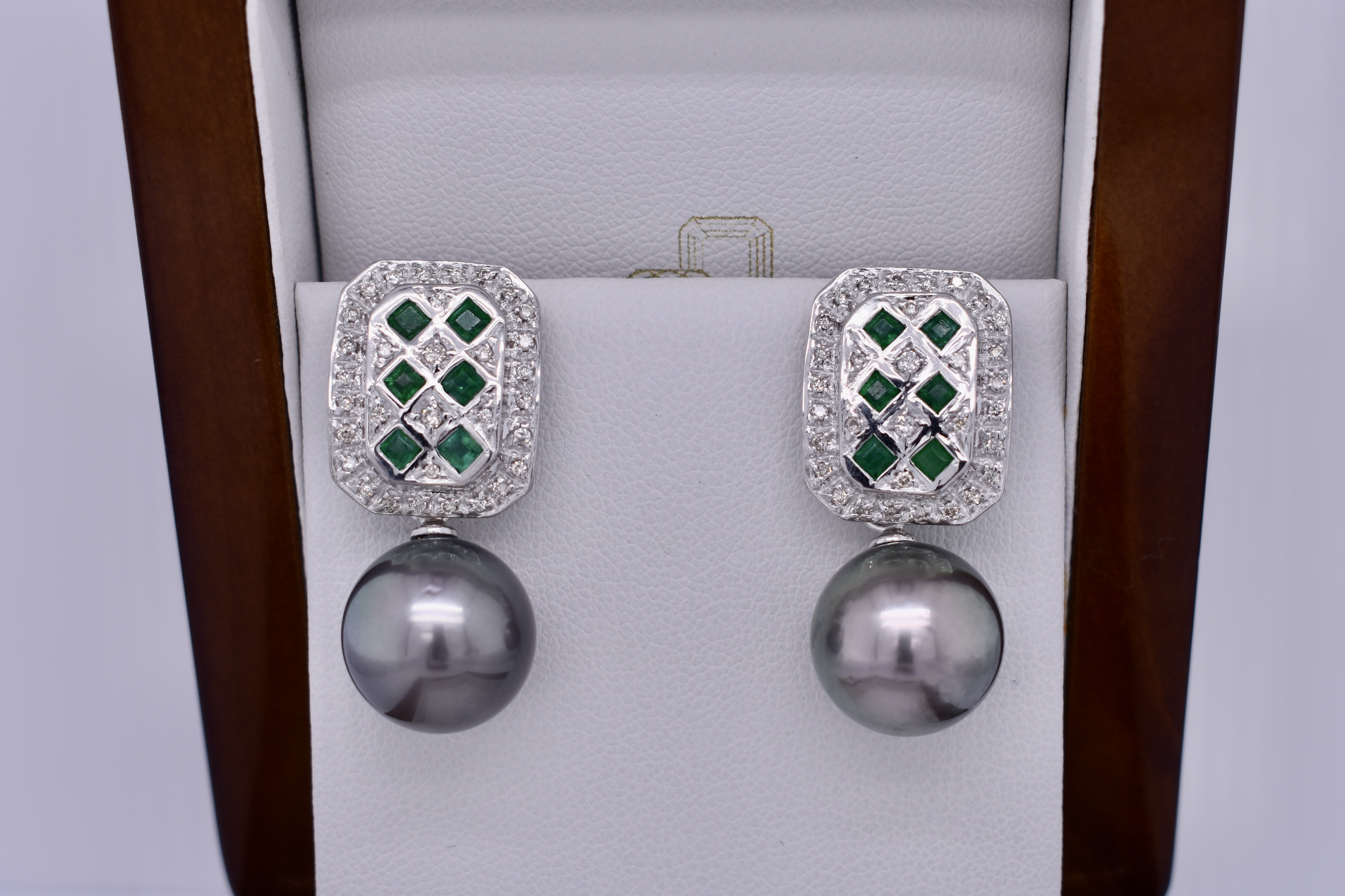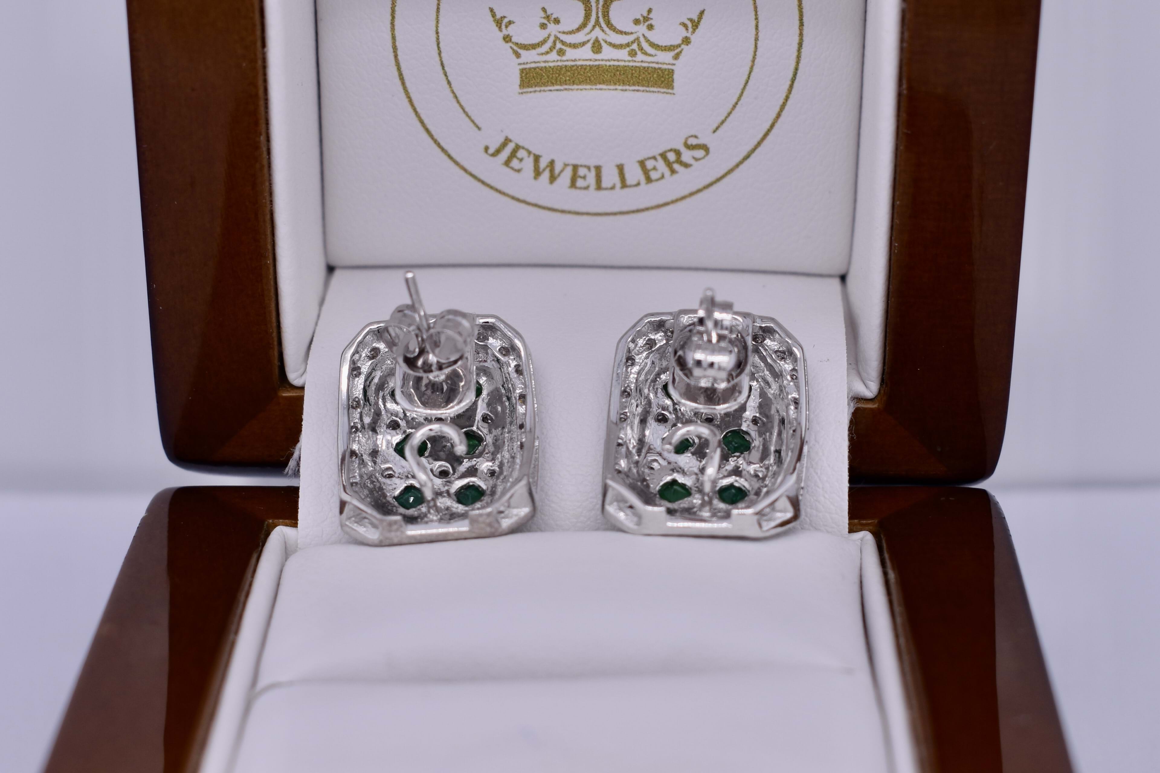 Fabulous and fun, these 14ct white gold criss-cross diagonal emerald and diamond earrings, featuring 12 square bright mid green 2.4-2.2mm emeralds, diagonally bezel set alternating with round brilliant cut diamonds. Surrounded by a boarder set with more round brilliant cut diamonds, a total of 64 diamonds measuring 1.5-1.1mm and equalling 0.44ct H-L S1-P1. Earrings are a slightly curved emerald cut shape, 17.7x14.4mm, with post and butterfly fittings as well as a concealed hook which can be used to hang additional pearls/drops from allowing for great versatility. Independent Valuation Supplied.