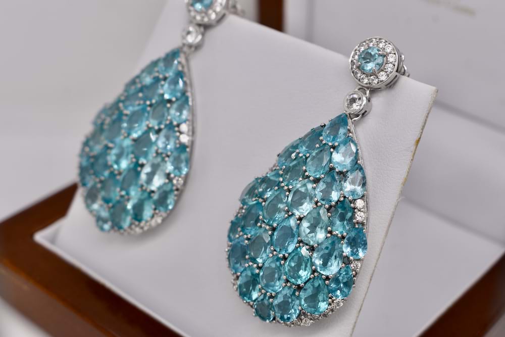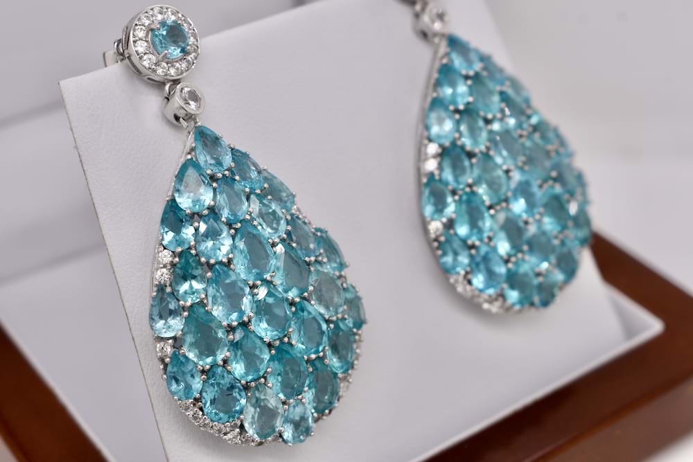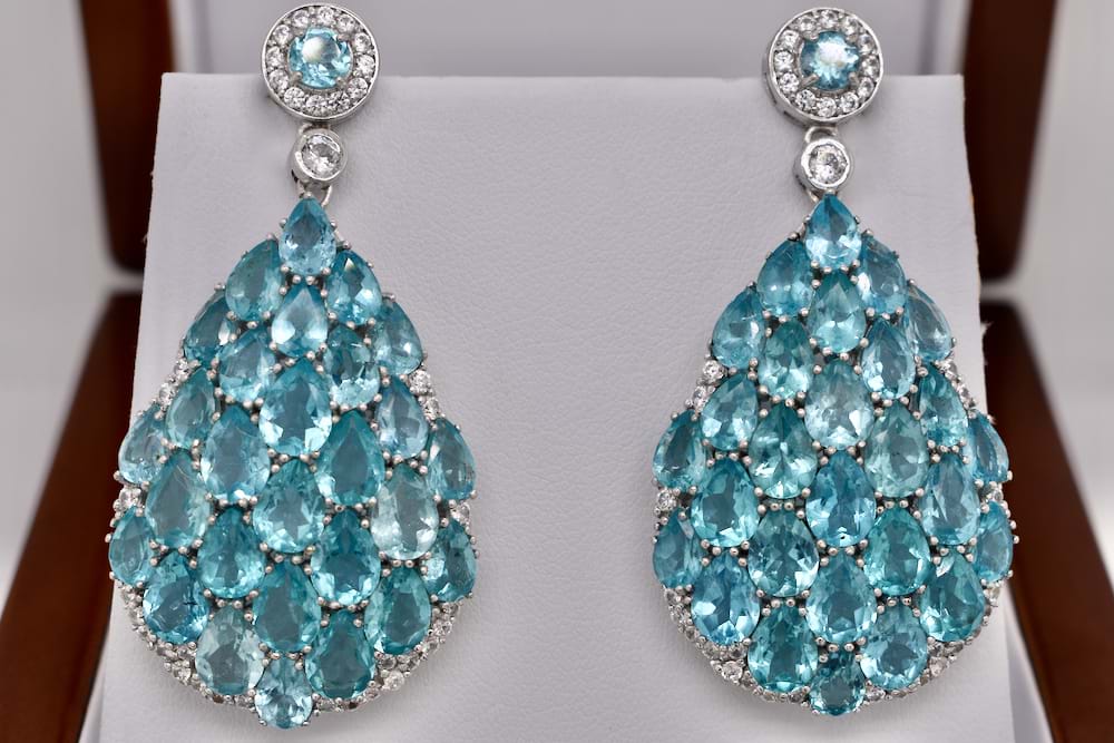Absolutely stunning! This epic collection of sea-blue apatite has been set into a large teardrop cluster suspended from a single apatite stud with a halo of shimmering cubic zirconia's. Crafted in sterling silver these breathtakingly blue cocktail earrings have a colour reminiscent of Paraiba tourmalines and are certain to attract attention and spark comments. Independent Valuation supplied