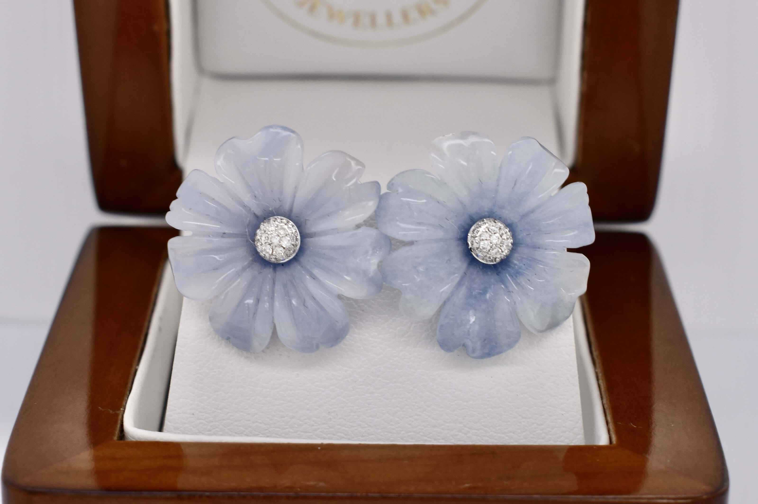 SOLD 18ct White Gold 0.13ct FG SI Diamond Studs with Carved Blue Jade Flower Jackets