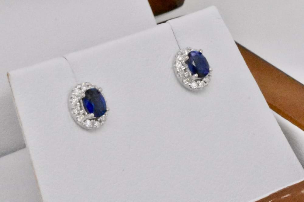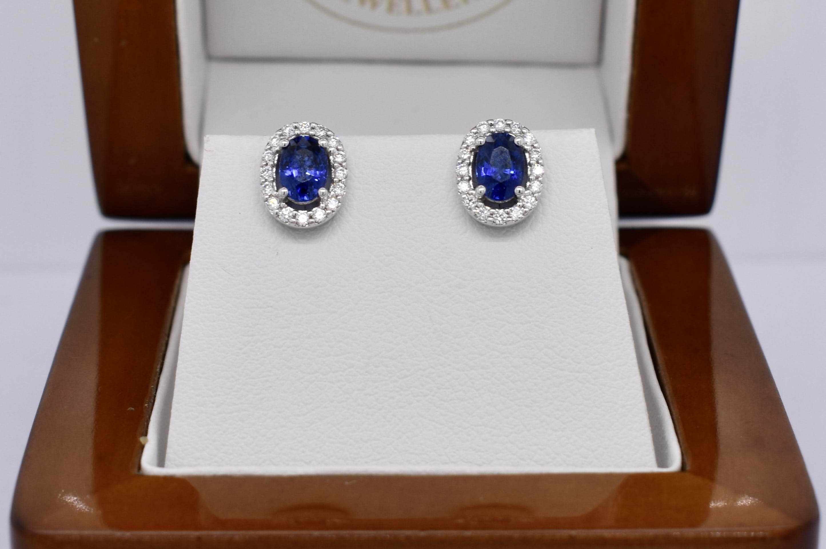 SOLD 18ct White Gold 1.14ct Sri Lankan Blue Sapphire & 0.21ct Diamond Halo Studs