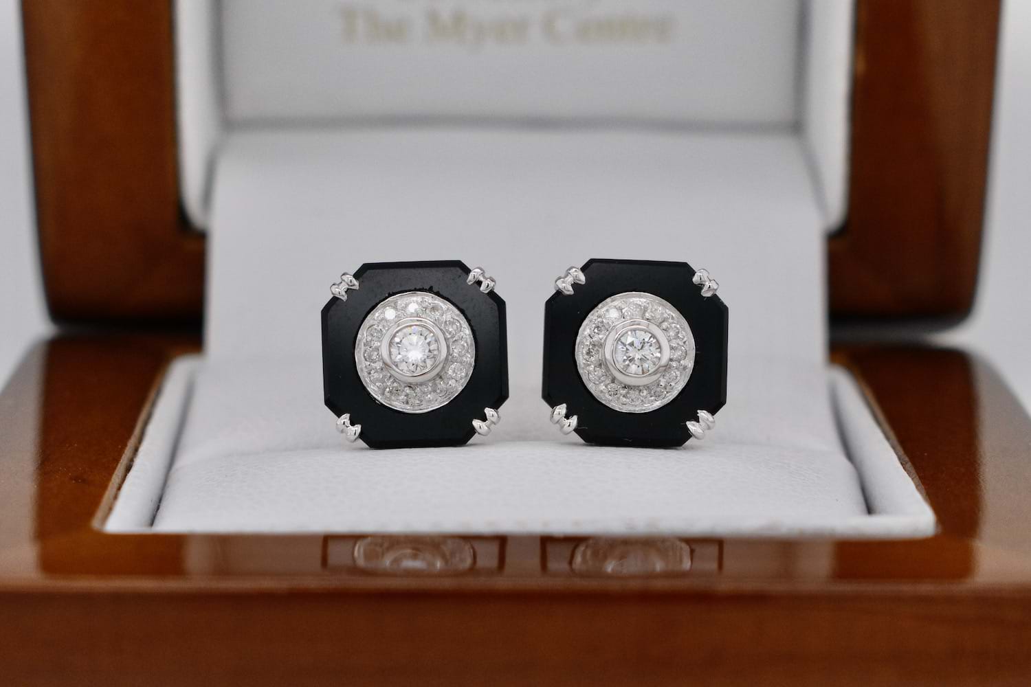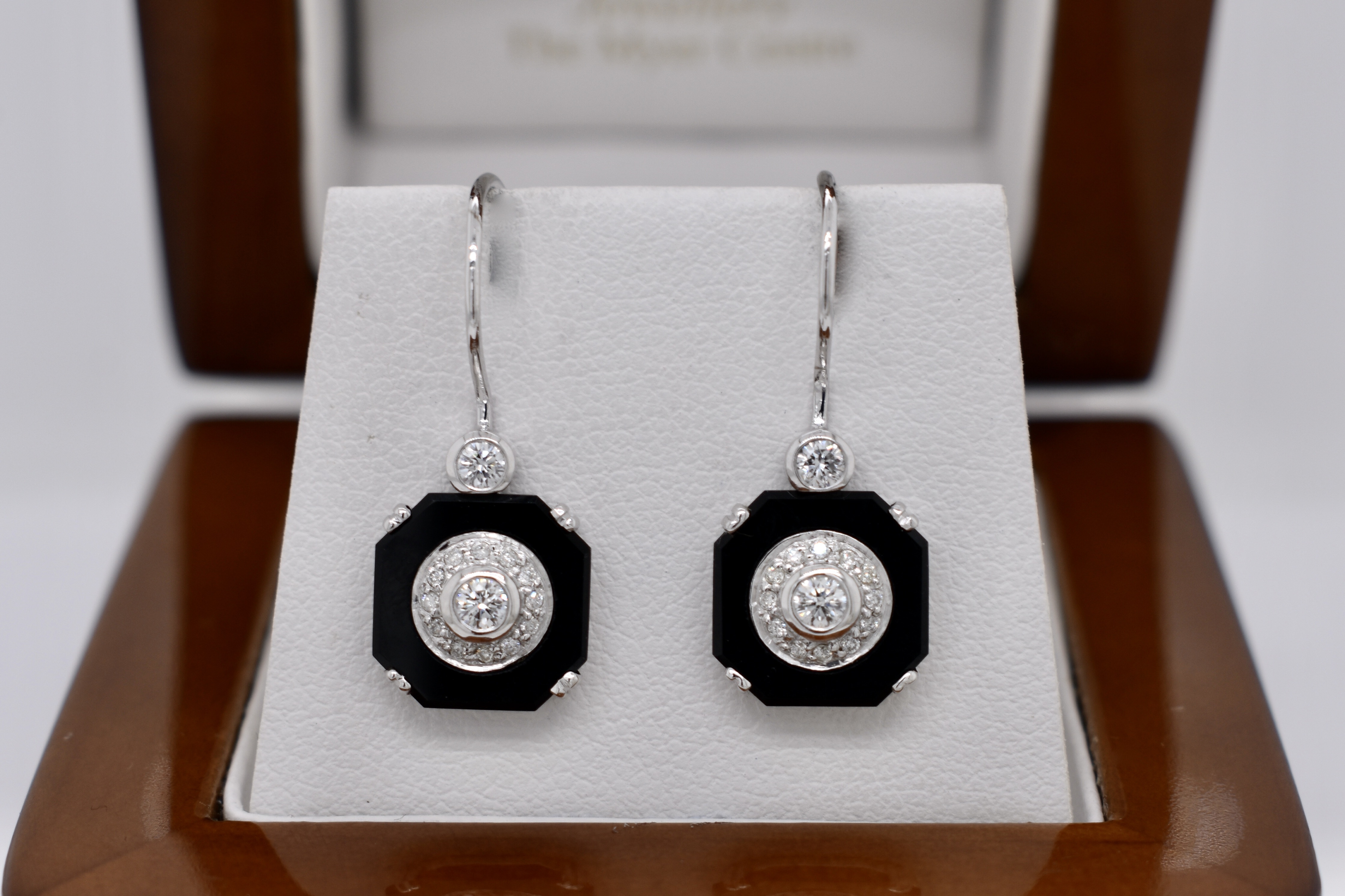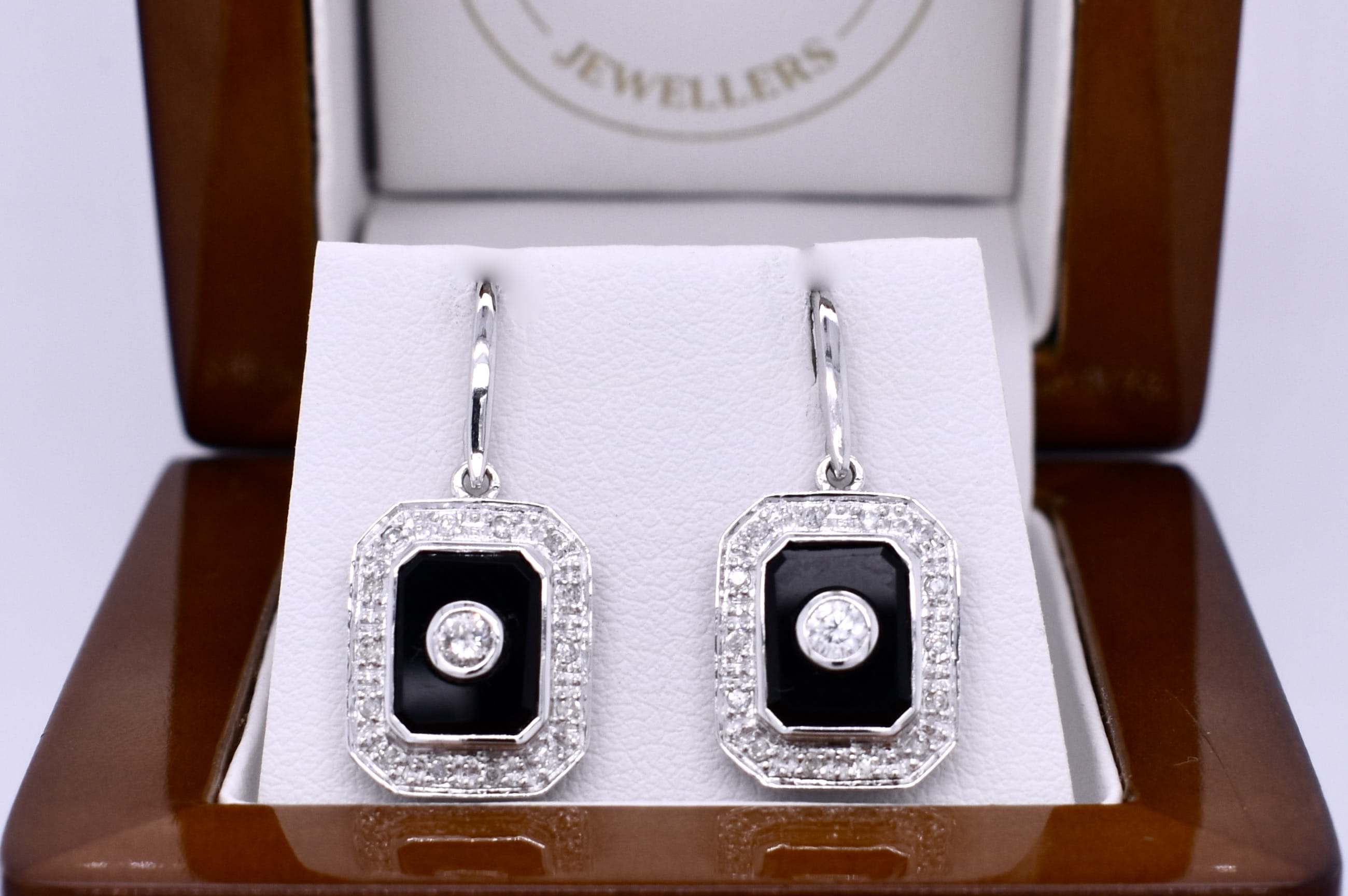SOLD 9ct White Gold Onyx & Diamond Deco Style Drop Earrings