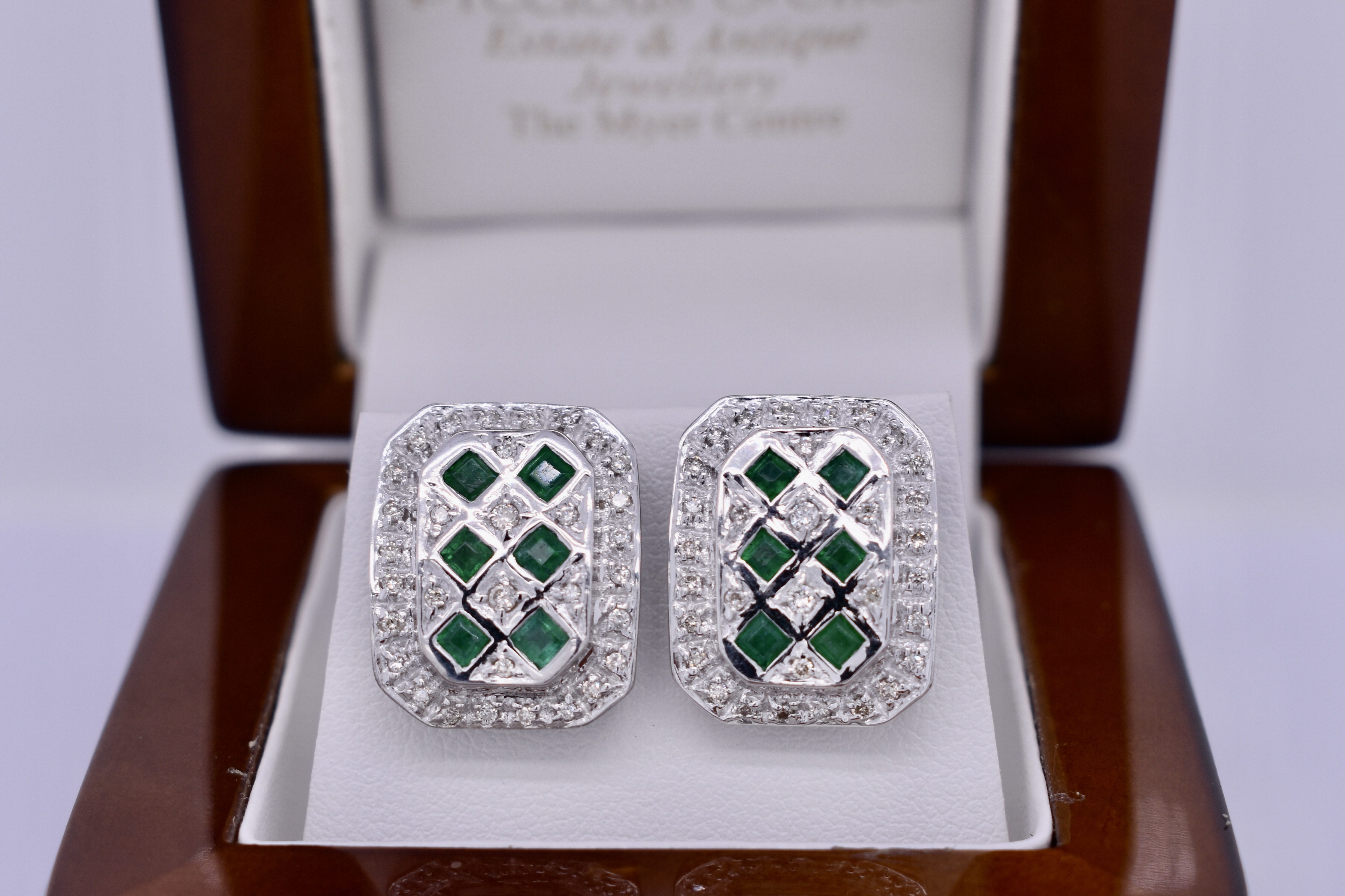 SOLD 18 & 9ct White Gold 1.00ct Emerald & Diamond Earrings