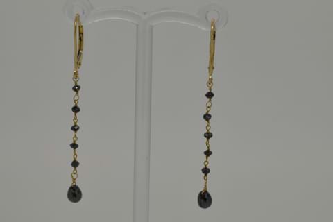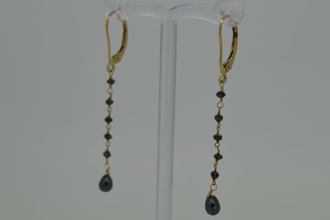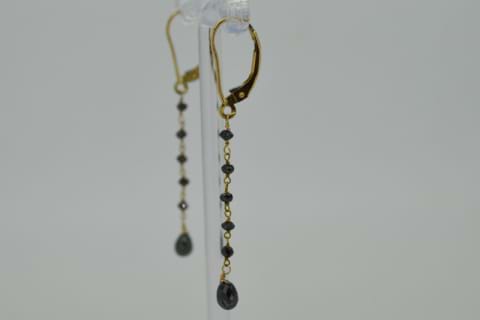 These streamline and elegant 14ct yellow gold fine chain drop earrings feature five faceted black diamond beads and a singular faceted teardrop at the base.